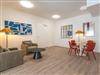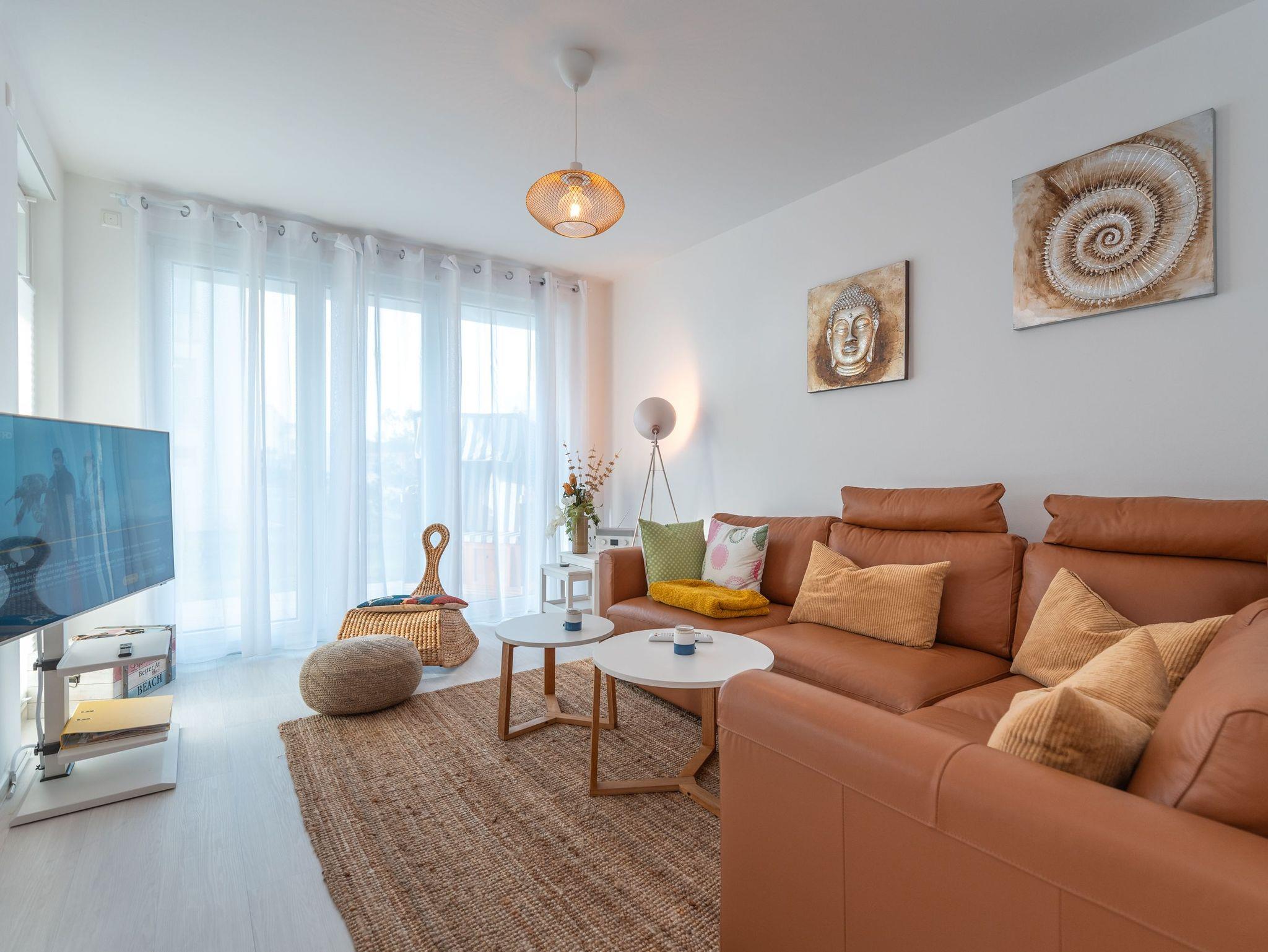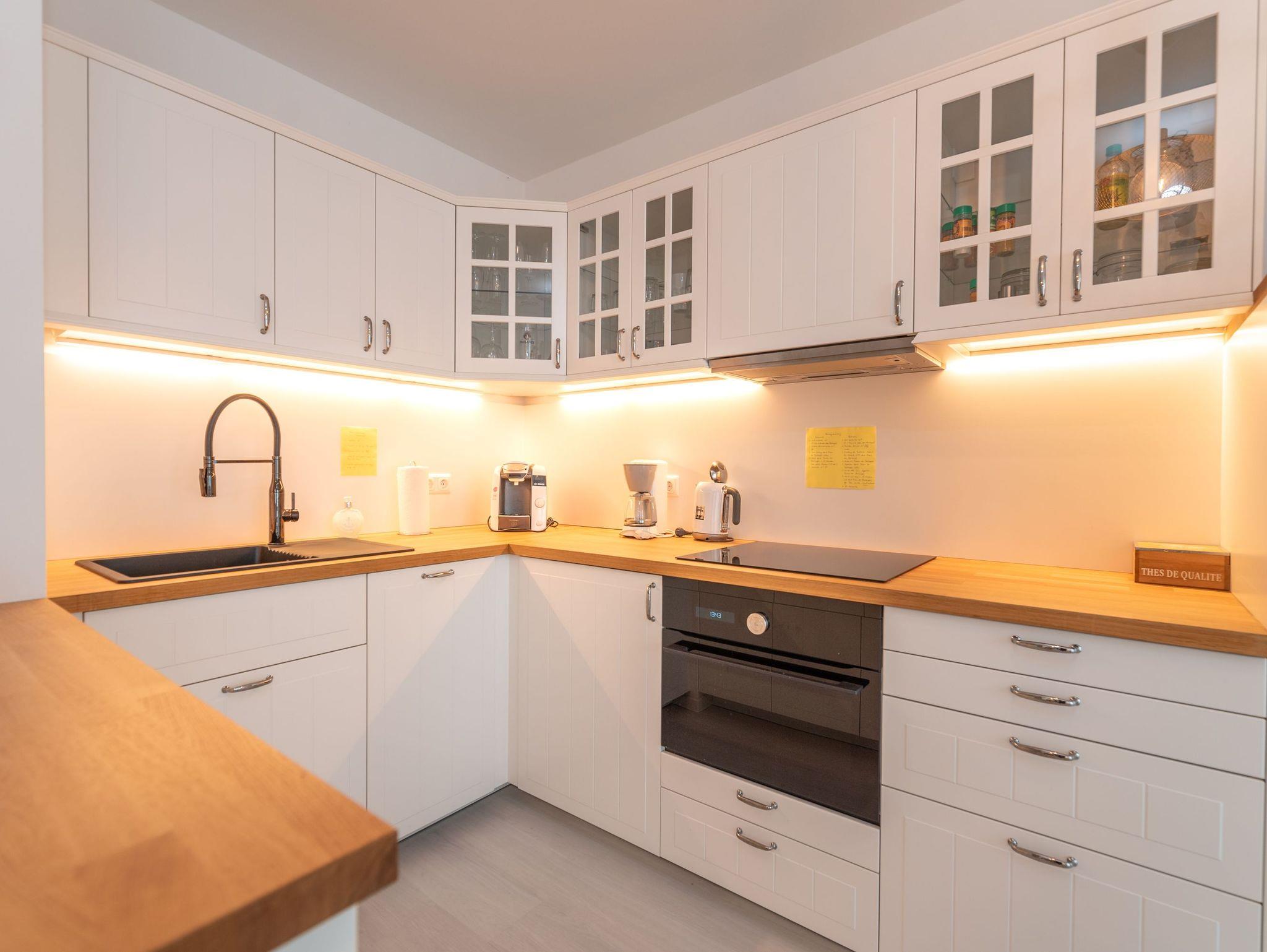 Das Herzstück der Wohnung ist der Wohn-/Essbereich mit einer voll ausgestatteten offenen Küche, die über ein Induktionskochfeld, eine Mikrowelle, einen Heißluftofen, einen Kühlschrank mit Gefrierfach und einen Geschirrspüler verfügt. Ein gemütlicher Essplatz mit vier Stühlen und eine bequeme Eckcouch laden zum Verweilen ein. Zur Unterhaltung stehen ein 50-Zoll-TV und ein Internetradio bereit. Die Couch kann bei Bedarf zu einem Schlafplatz (140 x 200 cm) umfunktioniert werden.