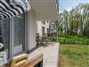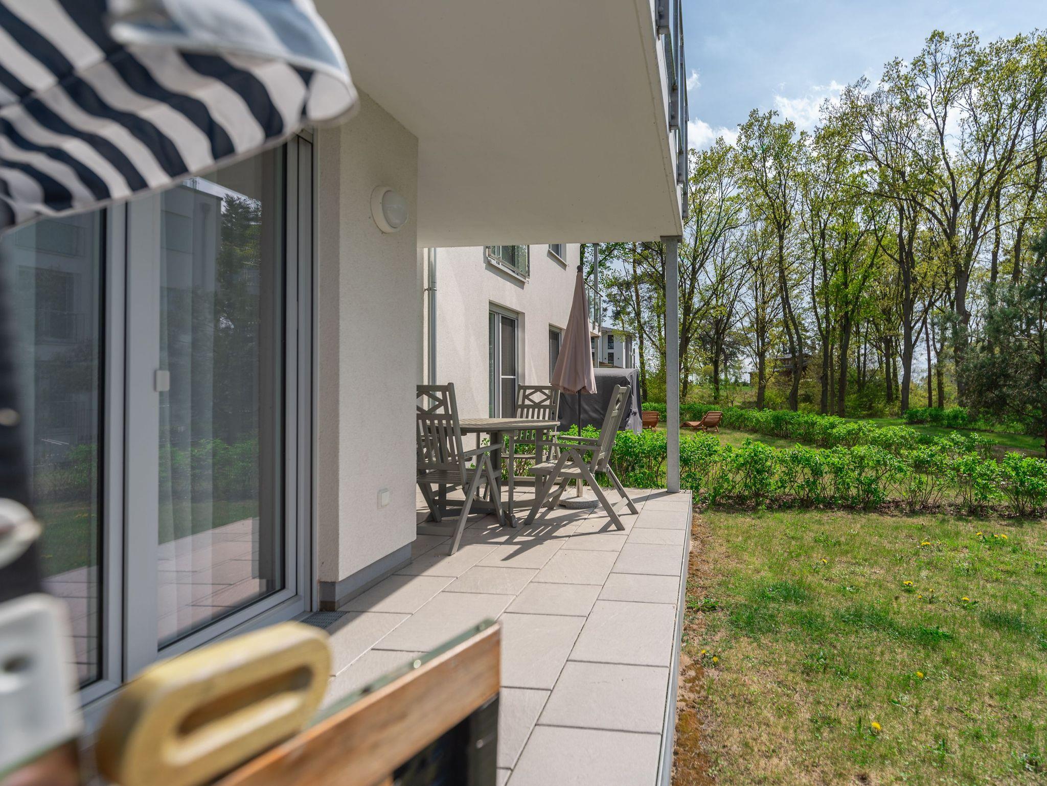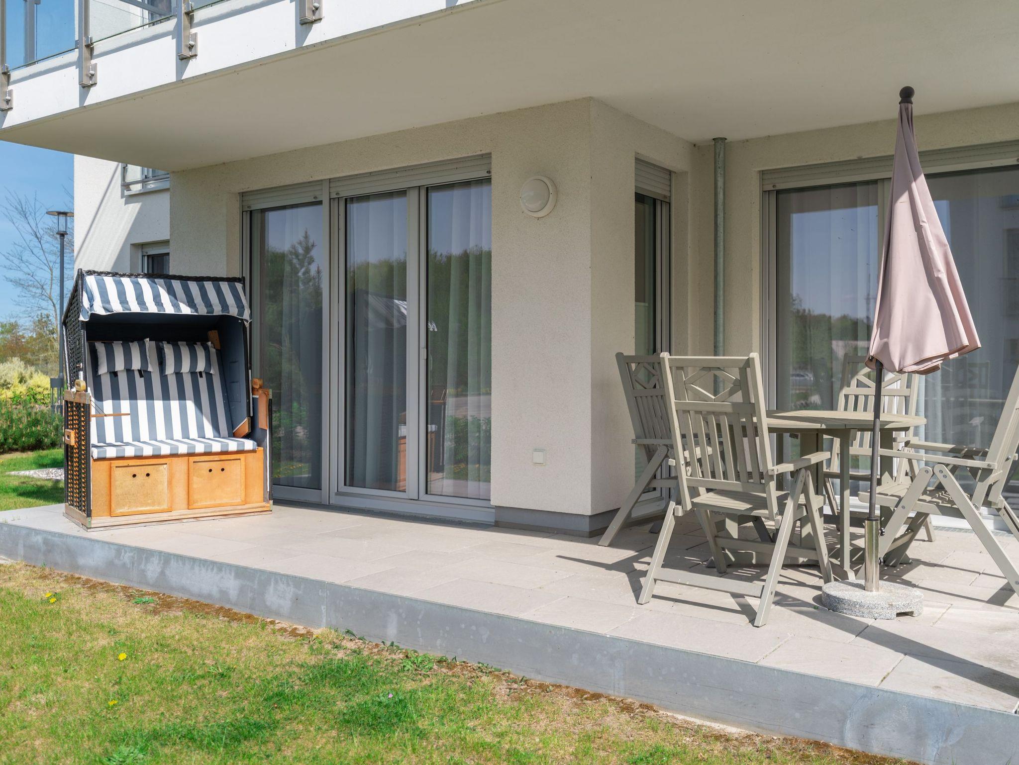 Die große West-Terrasse mit Strandkorb und Sitzgruppe sowie der dazugehörige Gartenanteil bieten viel Platz zum Entspannen im Freien.