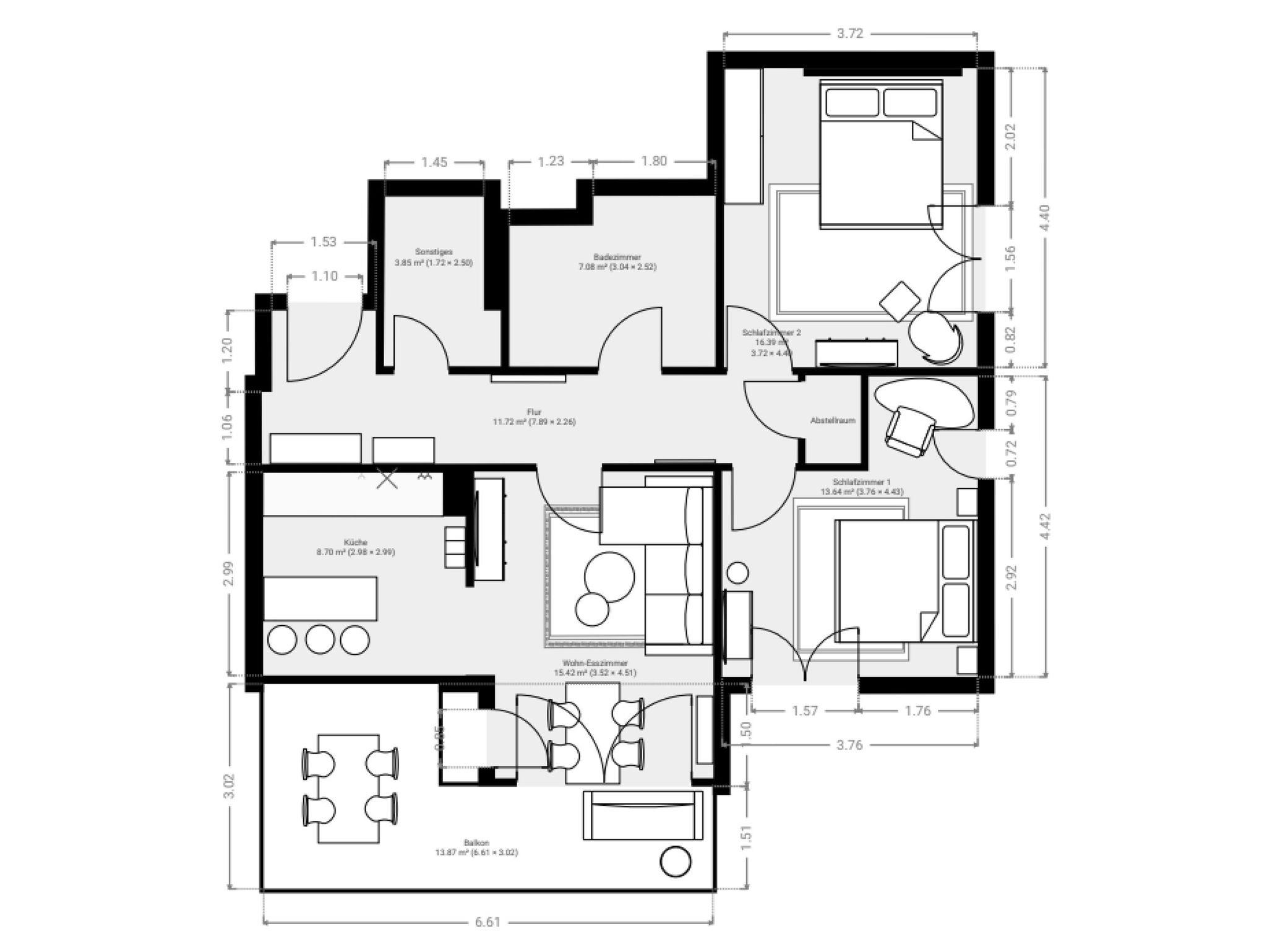 Der sonnige Balkon ist mit gemütlichen Sitzmöbeln und einer Loungeecke ausgestattet ideal für ein Frühstück im Freien oder einen entspannten Tagesausklang mit Blick ins Grüne. Dank des durchdachten Grundrisses genießen bis zu vier Personen höchsten Wohnkomfort perfekt für Paare oder kleine Familien.