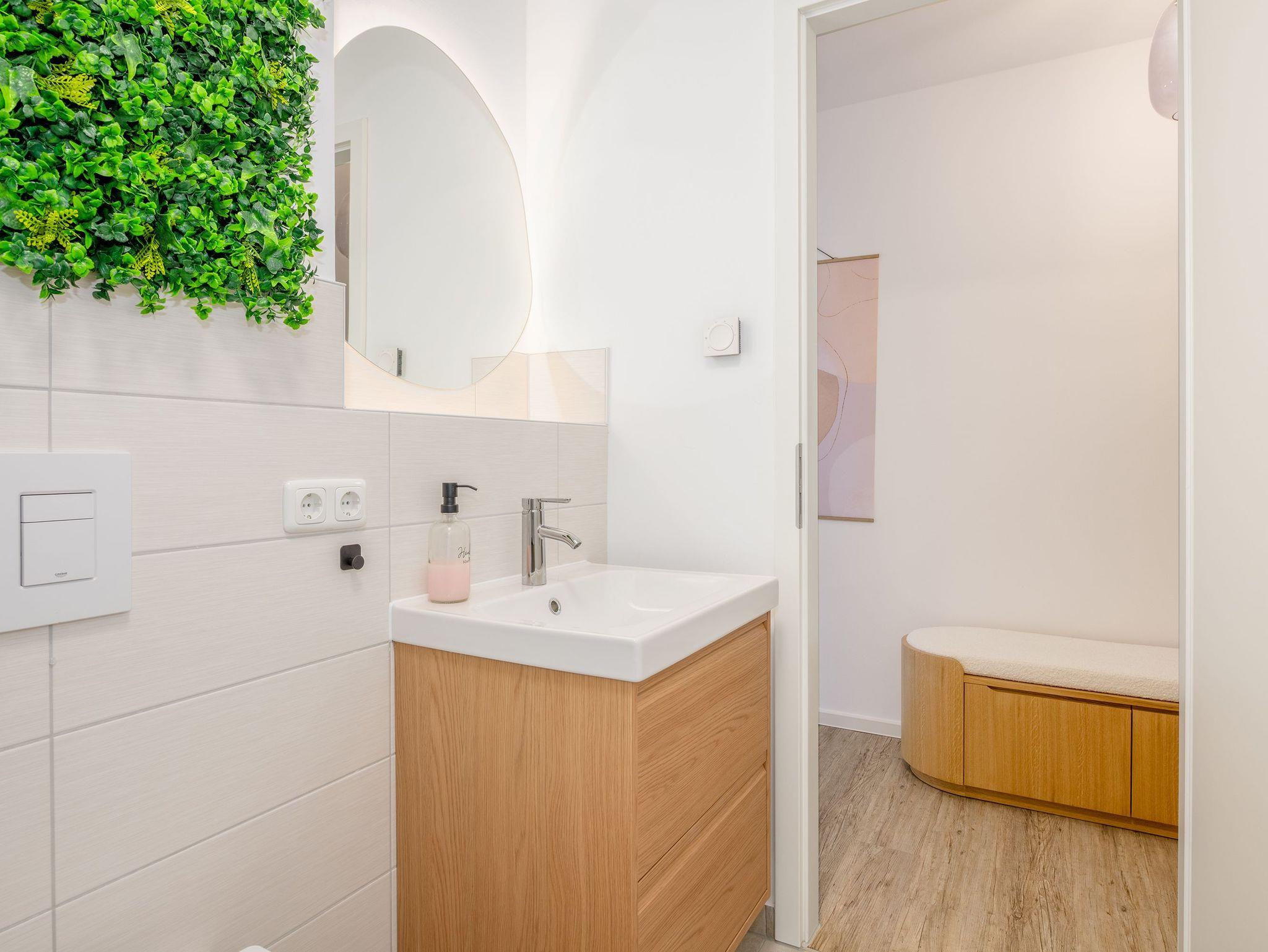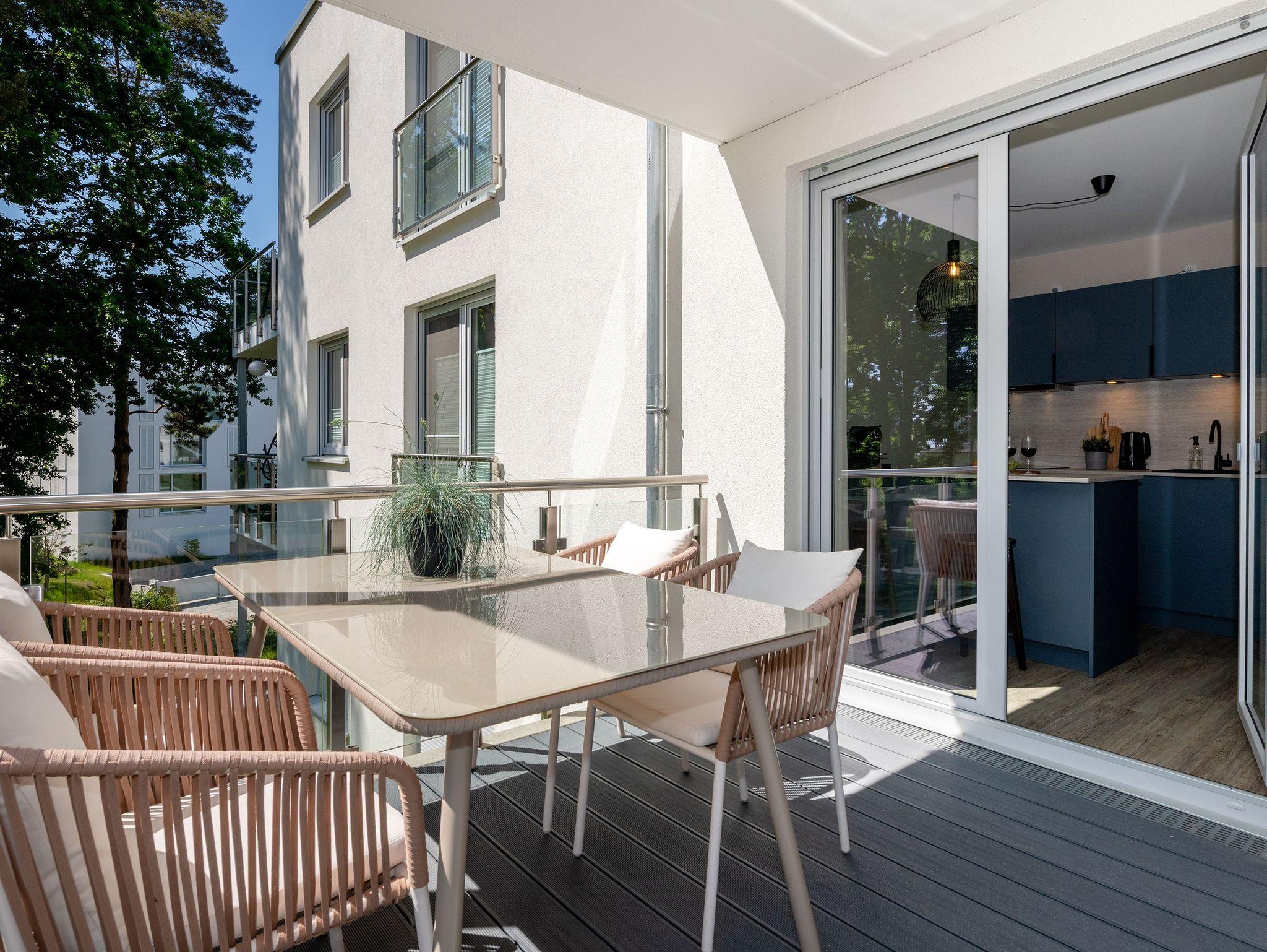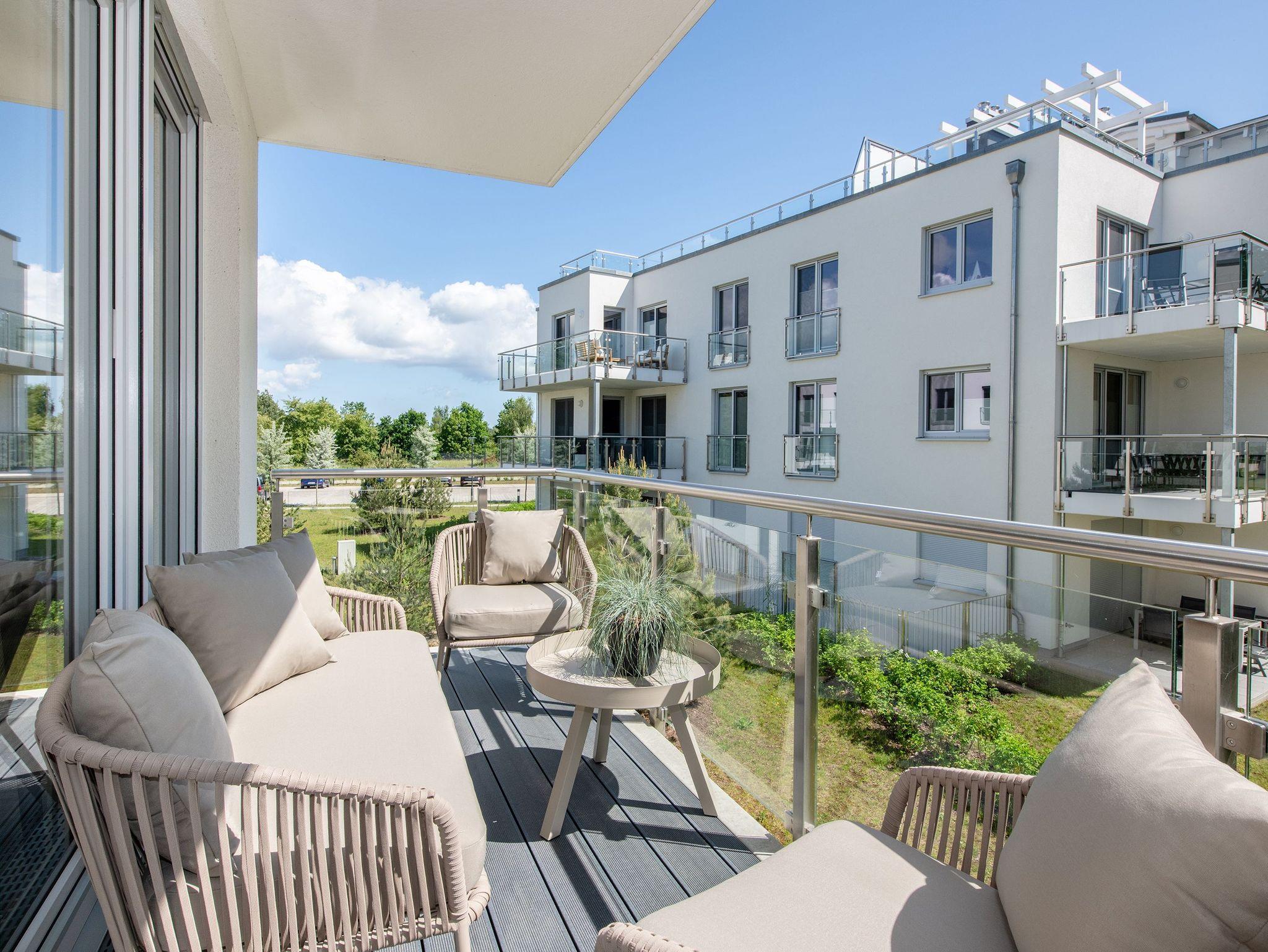 Der sonnige Balkon ist mit gemütlichen Sitzmöbeln und einer Loungeecke ausgestattet ? ideal für ein Frühstück im Freien oder einen entspannten Tagesausklang mit Blick ins Grüne. Dank des durchdachten Grundrisses genießen bis zu vier Personen höchsten Wohnkomfort ? perfekt für Paare oder kleine Familien.