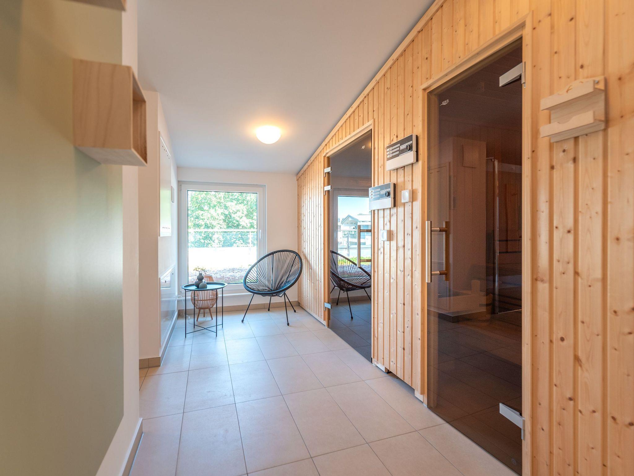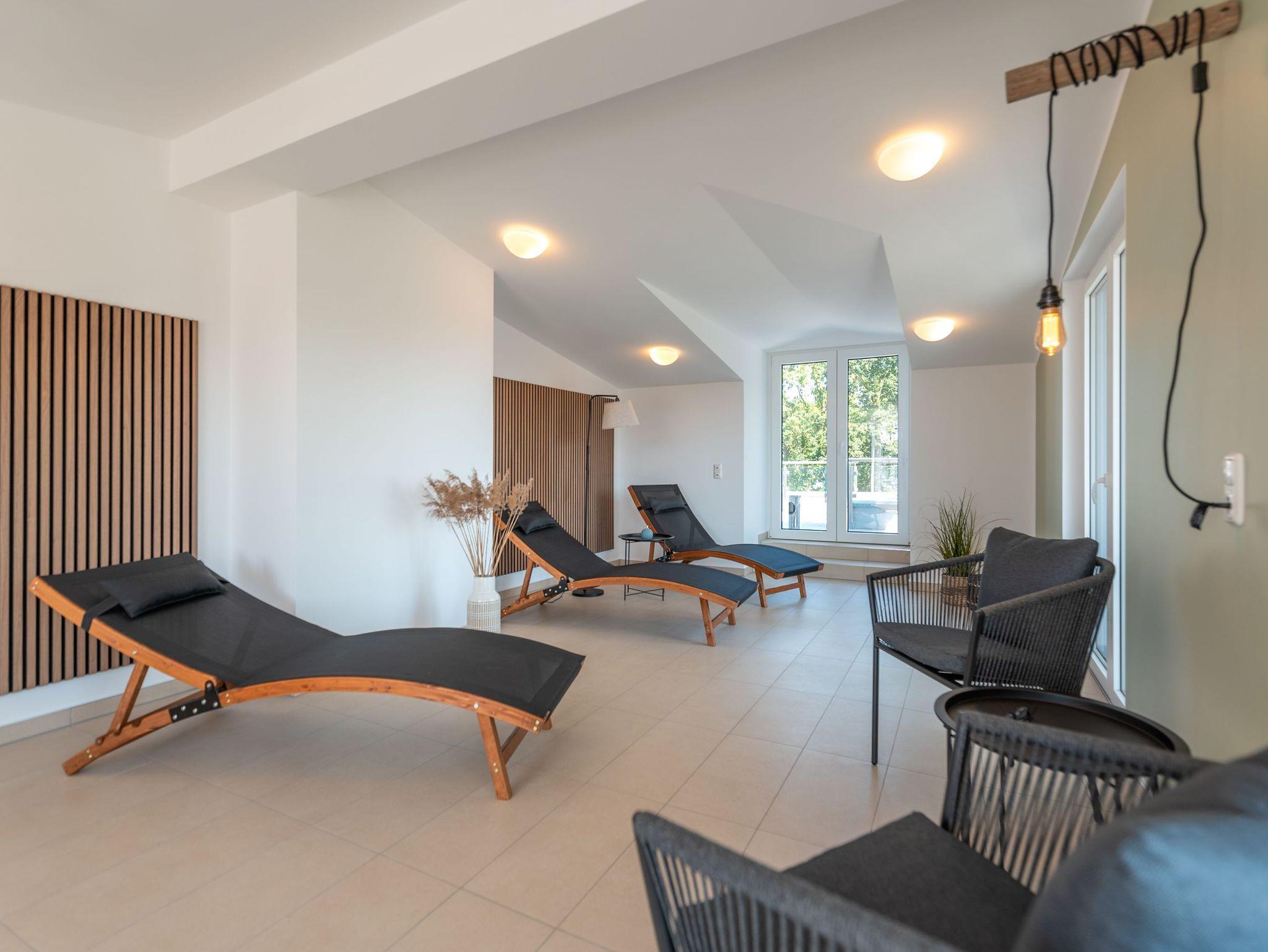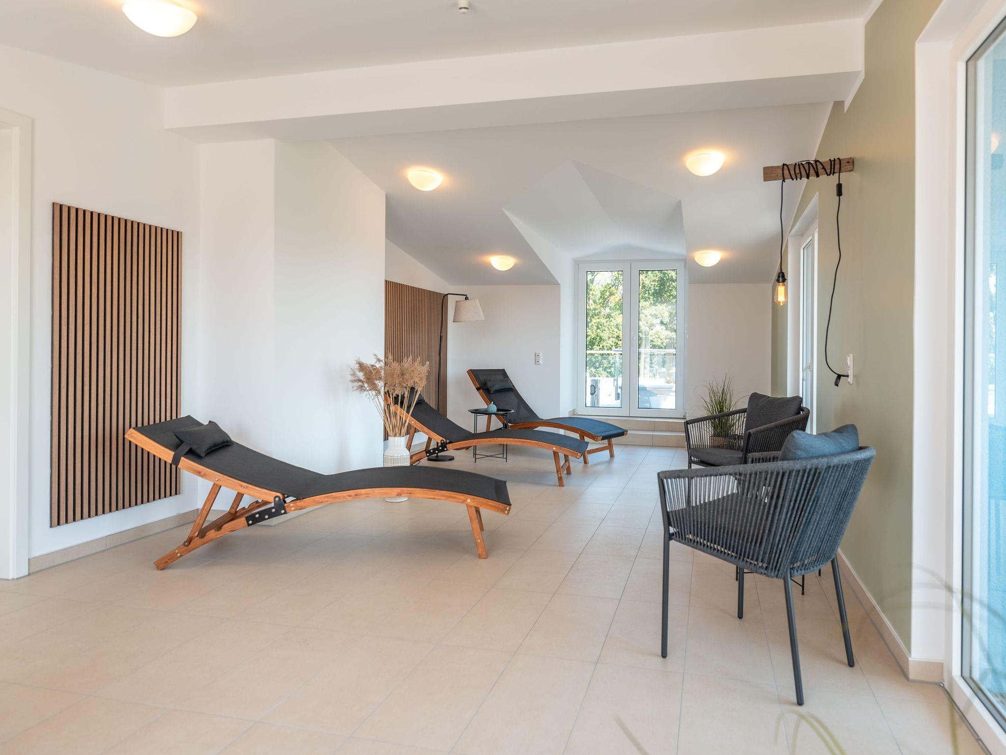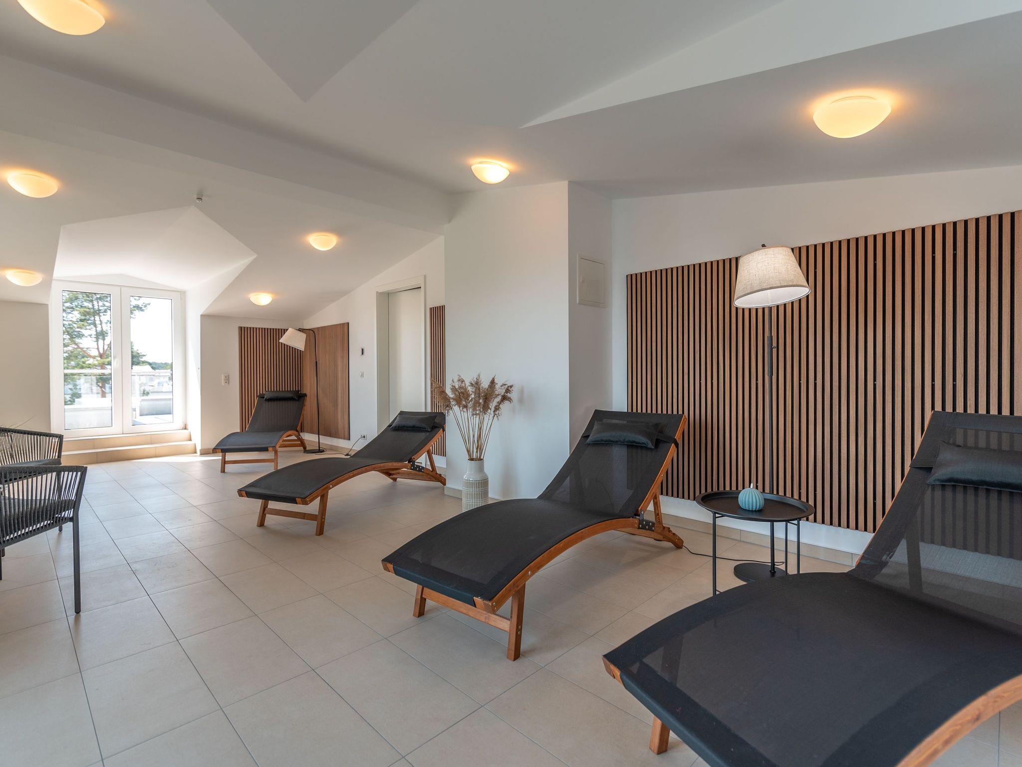 Ein echtes Highlight ist der hauseigene Wellnessbereich im Dachgeschoss: Drei Saunen, ein stilvoller Ruheraum und eine Dachterrasse mit Weitblick über das Stetiger Haff laden zum Entspannen ein ? und das ganz ohne Aufpreis.