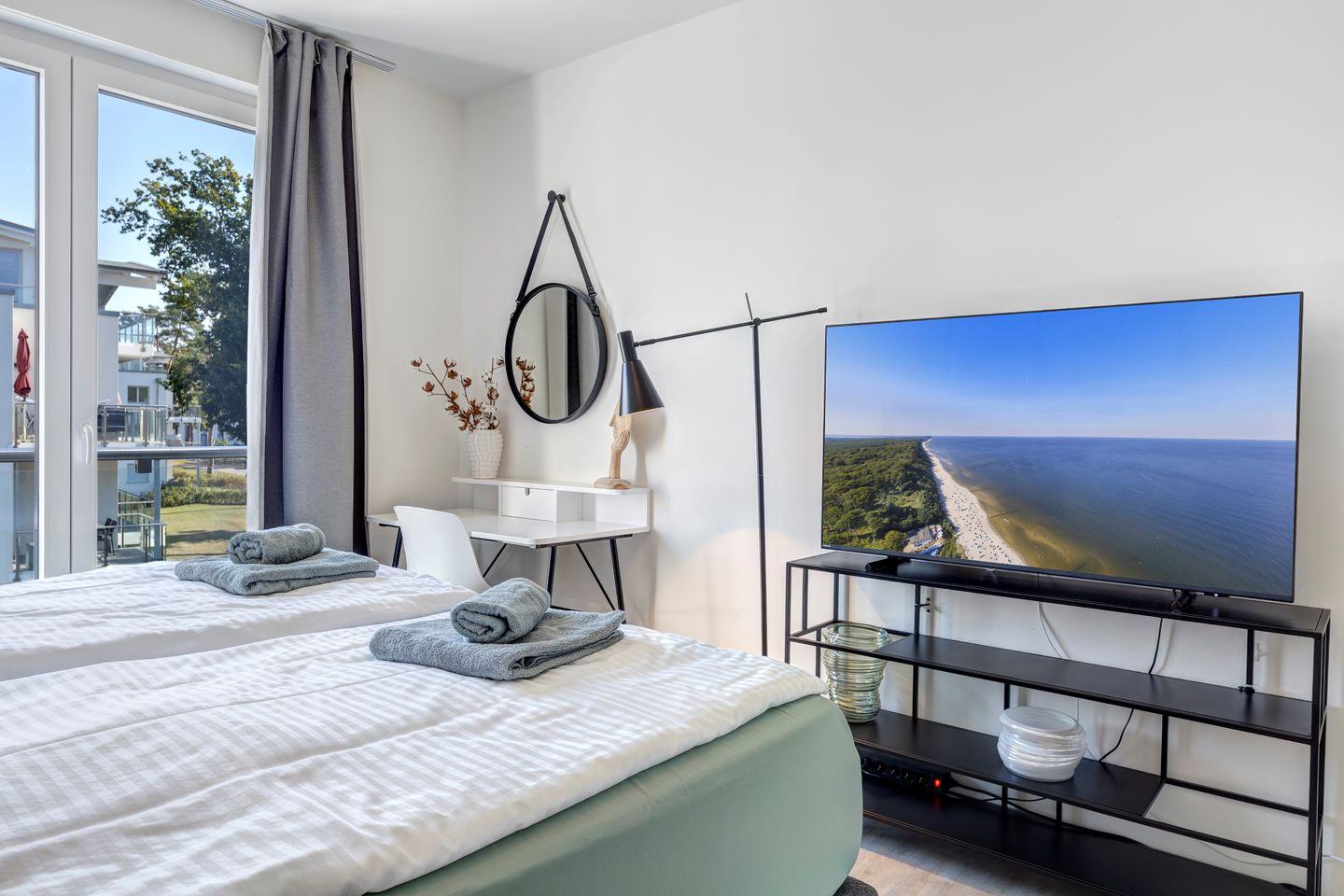 Die Ferienwohnung erstreckt sich über 93 Quadratmeter und bietet Platz für bis zu sechs Gäste.Das Wohnzimmer ist ein Rückzugsort mit bequemer Sofaecke und großen Fenstern.Die voll ausgestattete Küche ermöglicht Ihnen, kulinarische Köstlichkeiten zuzubereiten, die Sie dann auf dem sonnigen Balkon genießen können.Die Schlafzimmer sind ein Ort der Ruhe und Entspannung. Das komfortable Boxspringbett verspricht erholsame Nächte. Die beide Badezimmer sind modern gestaltet, mit einer geräumigen Dusche.
