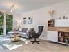 Das Wohnzimmer empfängt Sie mit gemütlichen Sitzgelegenheiten und großzügigen Fenstern, die einen herrlichen Ausblick auf das Grüne und das Haff bieten, und lädt zum entspannten Verweilen ein.