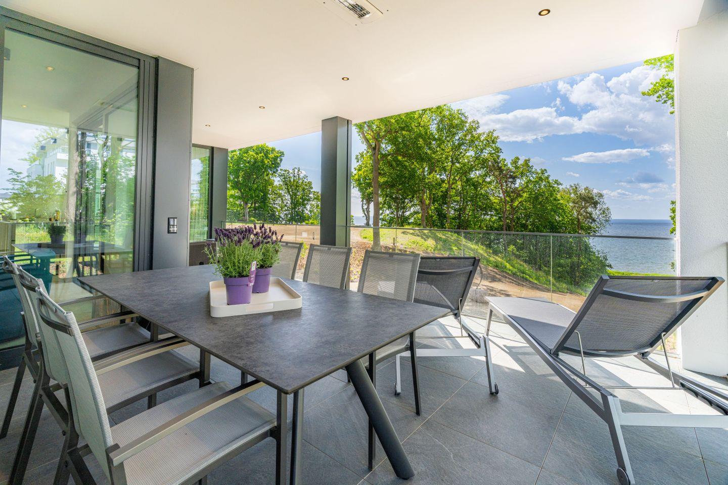 Freuen Sie sich auf Ihren privaten Meerblick auf das Stettiner Haff von der 28 m² großen, überdachten Terrasse, die schnell Ihr Lieblingsplatz wird. Ein Heizstrahler und eine dezente Seitenmarkise sorgen für das inseltypische Strandkorb-Feeling. Ein großer Esstisch mit sechs Stühlen lädt zu gemeinsamen Mahlzeiten ein, während die gemütliche Sitzgruppe mit zwei verstellbaren Relaxsesseln samt Fußhockern und Beistelltisch perfekte Plätze für entspannte Stunden bieten. Sonnenanbeterinnen und Sonnenanbeter können es sich auf den zwei bequemen Sonnenliegen gemütlich machen und ausgiebige Sonnenbäder genießen. Die Außenbereiche der vier Apartments liegen so weit auseinander, dass durch eine belegte Nachbarwohnung keinerlei Einschränkung der Privatsphäre entsteht.