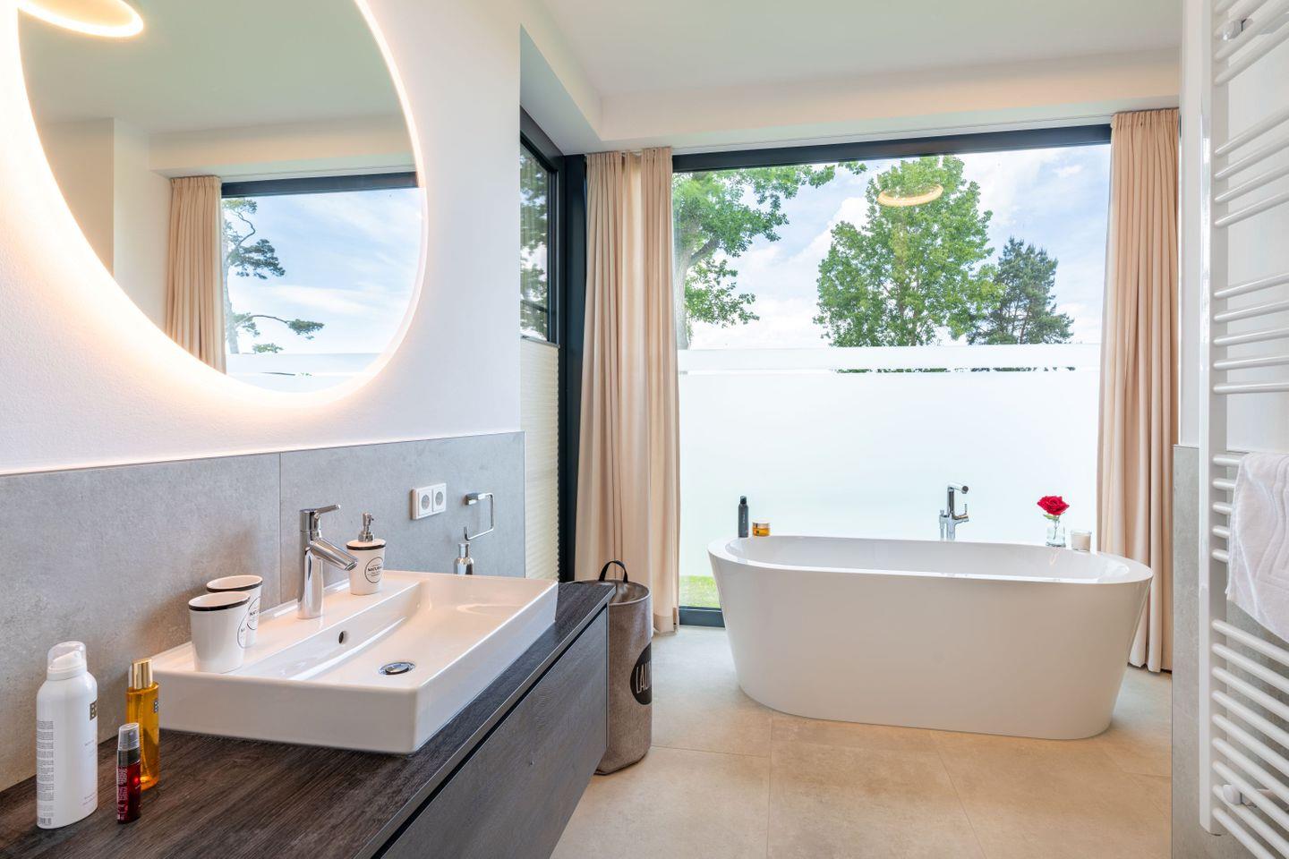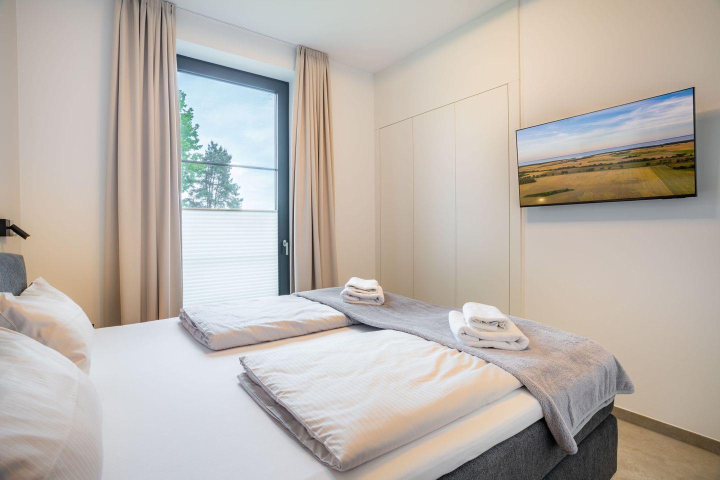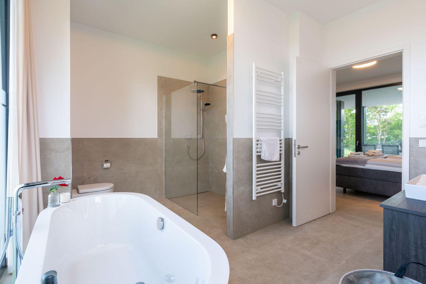 Alle drei Schlafzimmer bieten ein hochwertiges Boxspringbett (200 x 200 im Master-Schlafzimmer, 180 x 200 cm in weiteren Schlafzimmern), Einbauschränke, sowie einen Smart-TV. Das en suite Badezimmer im Hauptschlafzimmer mit begehbarer Dusche und freistehender Badewanne rundet den Komfort ab. Zusäzliches Schmankerl im Hauptschlafzimmer: Meerblick auf das Stettiner Haff und direkter Zugang zur Terrasse. Im zweiten, voll ausgestatteten Badezimmer steht Ihnen ebenfalls eine begehbare Dusche zur Verfügung.