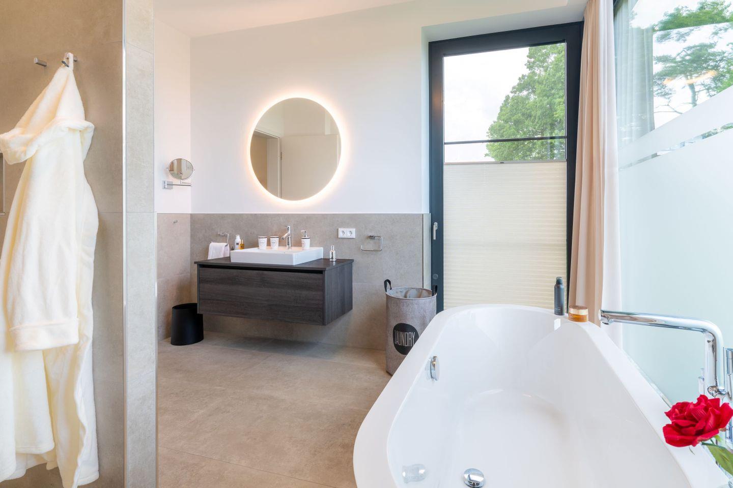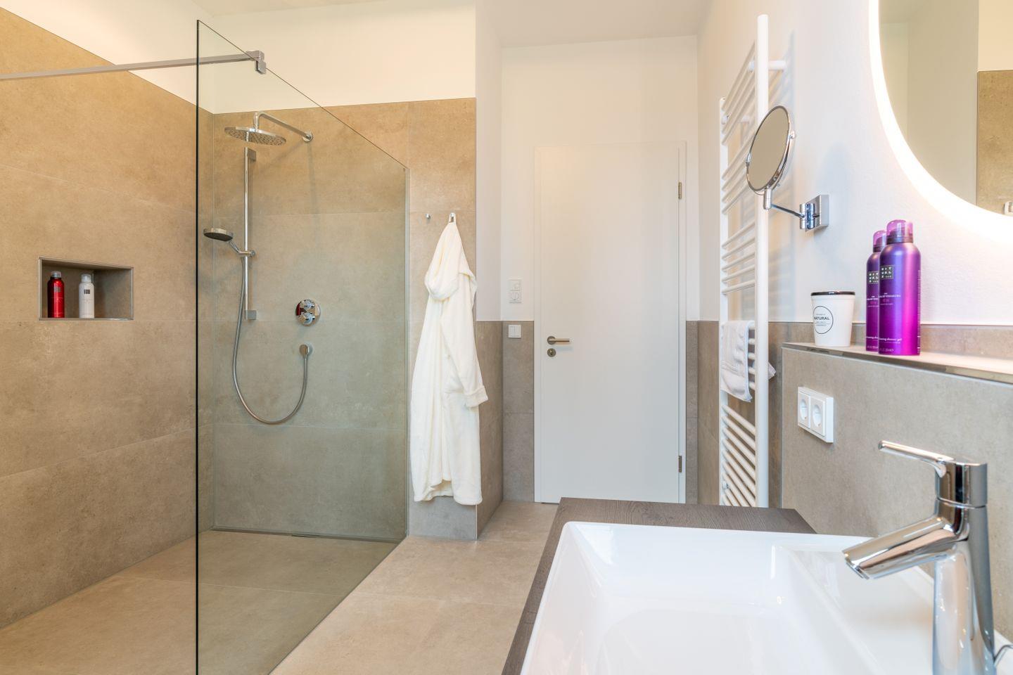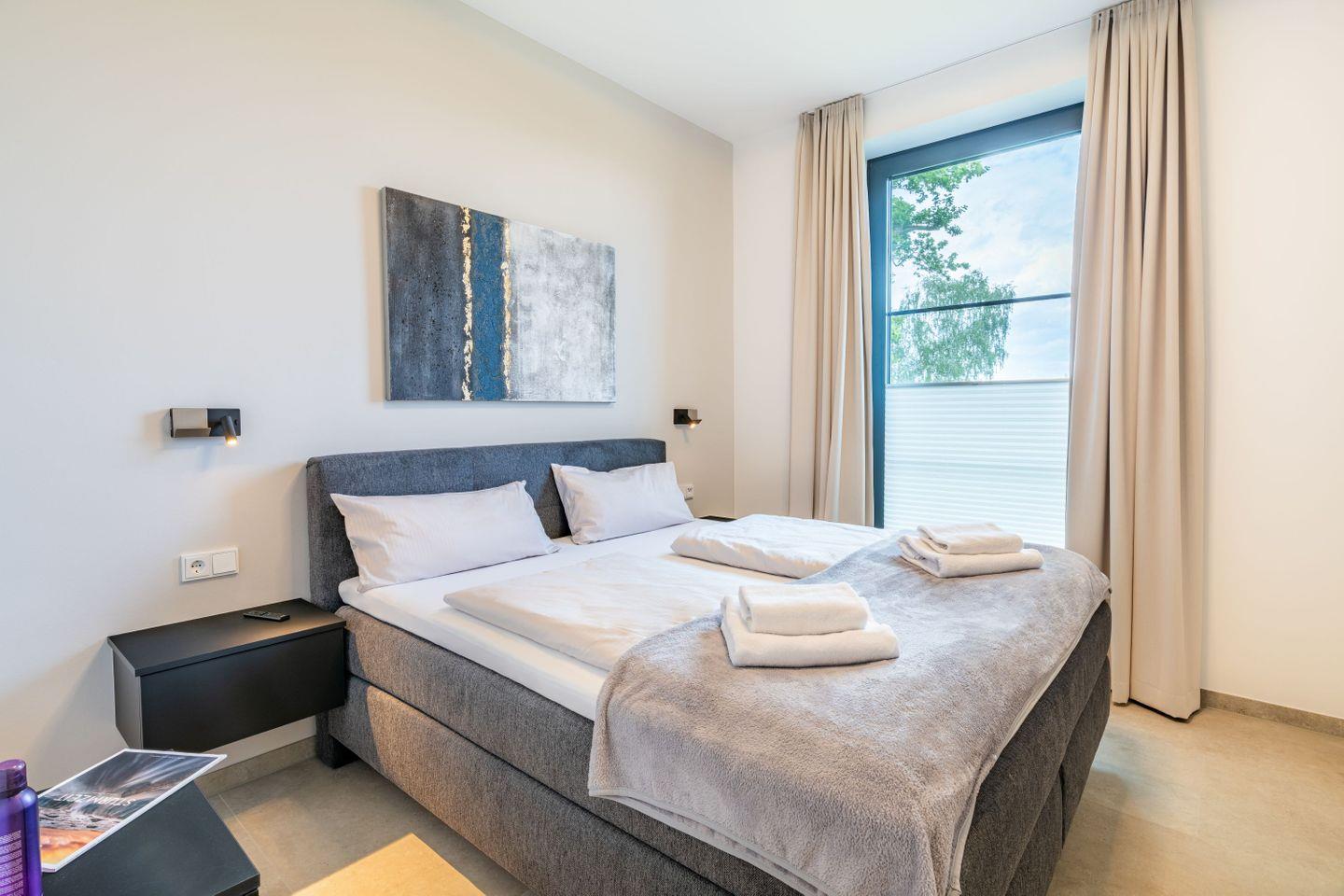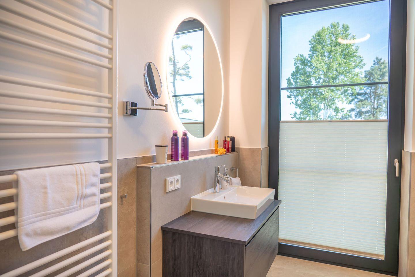 Alle drei Schlafzimmer bieten ein hochwertiges Boxspringbett (200 x 200 im Master-Schlafzimmer, 180 x 200 cm in weiteren Schlafzimmern), Einbauschränke, sowie einen Smart-TV. Das en suite Badezimmer im Hauptschlafzimmer mit begehbarer Dusche und freistehender Badewanne rundet den Komfort ab. Zusäzliches Schmankerl im Hauptschlafzimmer: Meerblick auf das Stettiner Haff und direkter Zugang zur Terrasse. Im zweiten, voll ausgestatteten Badezimmer steht Ihnen ebenfalls eine begehbare Dusche zur Verfügung.
