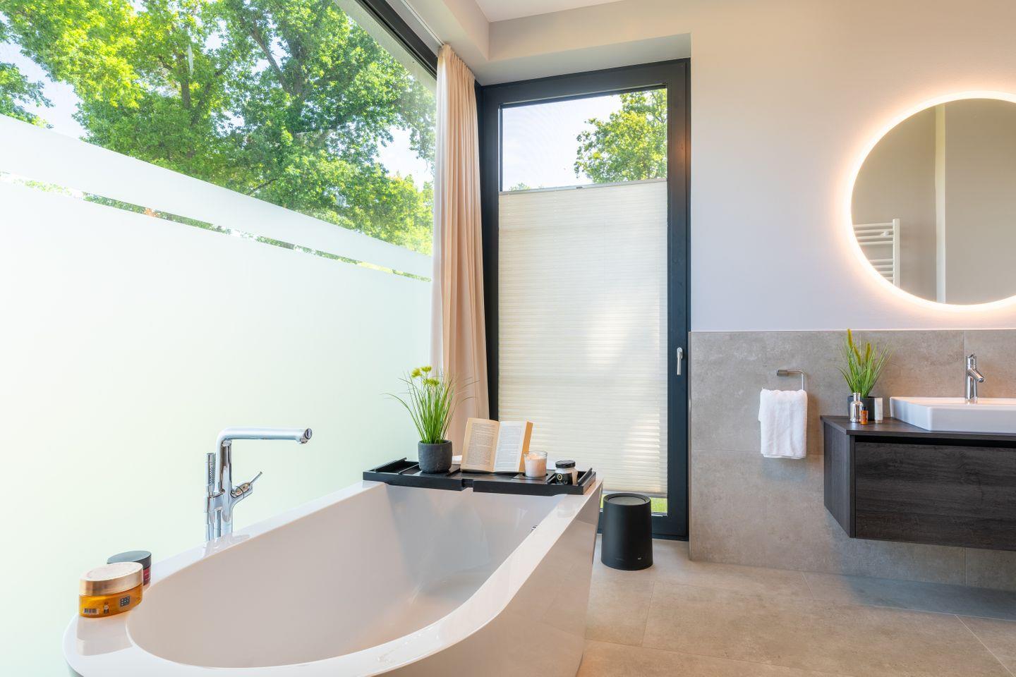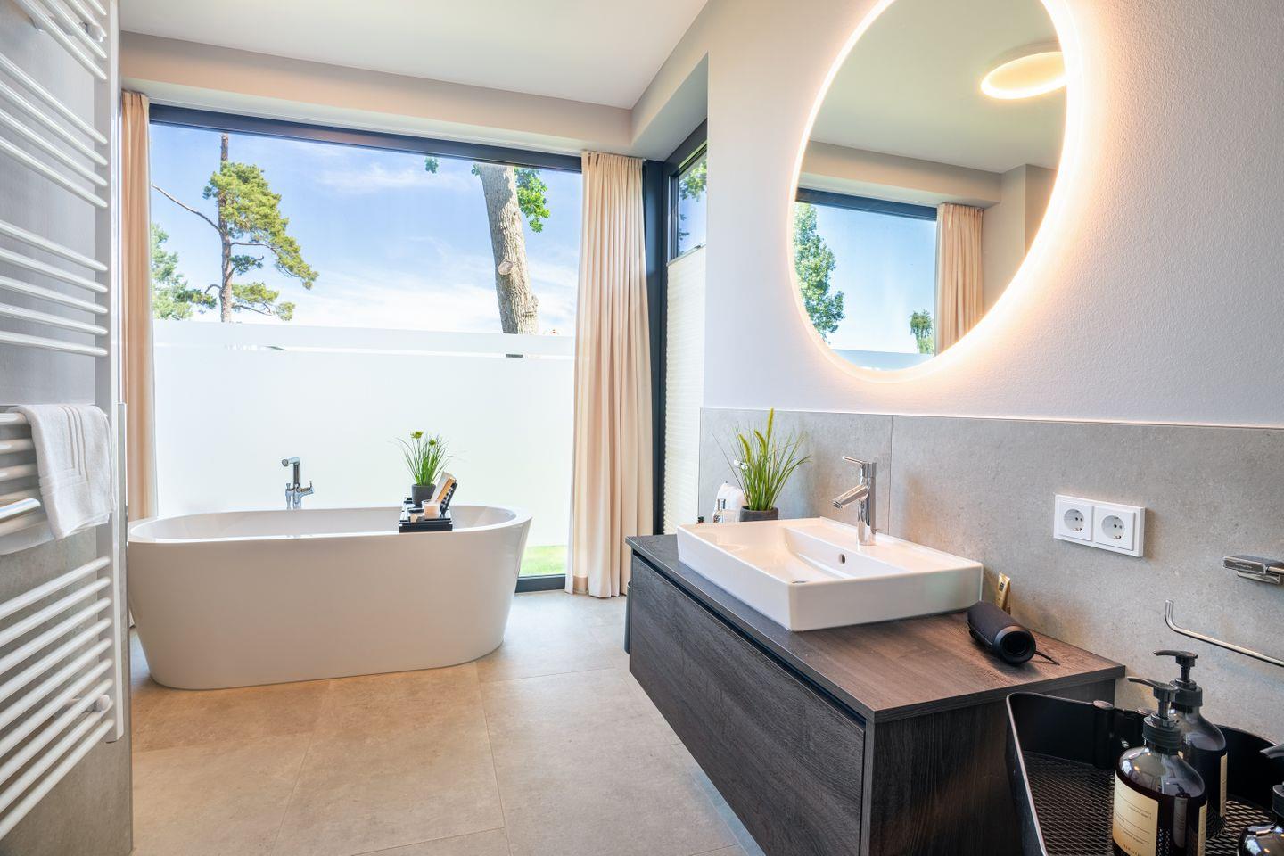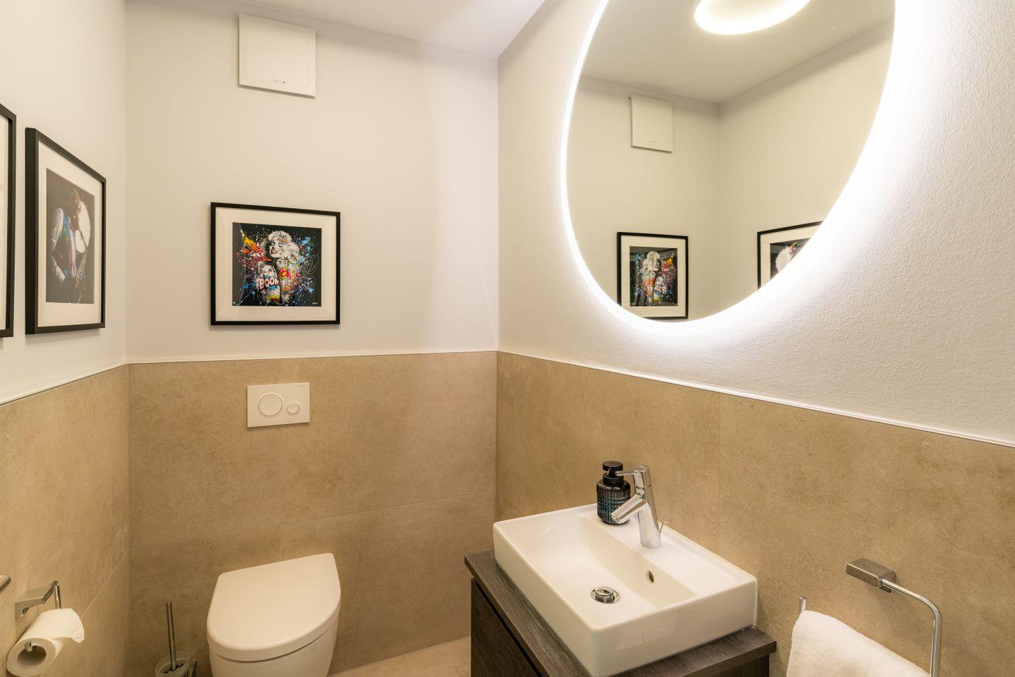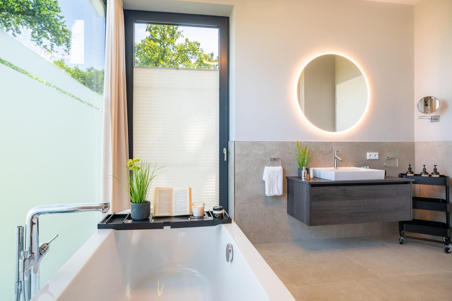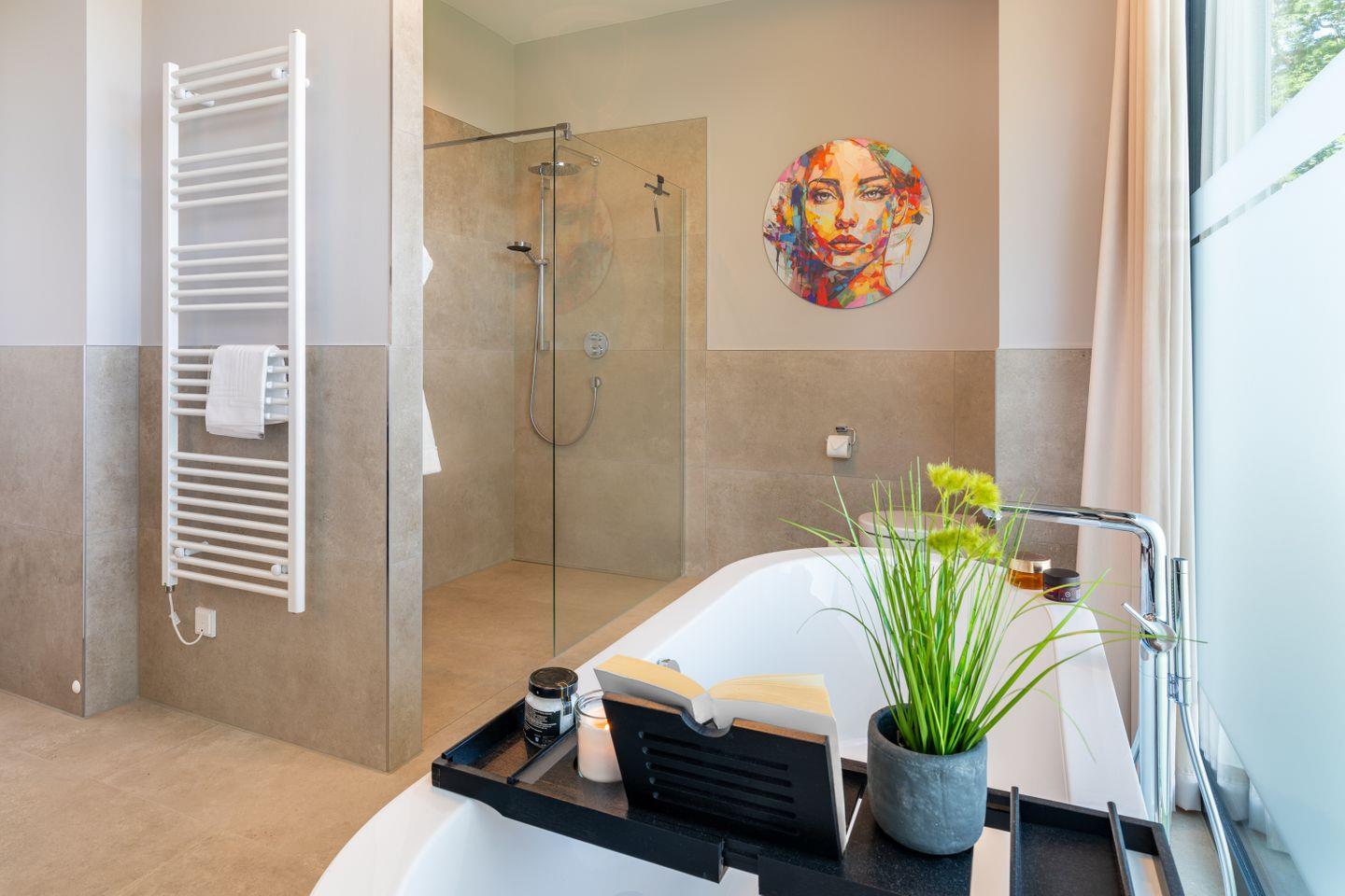 Ein zweites, ebenfalls hochwertig ausgestattetes Badezimmer mit bodengleicher Dusche steht allen Gästen zur Verfügung.