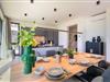 Der angrenzende Wohn-Essbereich besticht durch modernen Loft-Charakter mit einem stimmungsvollen, zentral platzierten Gaskamin, der auf Knopfdruck behagliche Atmosphäre schafft – ideal für entspannte Abende zu jeder Jahreszeit.