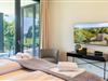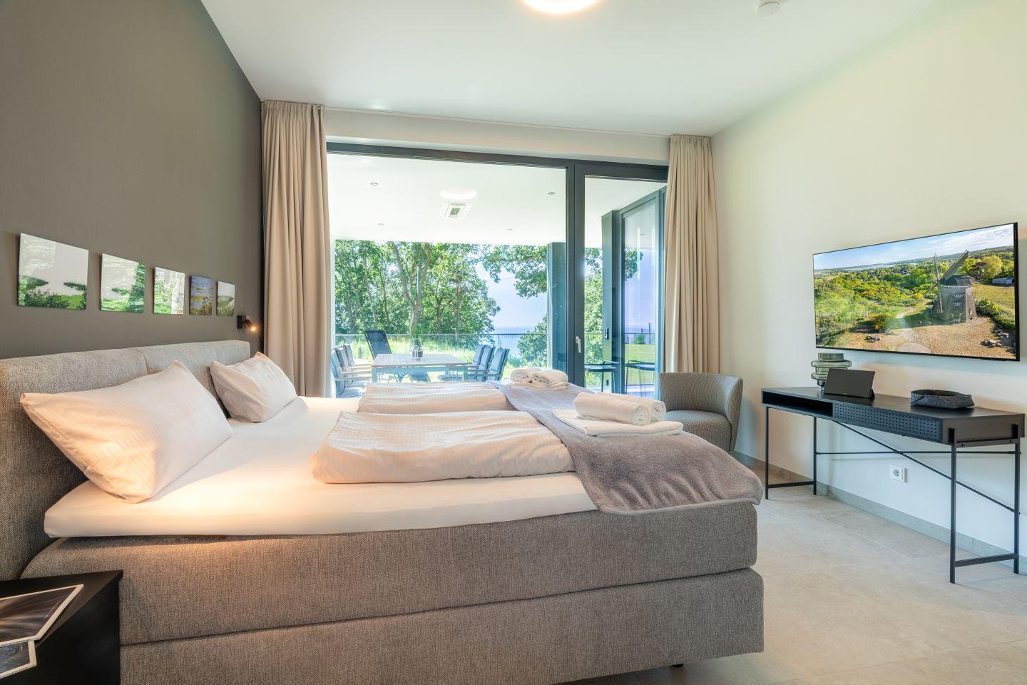 Die drei Schlafzimmer bieten höchsten Schlafkomfort mit Boxspringbetten (200 x 200 cm im Master-Schlafzimmer, 180 x 200 cm in den weiteren Zimmern), maßgefertigten Einbauschränken und Smart-TVs. Das Hauptschlafzimmer überzeugt zusätzlich mit eigenem Bad en suite, freistehender Badewanne, begehbarer Dusche, Meerblick und direktem Zugang zur Terrasse.