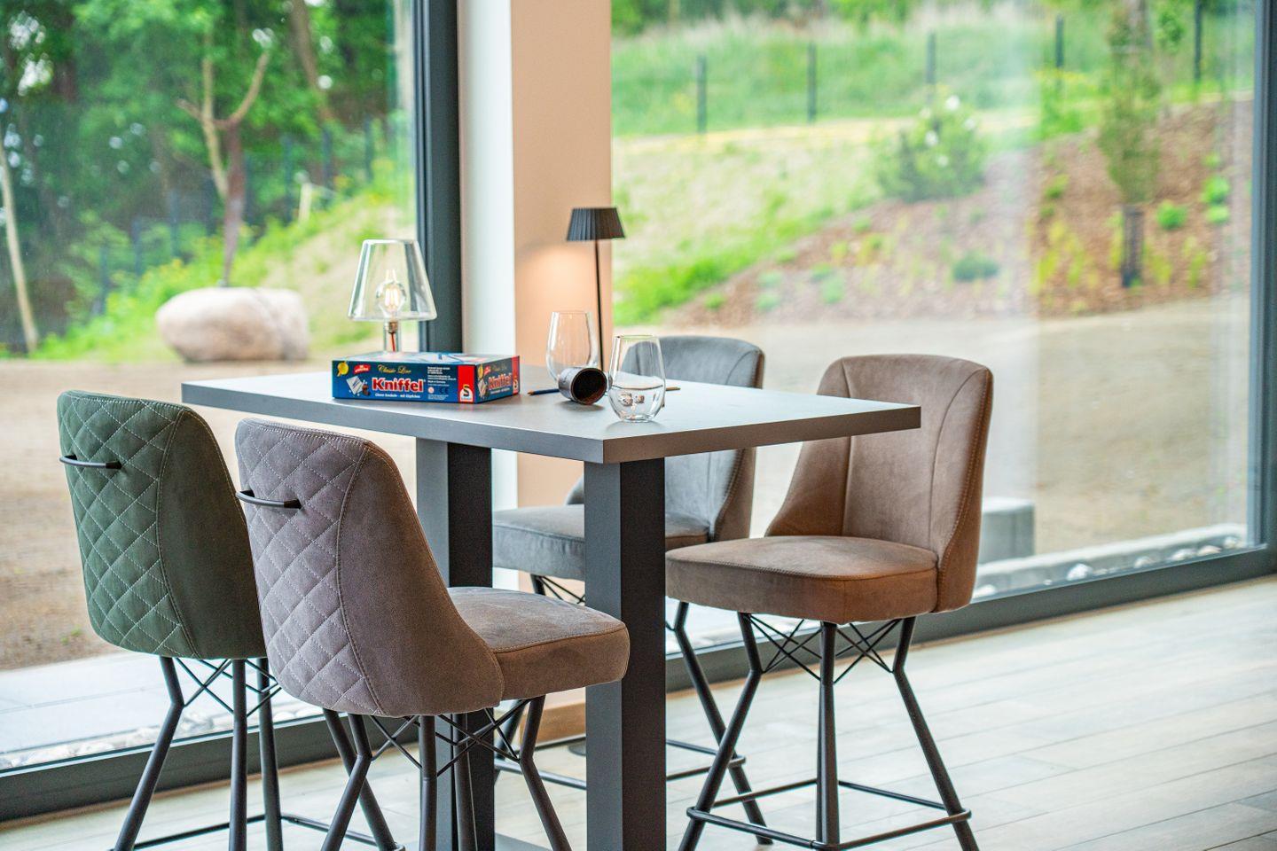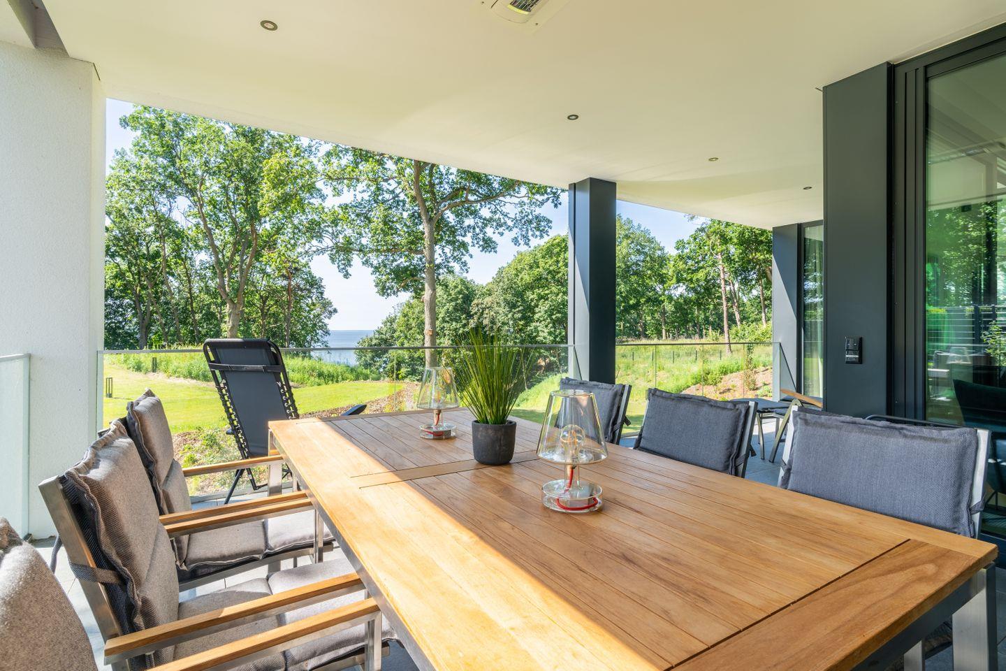 Die 28 m² große, überdachte Terrasse mit traumhaftem Blick auf das Stettiner Haff wird schnell zum Highlight Ihres Aufenthalts. Ausgestattet mit Heizstrahler, Seitenmarkise, großem Esstisch, Relaxsesseln und Sonnenliegen, bietet er einen geschützten Ort zum Genießen, Sonnenbaden oder Verweilen – ganz privat, ganz für Sie.