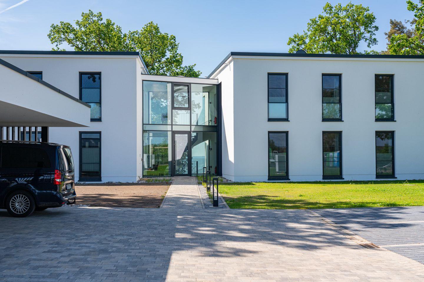 Die stilvoll eingerichtete Wohnung gehört zum "DECK9 am Haff", einem architektonisch markanten Ensemble mit nur vier Wohneinheiten – eingebettet in ein weitläufiges Naturgrundstück mit über 8.000?m² Fläche.