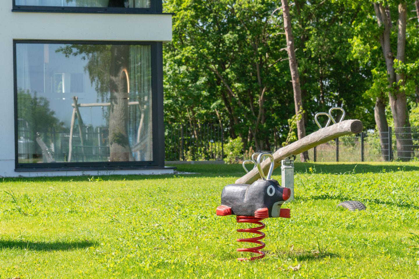 Der überdachte Balkon bietet einen privaten Blick auf das Stettiner Haff – Ruhe pur. Familienfreundlich mit Garten, Spielbereich, Grillplatz, Sauna, Whirlpool & Fitnessbereich.