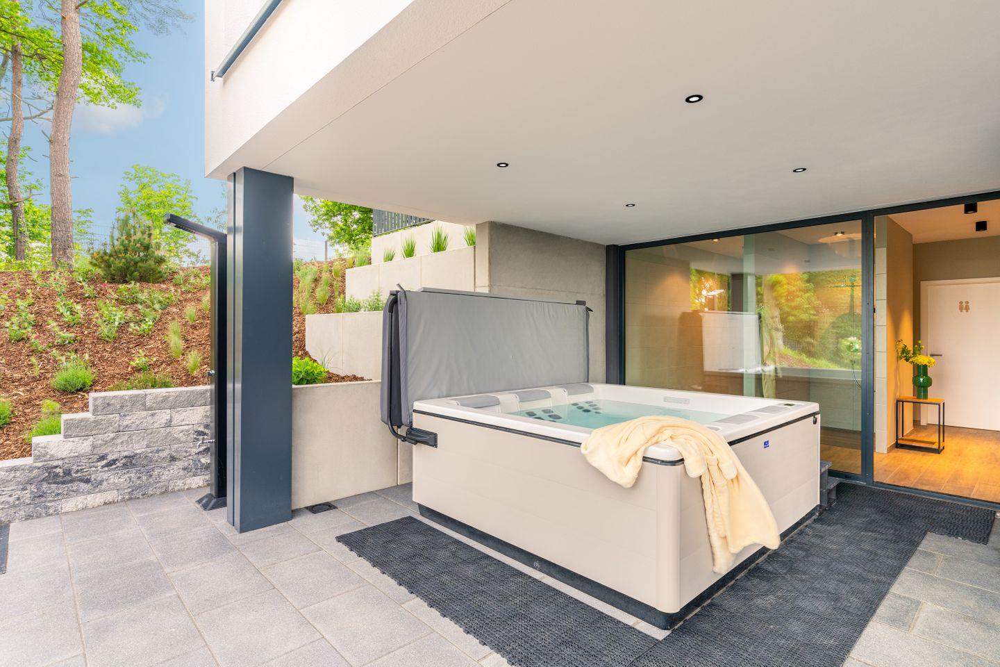 Mit Garten, Spielbereich, Grillplatz und Zugang zum Spa mit Sauna, Whirlpool & Fitnessraum.