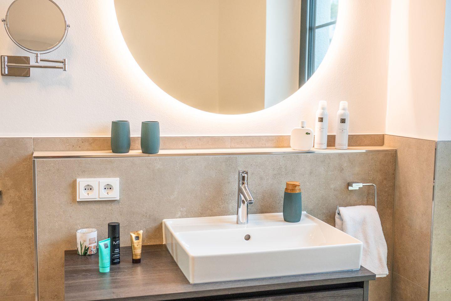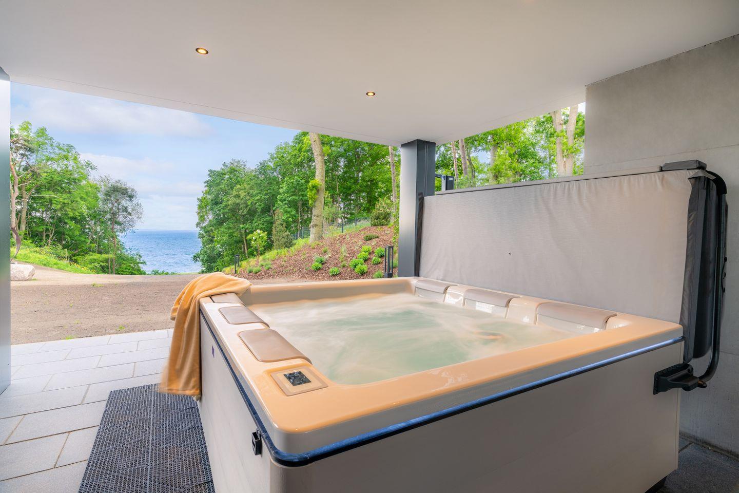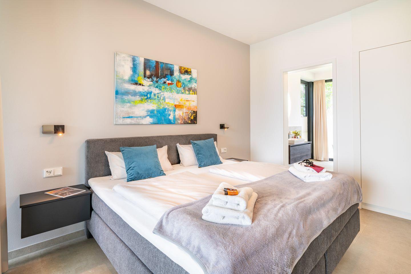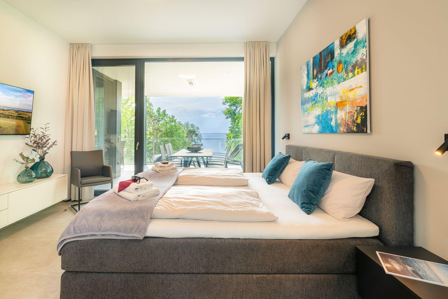 Das Hauptschlafzimmer überzeugt zusätzlich mit einem eleganten Bad en suite, ausgestattet mit bodengleicher Dusche und freistehender Badewanne. Der direkte Zugang zum Balkon und der freie Blick über das Haff verleihen diesem Raum eine besondere Qualität – ein exklusiver Ort für stille Momente.