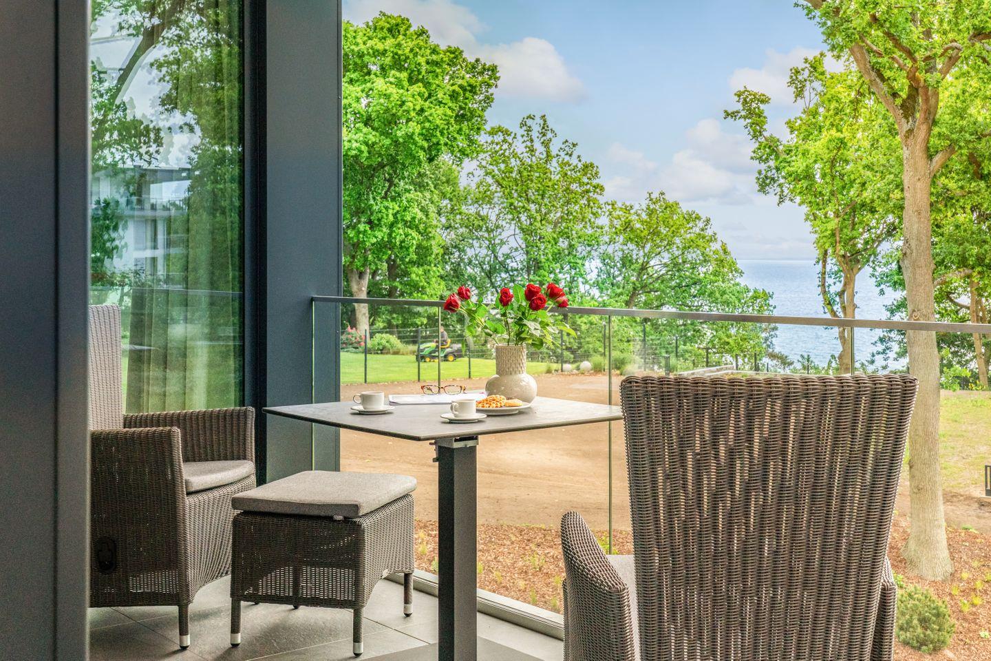 Der 28?m² große, überdachte Sonnenbalkon ist eine Oase für alle Sinne. Mit Relaxsesseln, Sonnenliegen, großem Esstisch, Seitenmarkise und Heizstrahler ausgestattet, bietet er Raum für entspannte Stunden – windgeschützt, ungestört, mit einzigartigem Blick über das glitzernde Haff.
