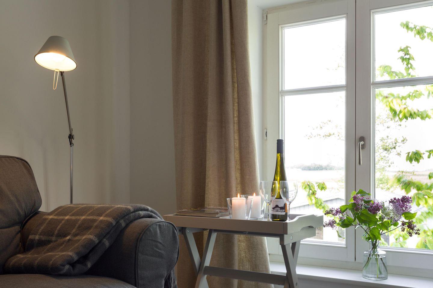 Das Wohn-/ Esszimmer mit offener Küche bietet einen weiten Ausblick nach Osten und Süden; das Schlafzimmer ist nach Norden ausgerichtet mit Blick zum Gutshaus. Das besondere Highlight der Wohnung ist ein kuscheliger Leseplatz am Zugang zum großen Süd-Balkon und natürlich der Balkon selbst!