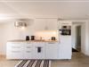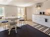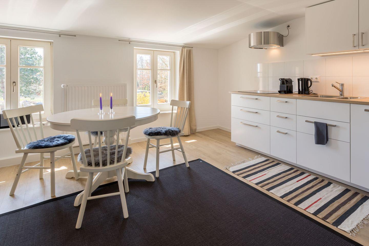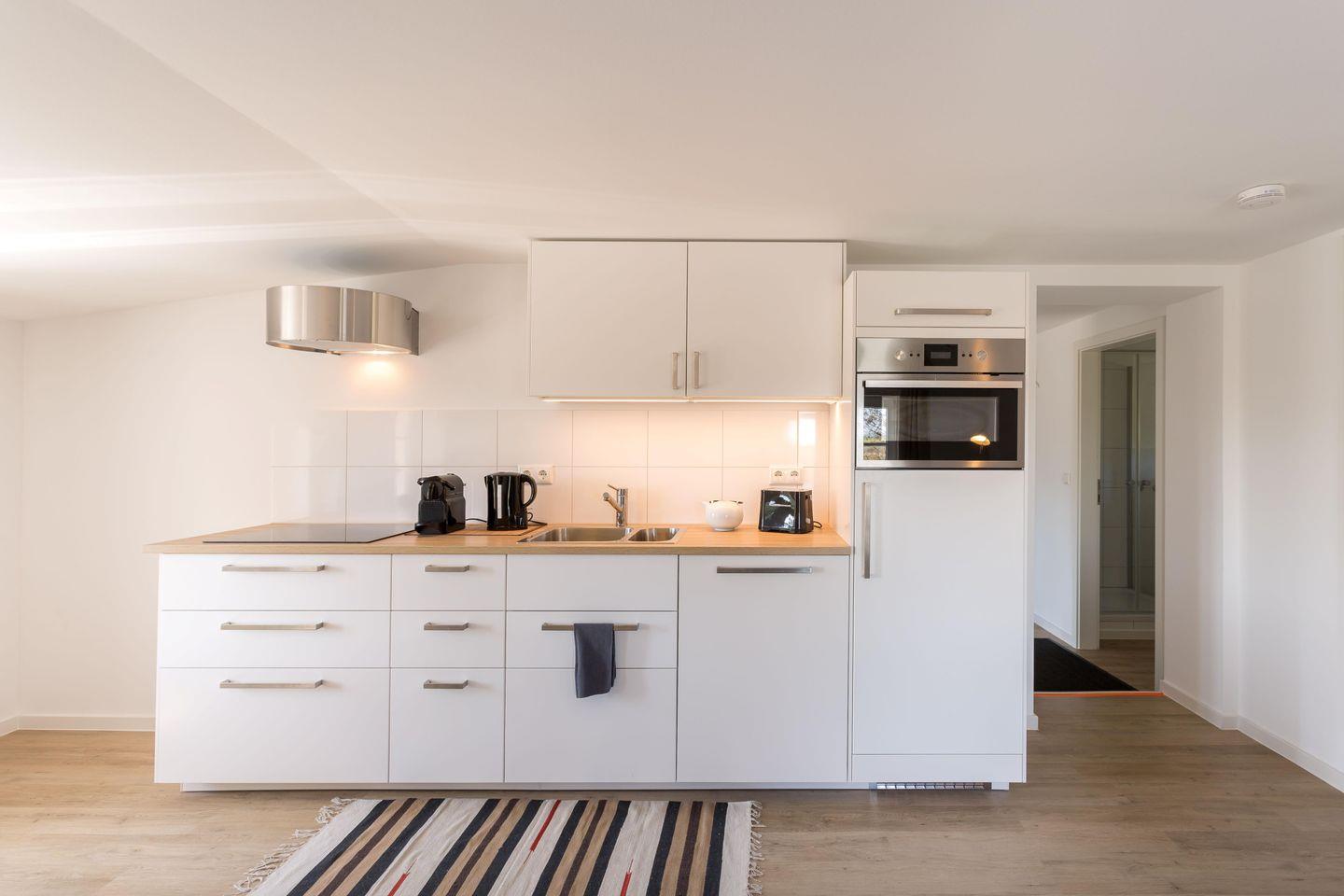 Auf 45 m² finden Sie eine offene, voll ausgestattete Wohnküche mit Backofen/Mikrowelle, Kühlschrank mit Gefrierkombination und einem Esstisch.