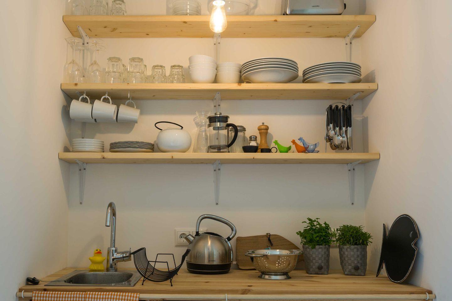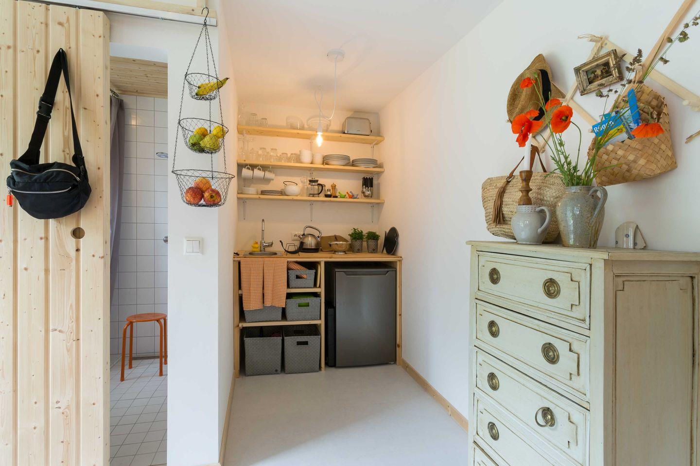 Lazy "Mira" ist ein kleiner Bungalow mit einem Schlafzimmer und Etagenbett. Sie treten direkt in den Wohnbereich ein. Das Bad verfügt über eine ebenerdige Dusche. Bewusst haben wir uns auch in der Küche auf das wesentliche beschränkt - es gibt ein Induktionskochfeld und einen Kühlschrank mit Gefrierfach.