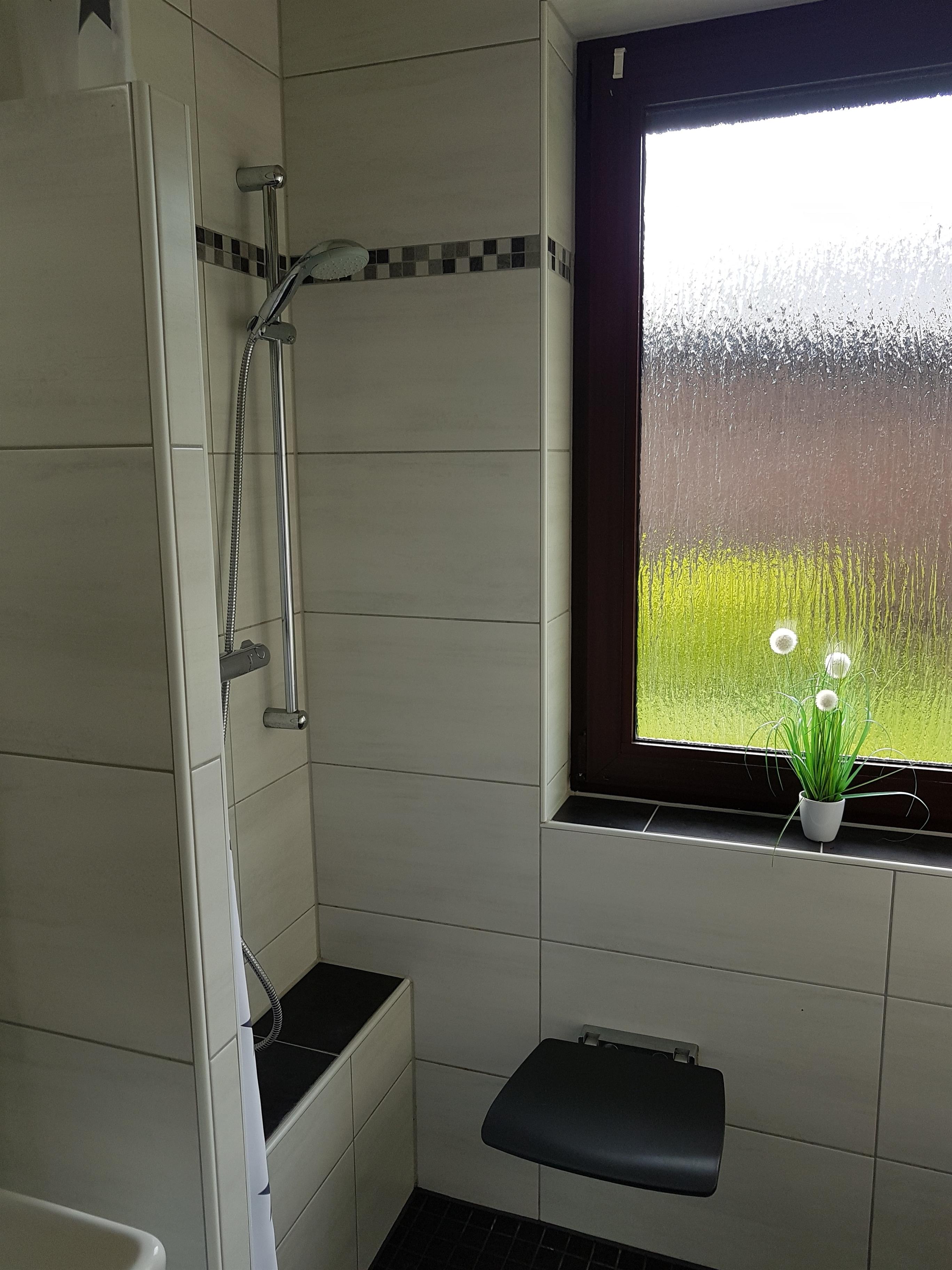 Wenn Sie ins Haus kommen ist gleich auf der linken Seite die voll ausgestattete Küche mit Essbereich zu finden. Die Küche lädt zum entspannten Kochen ein. Weiter auf dem Flur entlang finden Sie das moderne Duschbad mit WC, Waschbecken und ebenerdige Dusche mit Sitzmöglichkeiten beim Duschen.