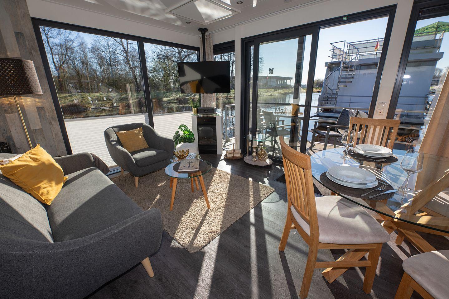 Urlaub auf dem festliegenden Hausboot – führerscheinfrei, ruhig, komfortabel.