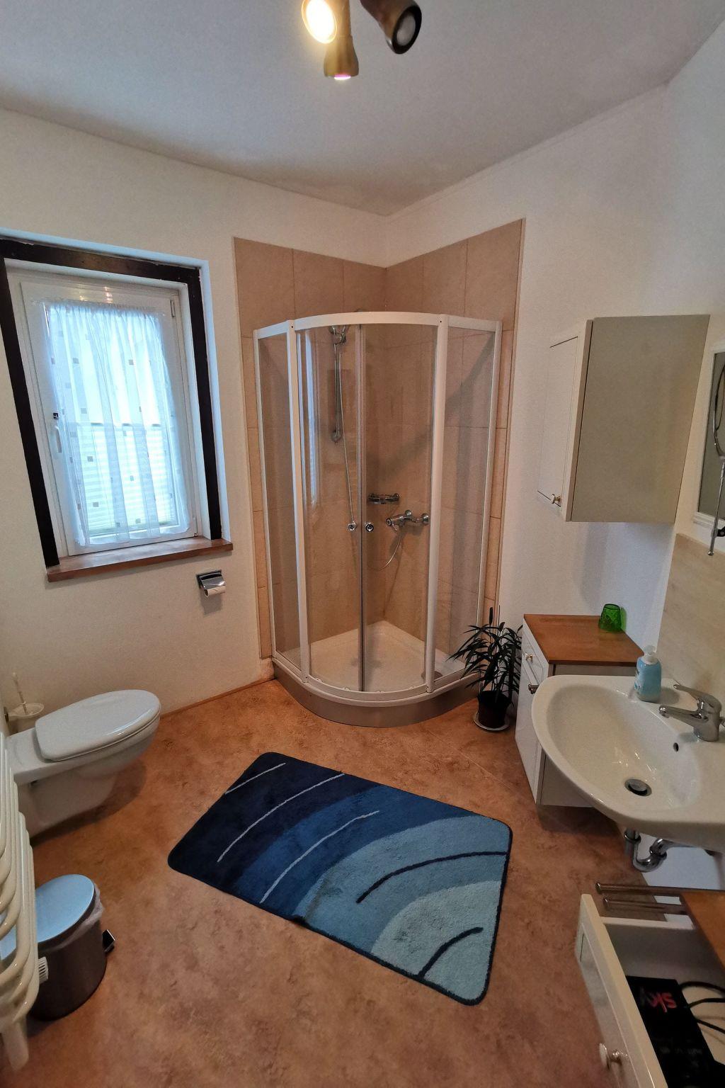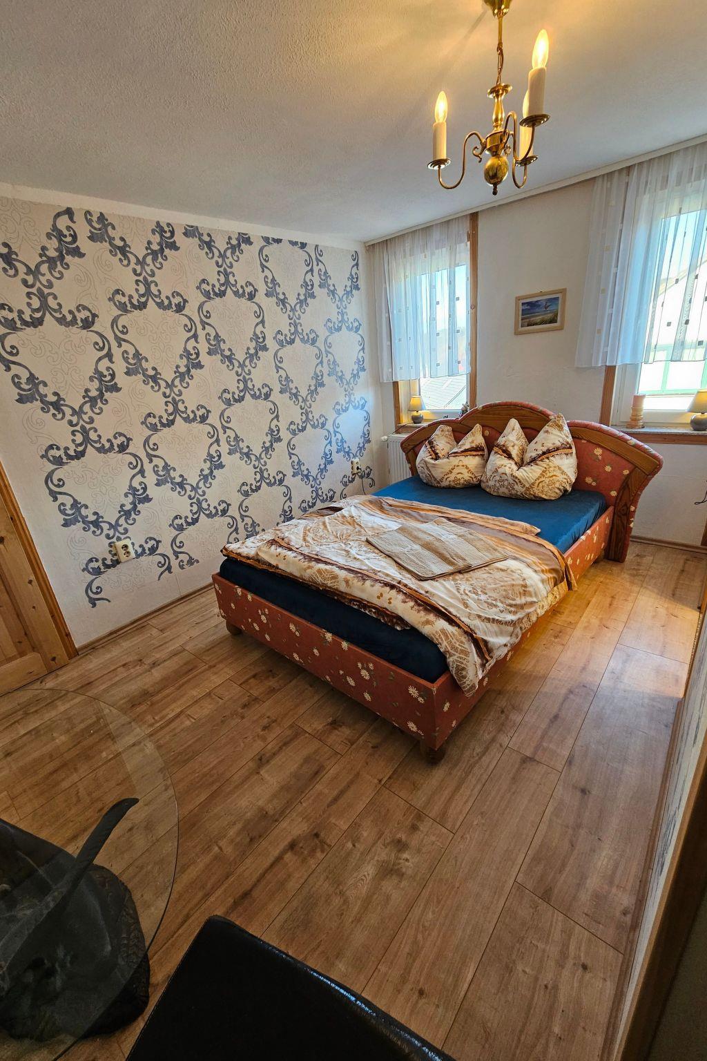 The flat on the upper floor is romantically furnished and offers you every comfort for a relaxing stay. A cosy living room with cable TV and stereo system is at your disposal. The well-equipped eat-in kitchen with cooker, microwave, coffee machine, kettle and fridge invites you to enjoy meals together. The bathroom is equipped with a separate shower, WC and a large washbasin and offers cosy warmth at all times thanks to the central heating. The comfortable bedrooms with one double bed measuring 2m x 2m and two double beds measuring 1.8m x 2m ensure a good night's sleep.
