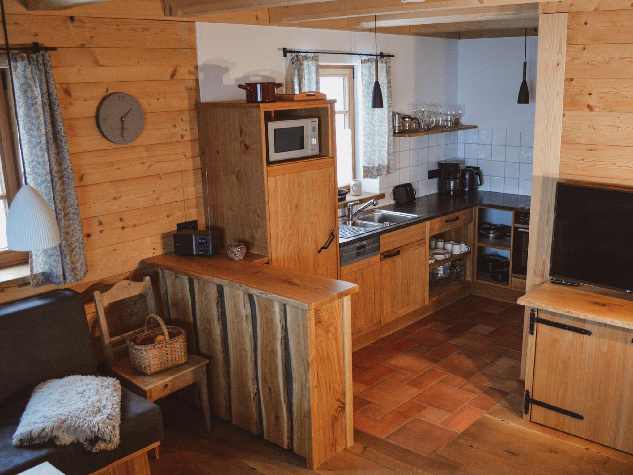 Eine moderne Küche, ein knisternder Kaminofen und Kuschelecken zum Lesen oder Nichtstun warten im Romantik-Chalet für 2 Personen auf Sie. Vom Wohnraum aus öffnet sich die große Glasterrassentür zur Holzveranda mit Ausblick. Alles im Chalet für 2 Personen ist ausgestattet mit natürlichen Materialien aus Holz, Naturstein und handgewebtem Leinen. Viele selbstgemachte Möbel, schöne Dinge, die man gern berührt. Wellness bietet das Chalet für 2 mit seiner eigenen Sauna im Außenbereich.