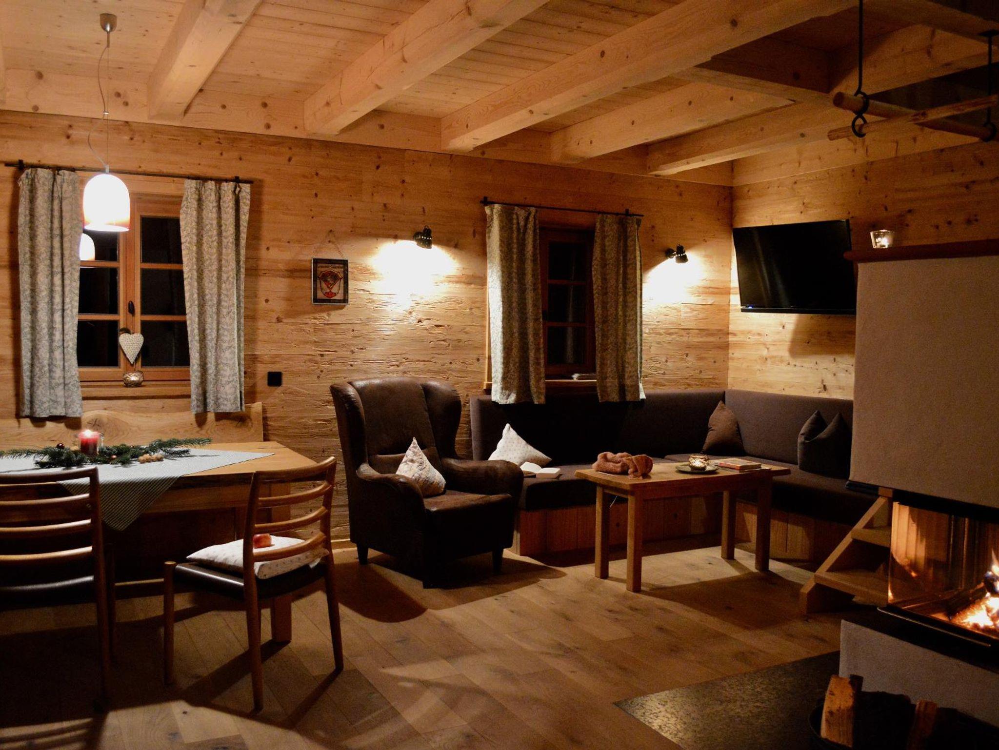 Ein moderner Kaminofen, der mit prasselndem Feuer wohlige Wärme verbreitet. Die Couch zum Ruhen, die zwei Ohrensesseln zum Lesen, oder Schauen oder Nichtstun. Der ganze Raum im romantischen Chalet aus Naturmaterialien ist schön. In der modernen Küche geht der Blick in den Wald und die Wiesen.
