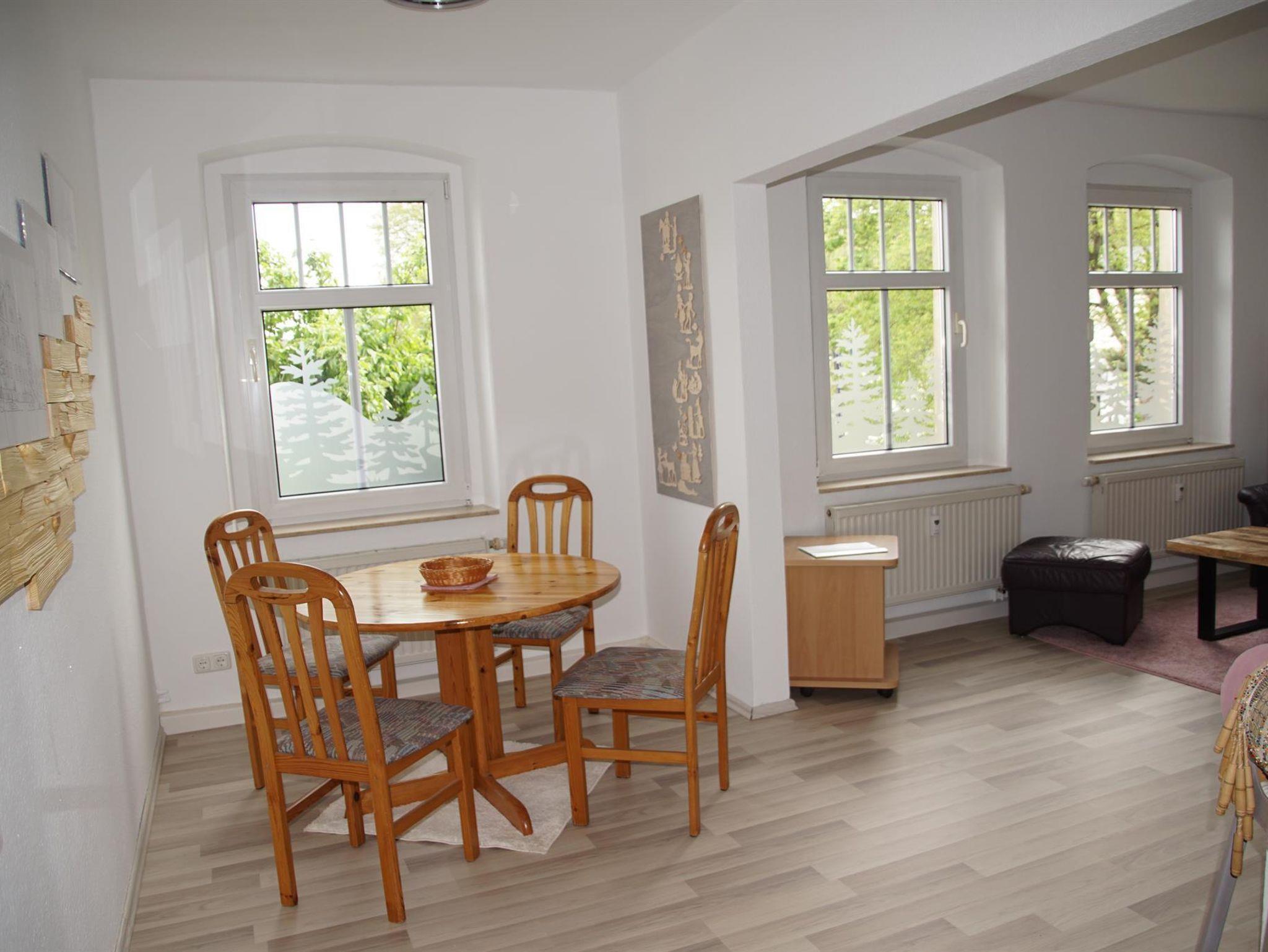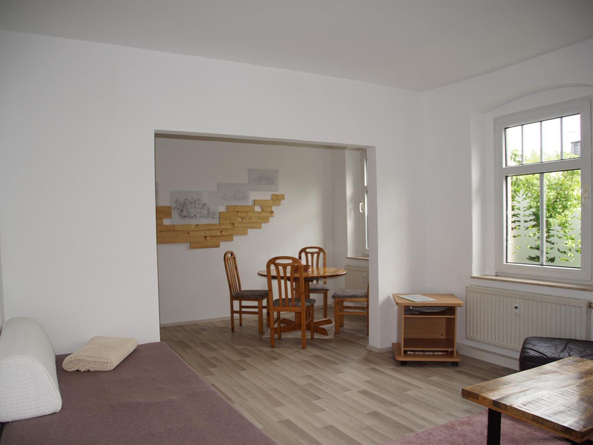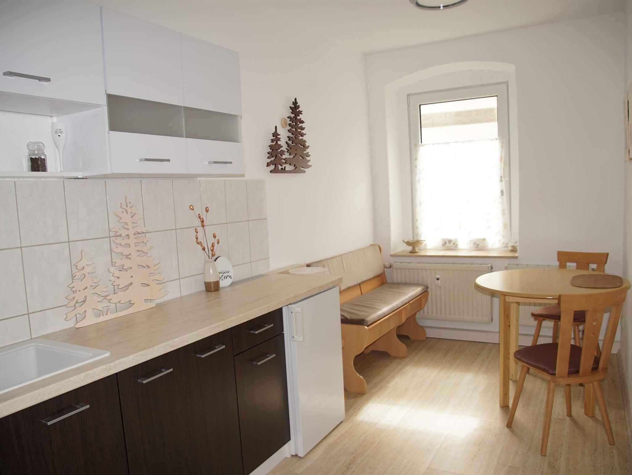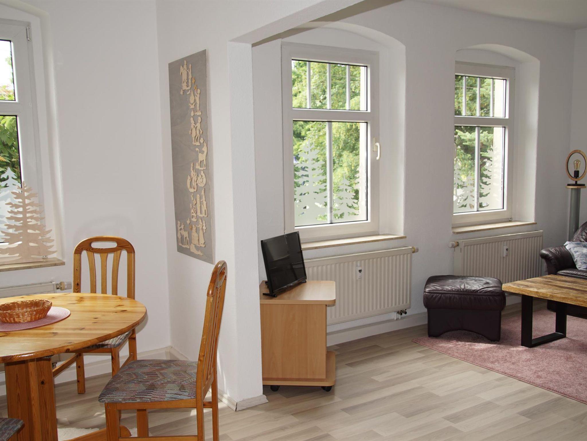 Die gesamte Wohnung ist liebevoll und mit Bezug zum Erzgebirge eingerichtet. Das Wohnzimmer bietet Ambiente und Gemütlichkeit. Zum Ausruhen und Verweilen dienen eine Couchgarnitur und ein Futonbett; zur Geselligkeit und zum Spielen kann der große Ausziehtisch genutzt werden. Ein Fernseher ist vorhanden. Die komplett ausgestattete Küche mit Geschirrspüler, Kühlschrank nebst Kühlfach, Herd, Backofen, Mikrowelle, Wasserkocher, Kaffeemaschine, Toaster und Eierkocher sowie einer Essecke lässt Individualität und Effektivität zu.