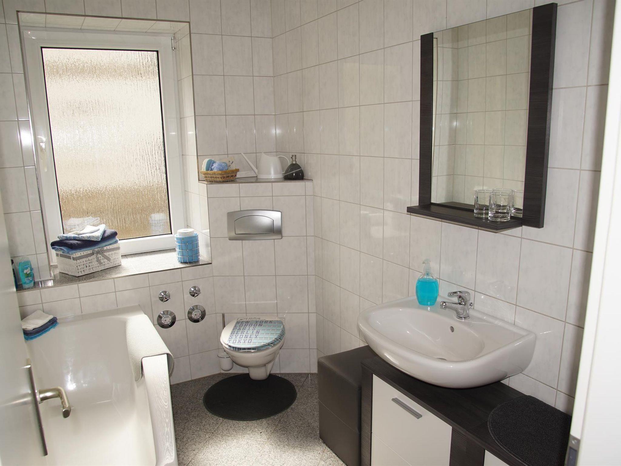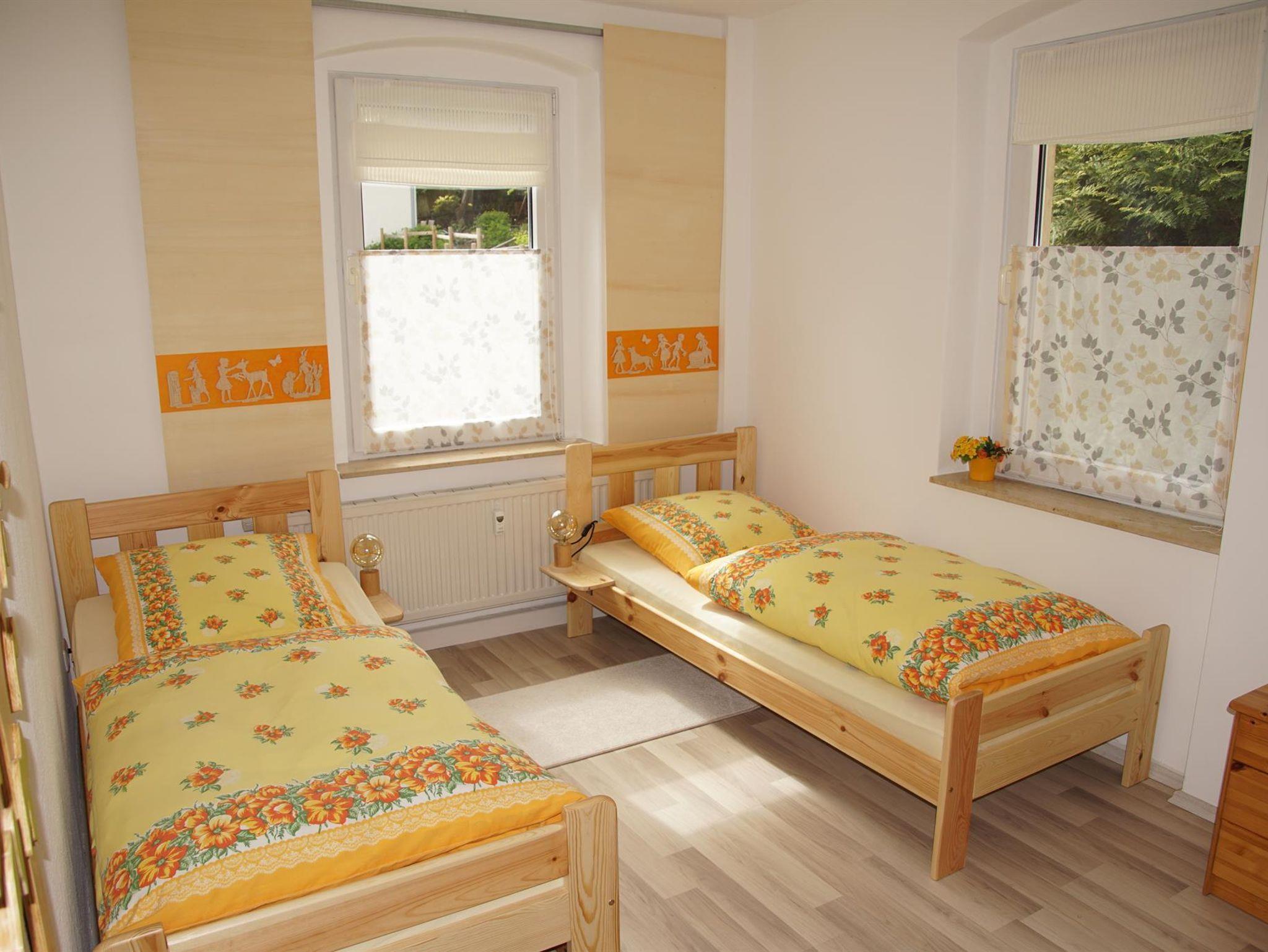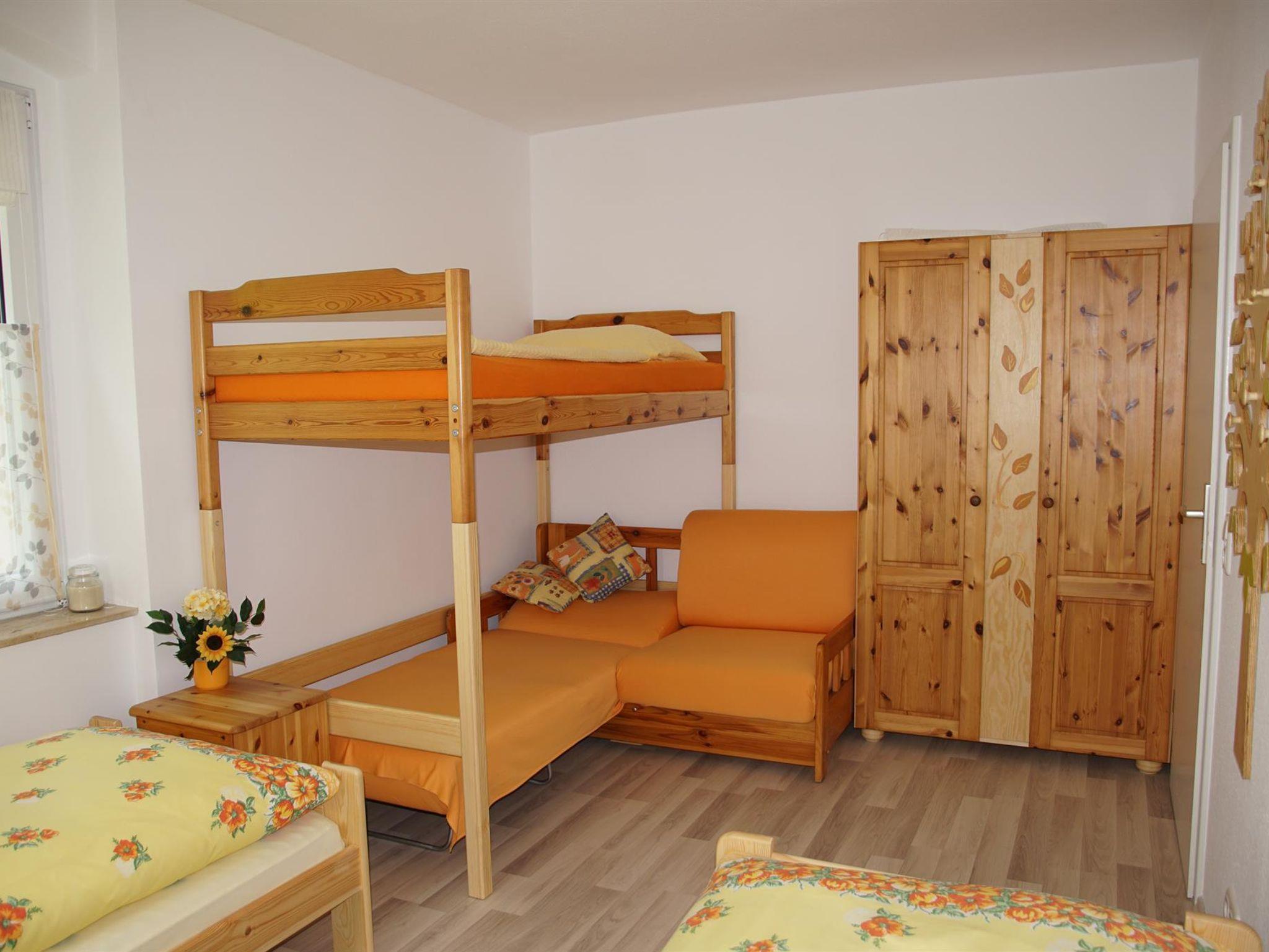 Die Ferienwohnung verfügt über ein Schlafzimmer mit Echtholz – Möbeln (zwei Einzel- bzw. Doppelbett, ein Hochbett und eine Schlafcouch sowie einen Schrank). Außerdem können Sie ein handbemaltes Babybettchen nutzen. Das Bad ist mit WC, Badewanne, Waschbecken, Spiegel, Hocker, Schränken, Handtuchtrockner und Fußbodenheizung ausgestattet. WLAN ist vorhanden.