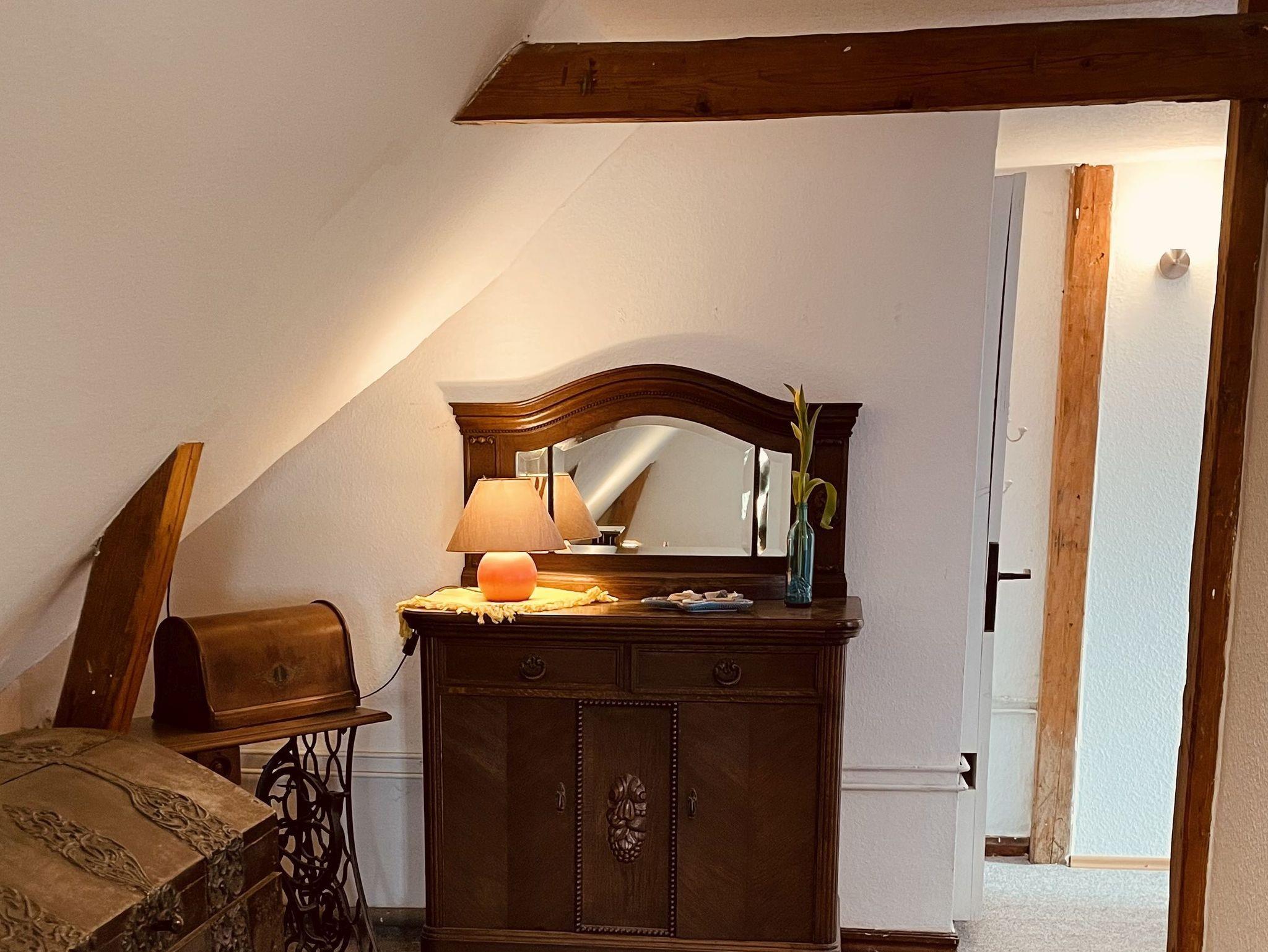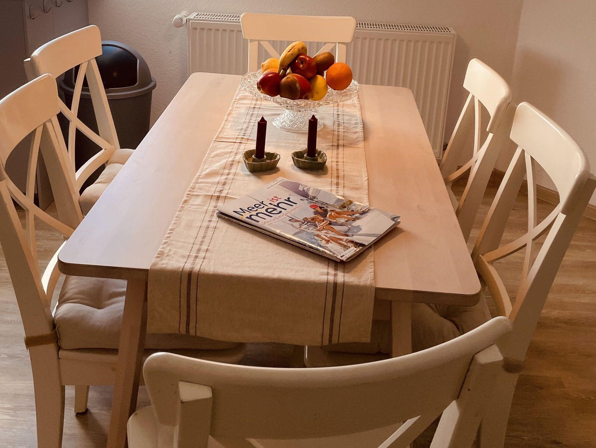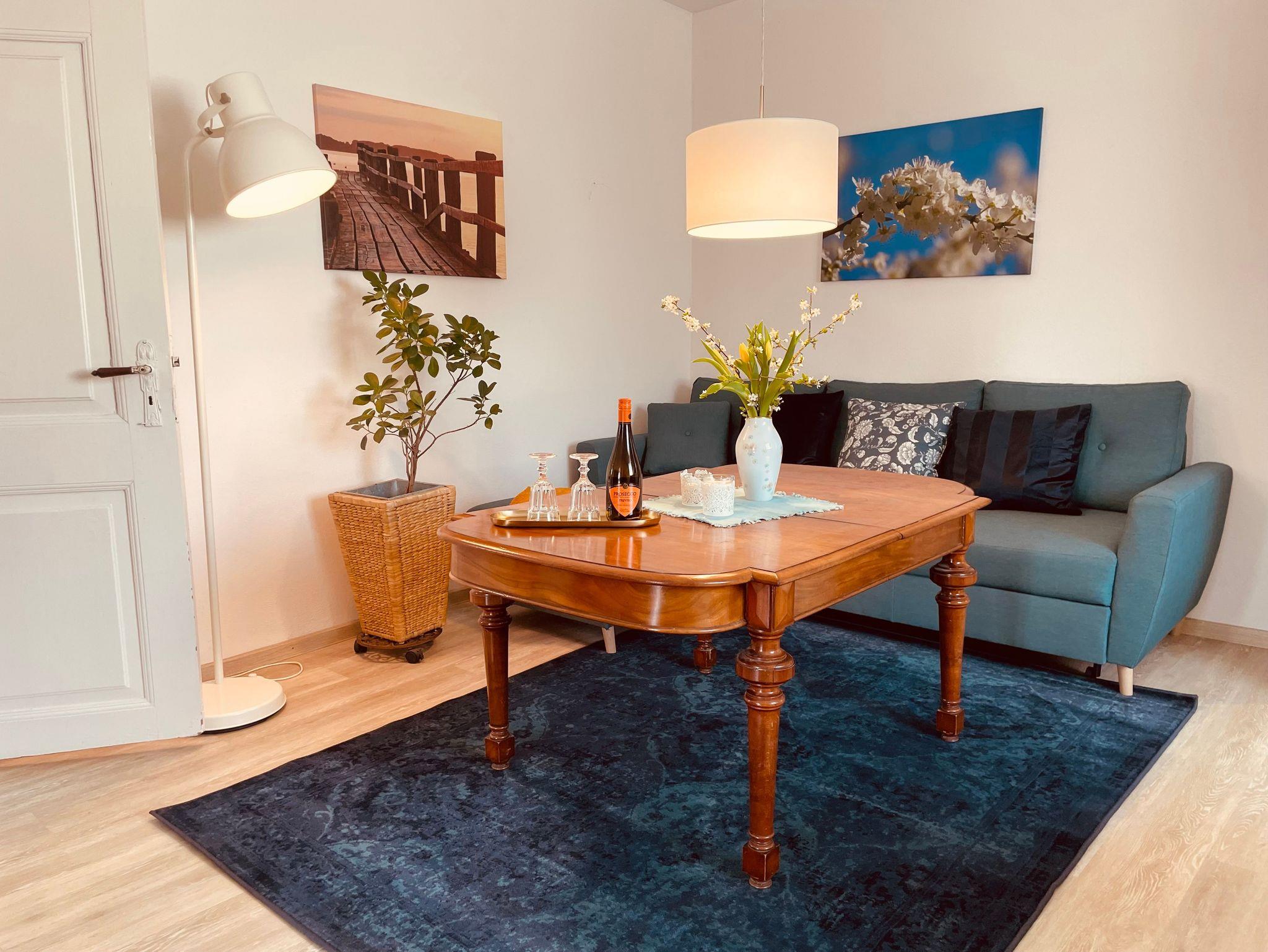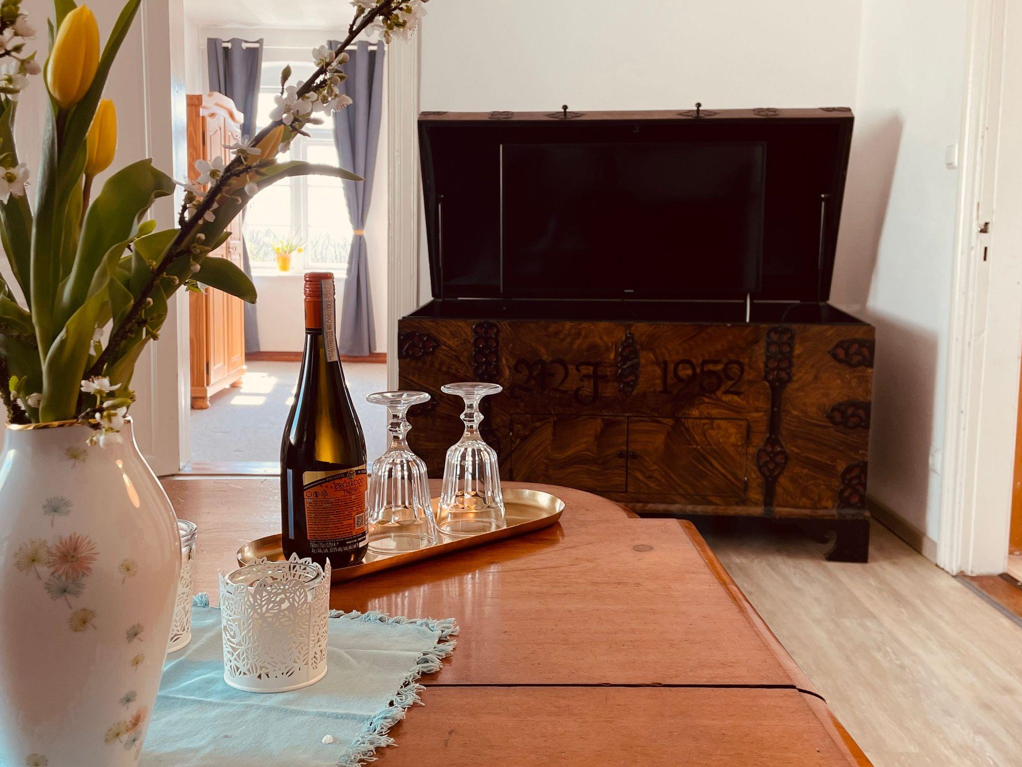 Die Einrichtung ist in einem klaren Stil gehalten, der durch antike Landhausmöbel akzentuiert wird. Die Räume sind hell, die Sonne begrüßt einen zum Frühstück und schaut zum Abend nochmal in die Schlafräume. Zudem bietet die Wohnung einen schönen, weiten Blick in den großen Garten.