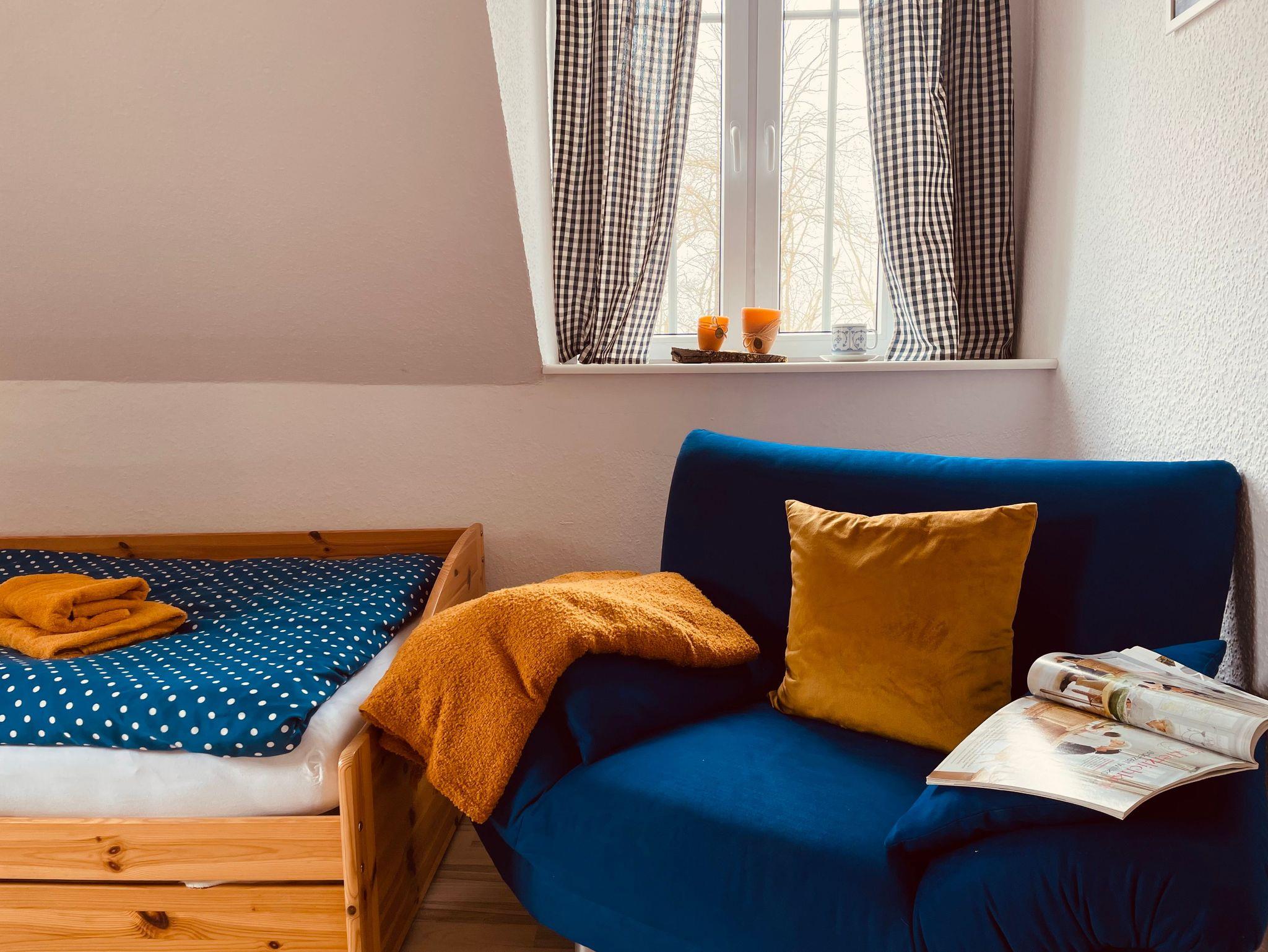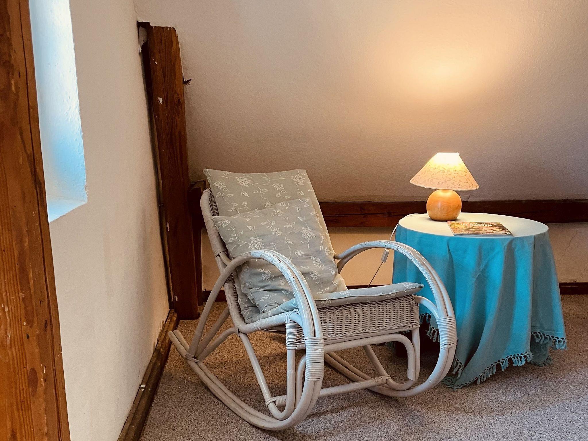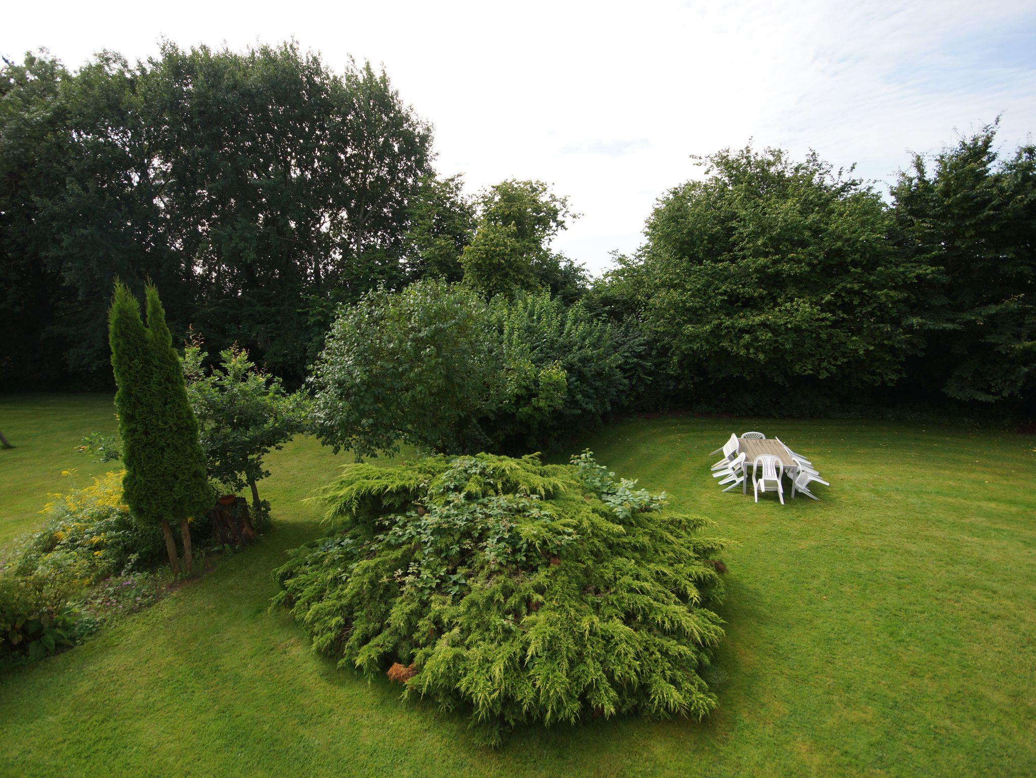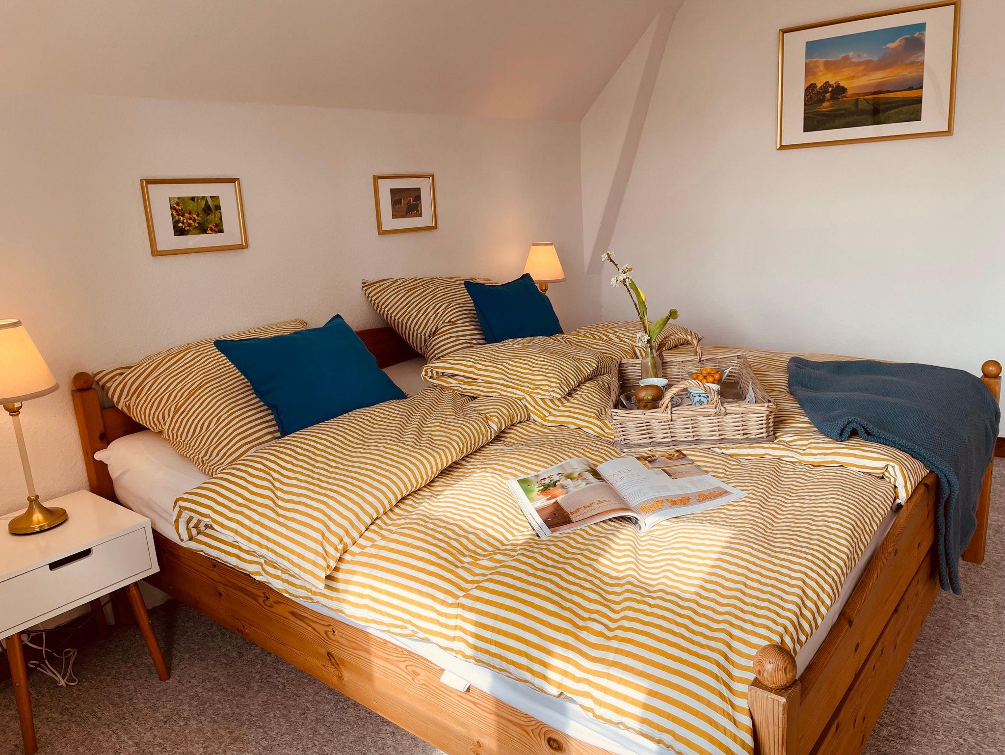 Die Einrichtung ist in einem klaren Stil gehalten, der durch antike Landhausmöbel akzentuiert wird. Die Räume sind hell, die Sonne begrüßt einen zum Frühstück und schaut zum Abend nochmal in die Schlafräume. Zudem bietet die Wohnung einen schönen, weiten Blick in den großen Garten.