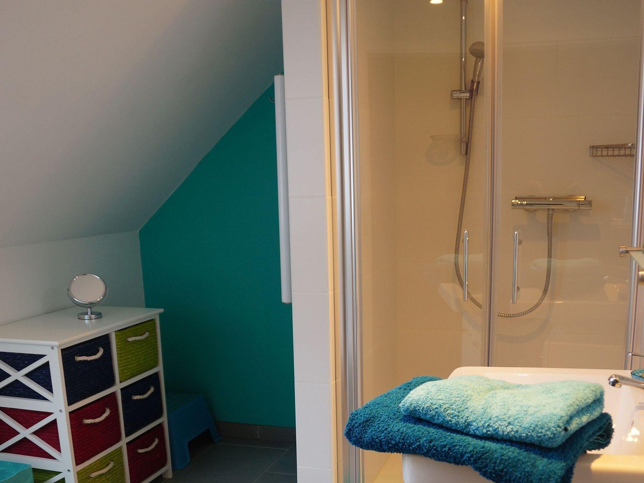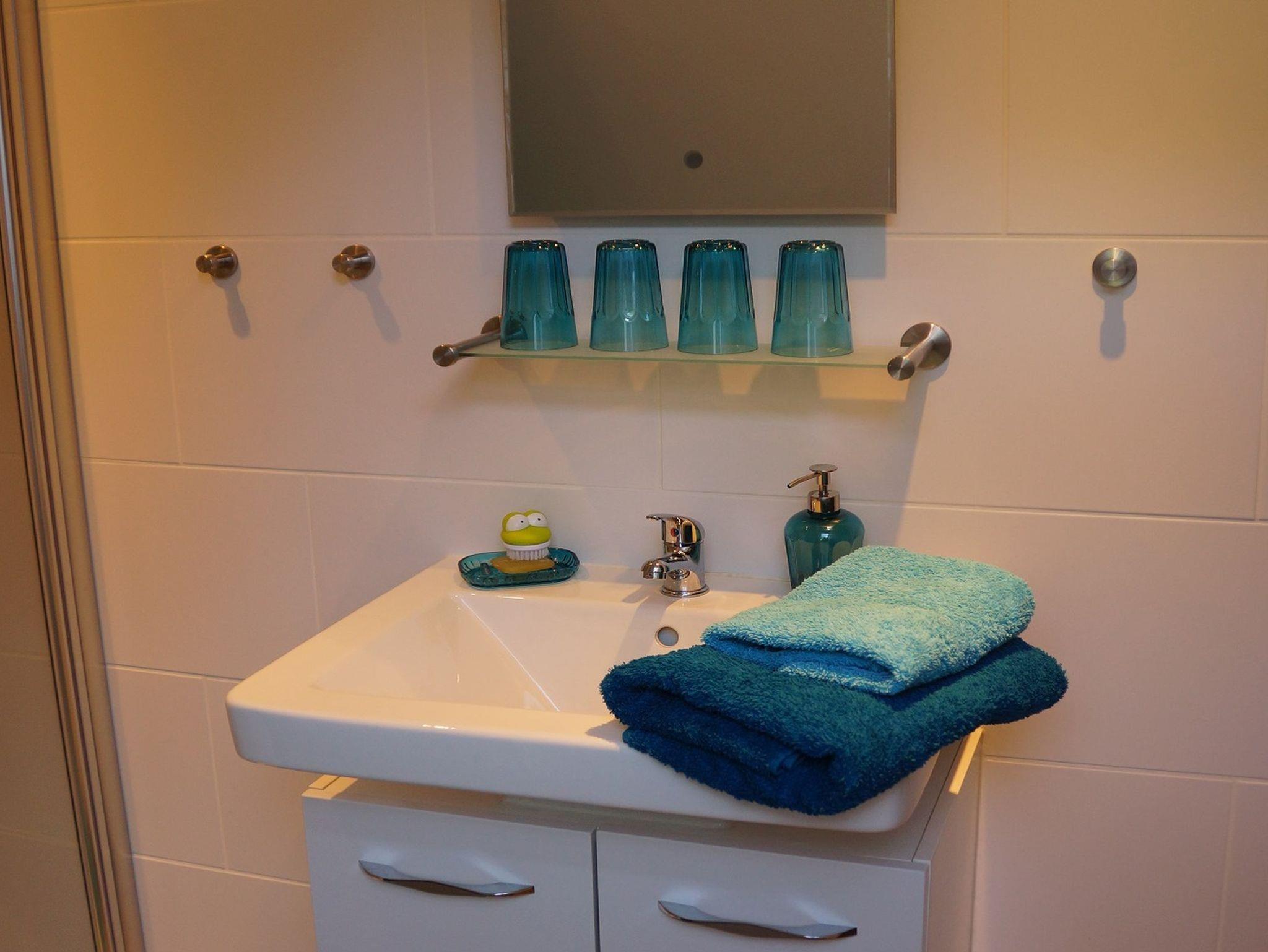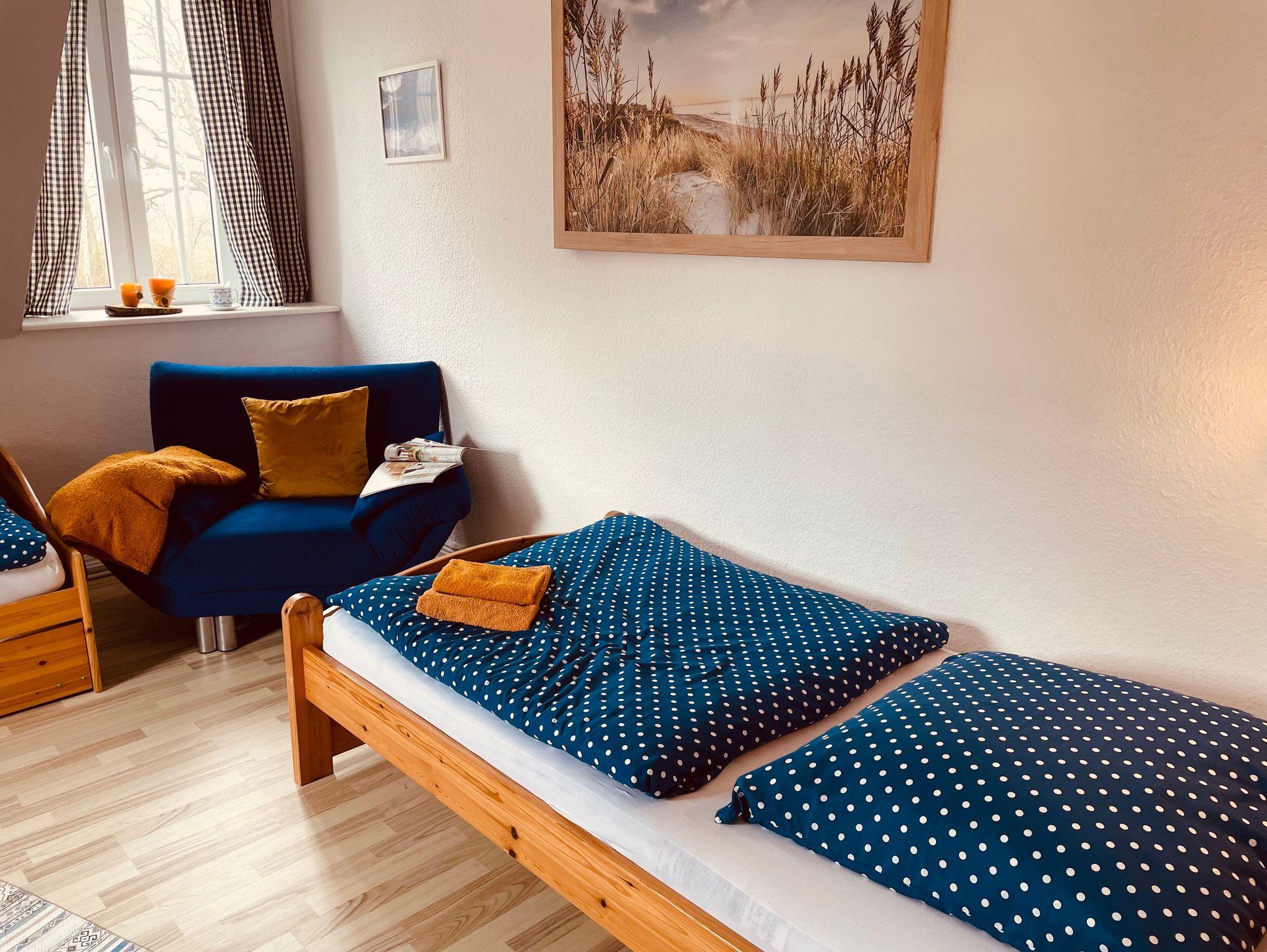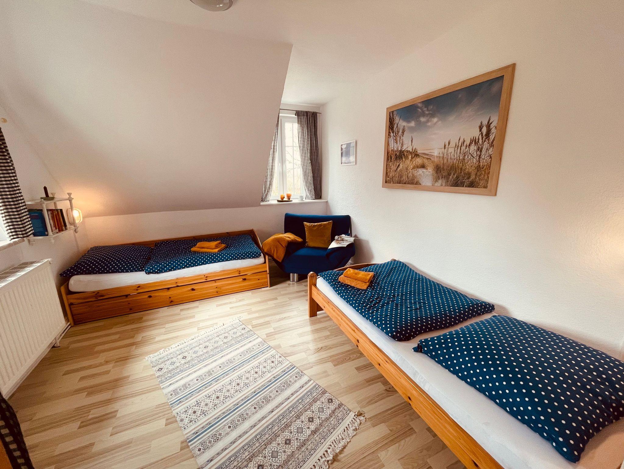 Die Wohnung Weitblick befindet sich im ersten Obergeschoss auf der rechten Seite des Hauses. Sie verfügt über eine großzügige Wohnküche, einem Duschbad, einem Schlafzimmer mit Doppelbett und ein weiteres Schlafzimmer mit zwei Einzelbetten.
