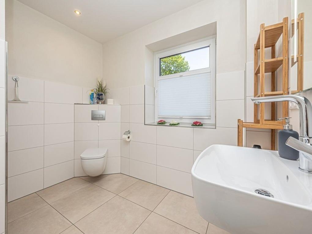 Geräumiges, gefliestes Badezimmer mit bodengleicher Dusche, Föhn, Parkettboden