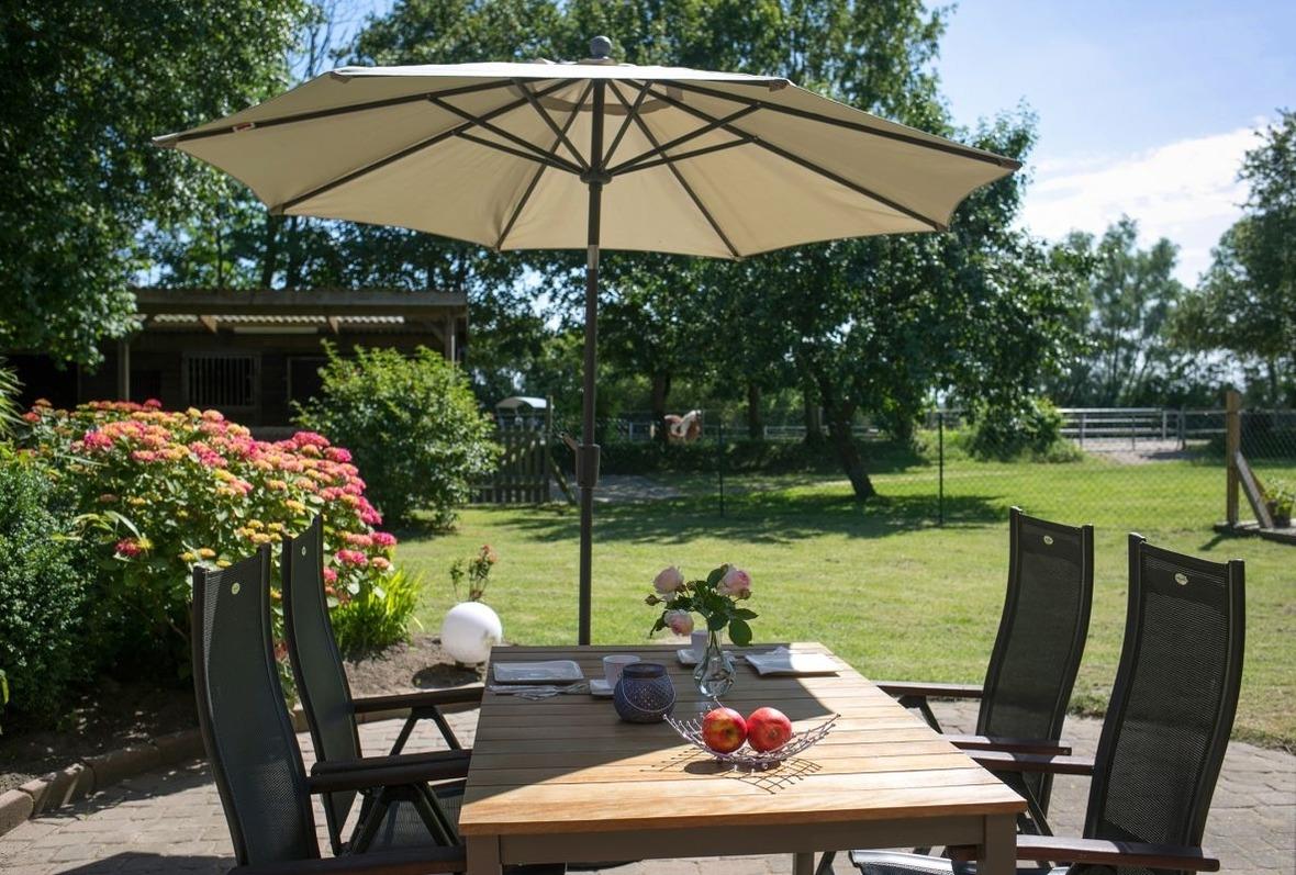 Die Ferienwohnung liegt im Erdgeschoss mit idyllischem Blick in den Garten und Pferdestall.