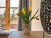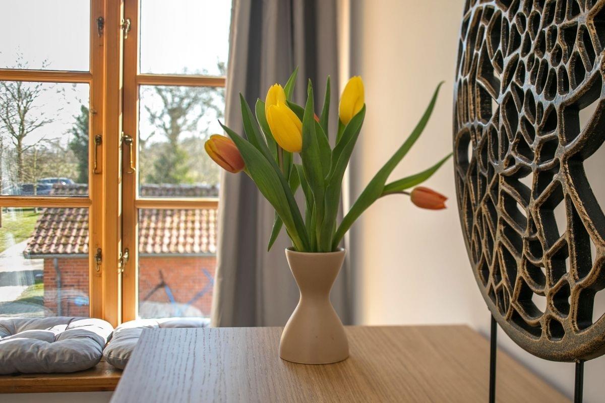 Die Ferienwohnung liegt im Obergeschoss mit idyllischem Blick in den Garten, Weiden und Pferdestall.