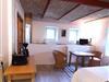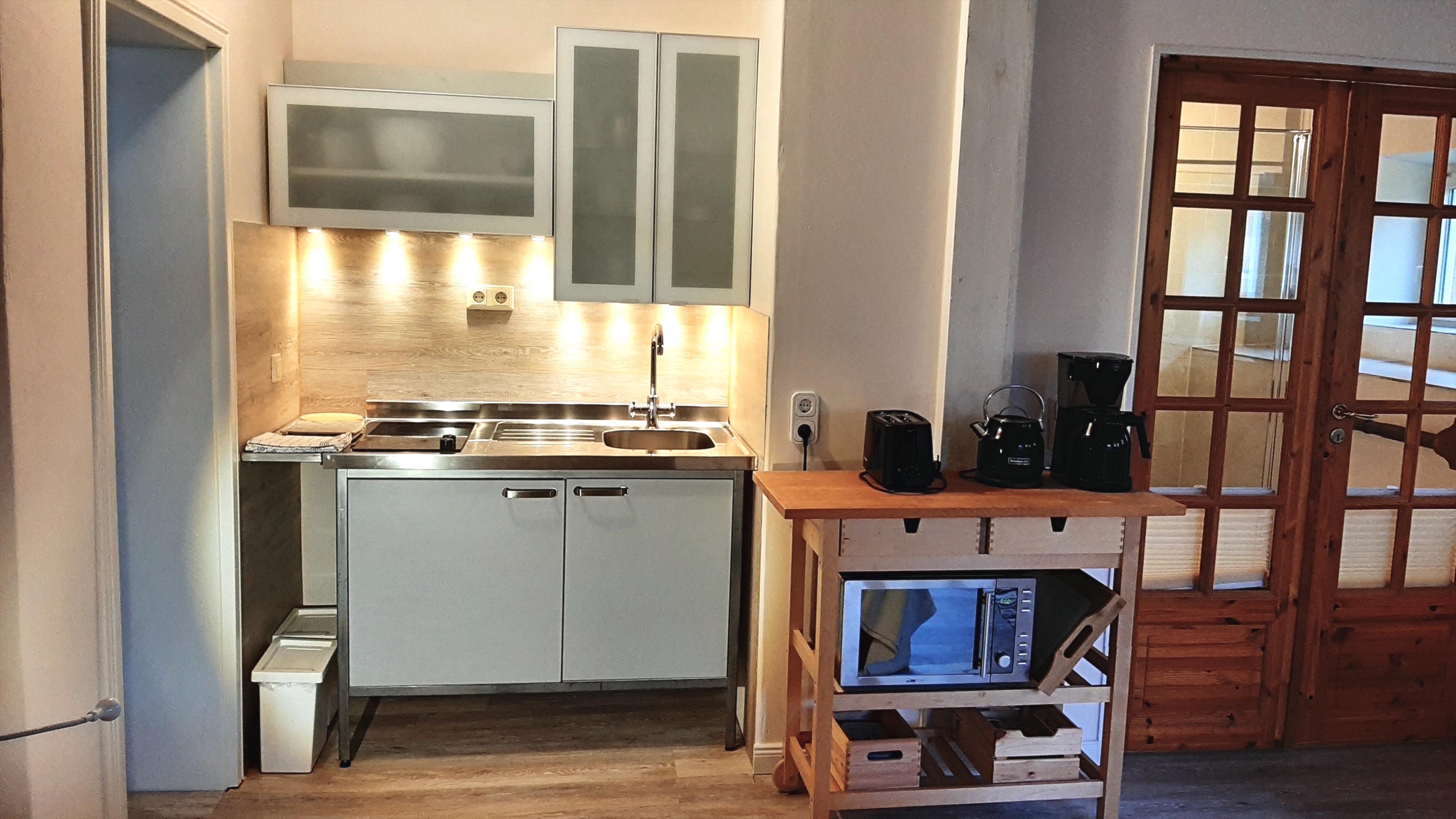 Die Küchenecke ist ausgestattet mit einem Zwei-Feld-Ceranherd, Spüle und Kühlschrank, Mikrowelle, Kaffeemaschine, Wasserkocher, Toaster, Geschirr und Besteck.