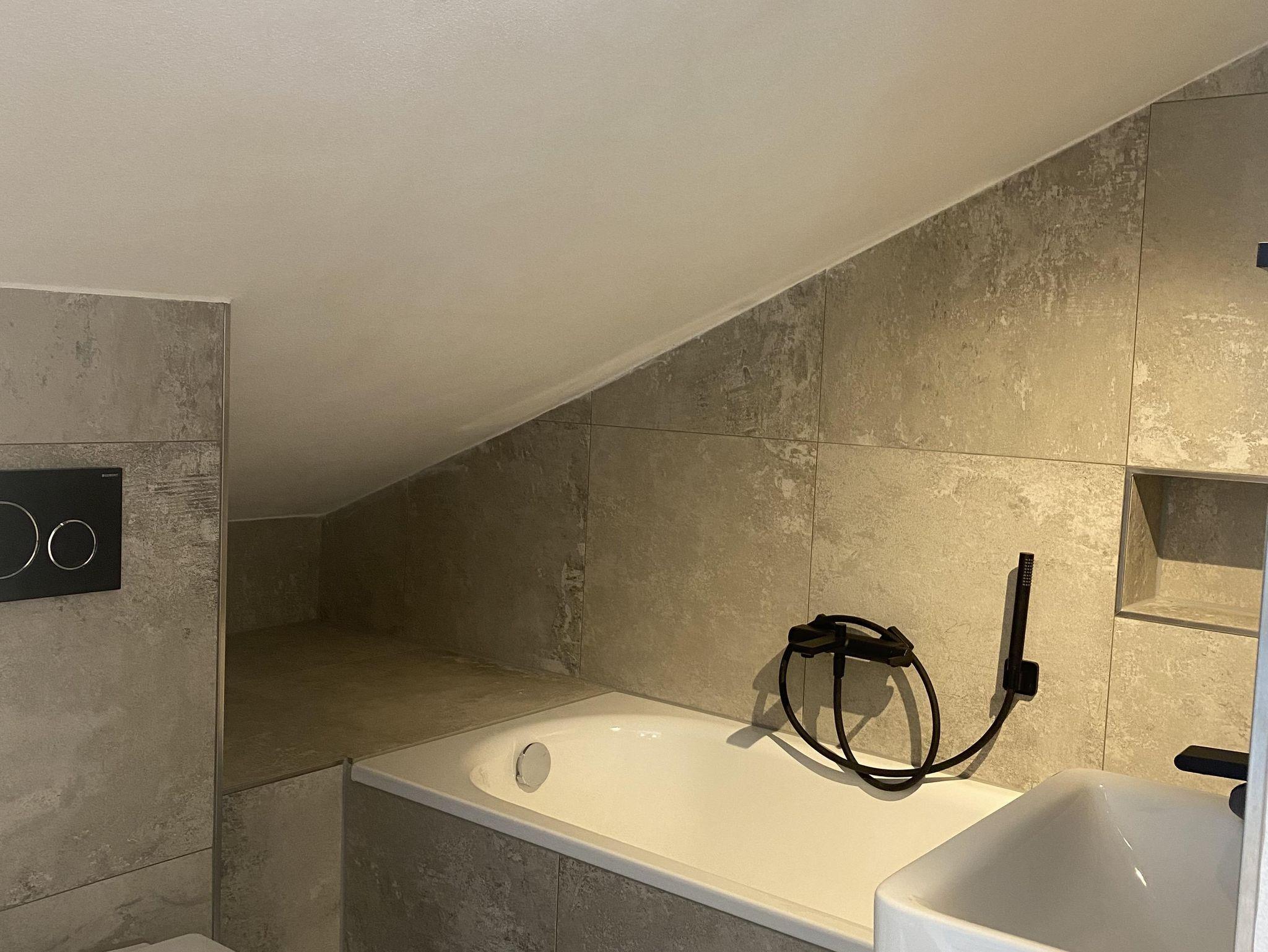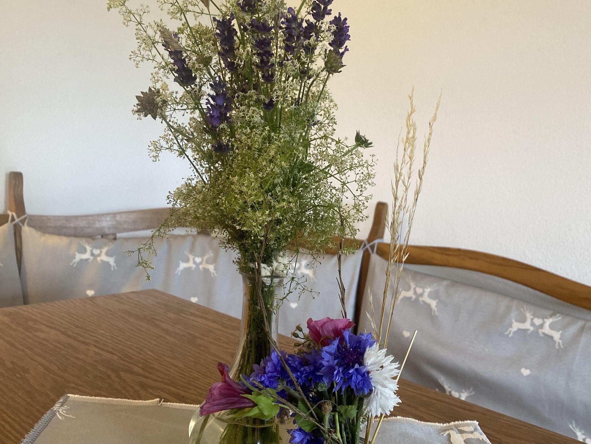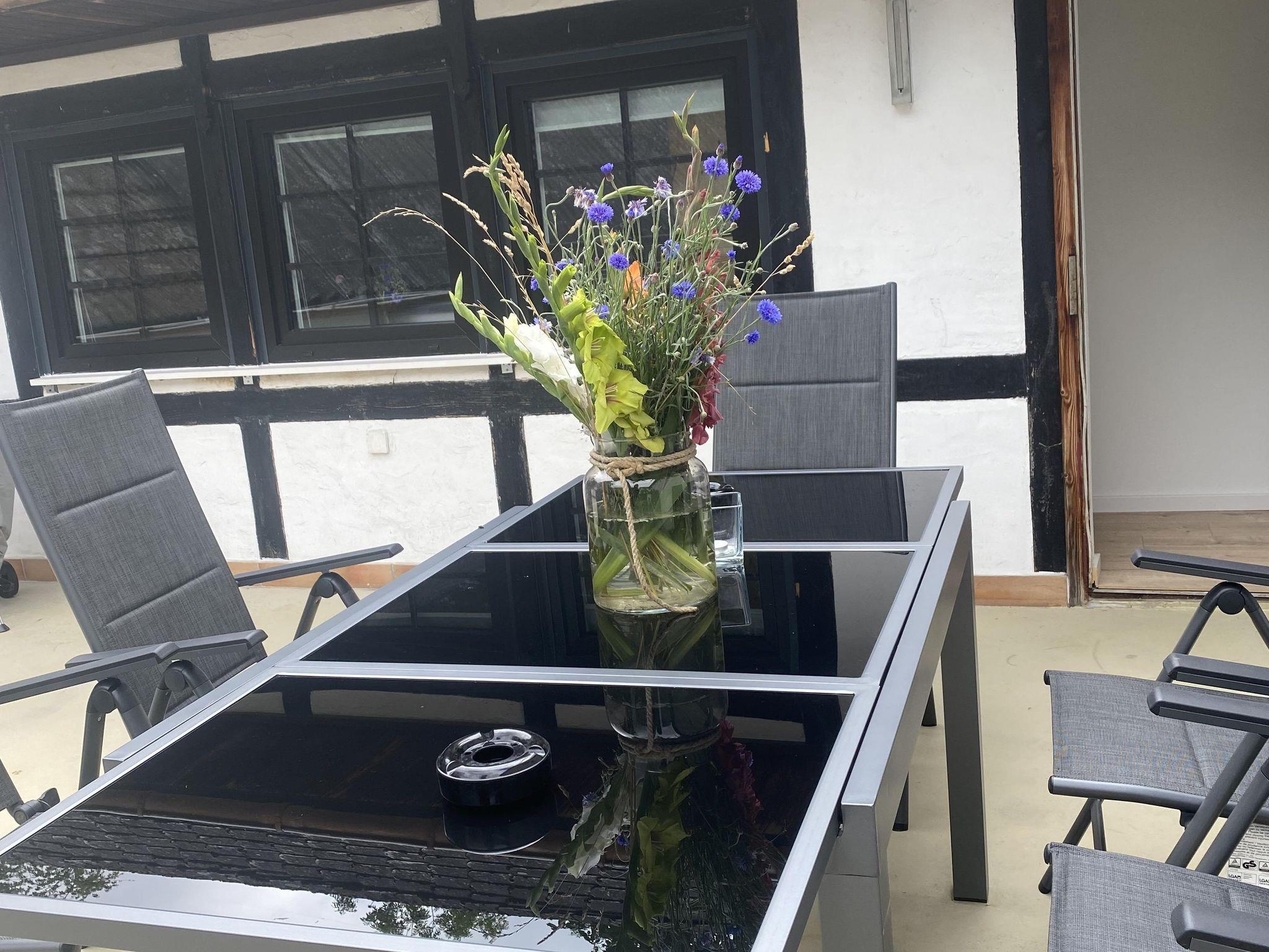 Neben dem privaten kleinen Sitzplatz direkt am Bachbett, stellt die großzügige Dachterrasse das zweite Highlight. Die Terrasse bietet einen tollen Blick in den schönen Innenhof des Anwesens Steinmühle und hat Sitzgelegenheiten für 8 Personen.