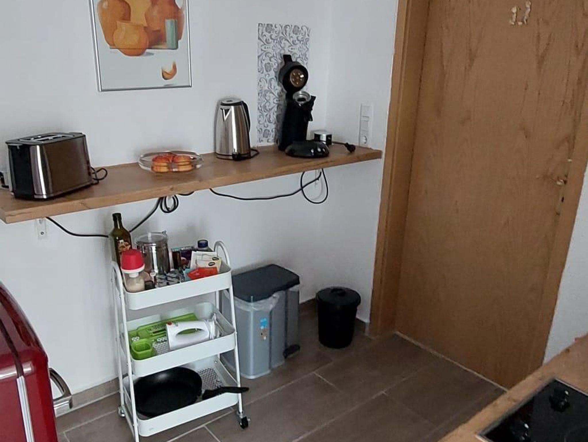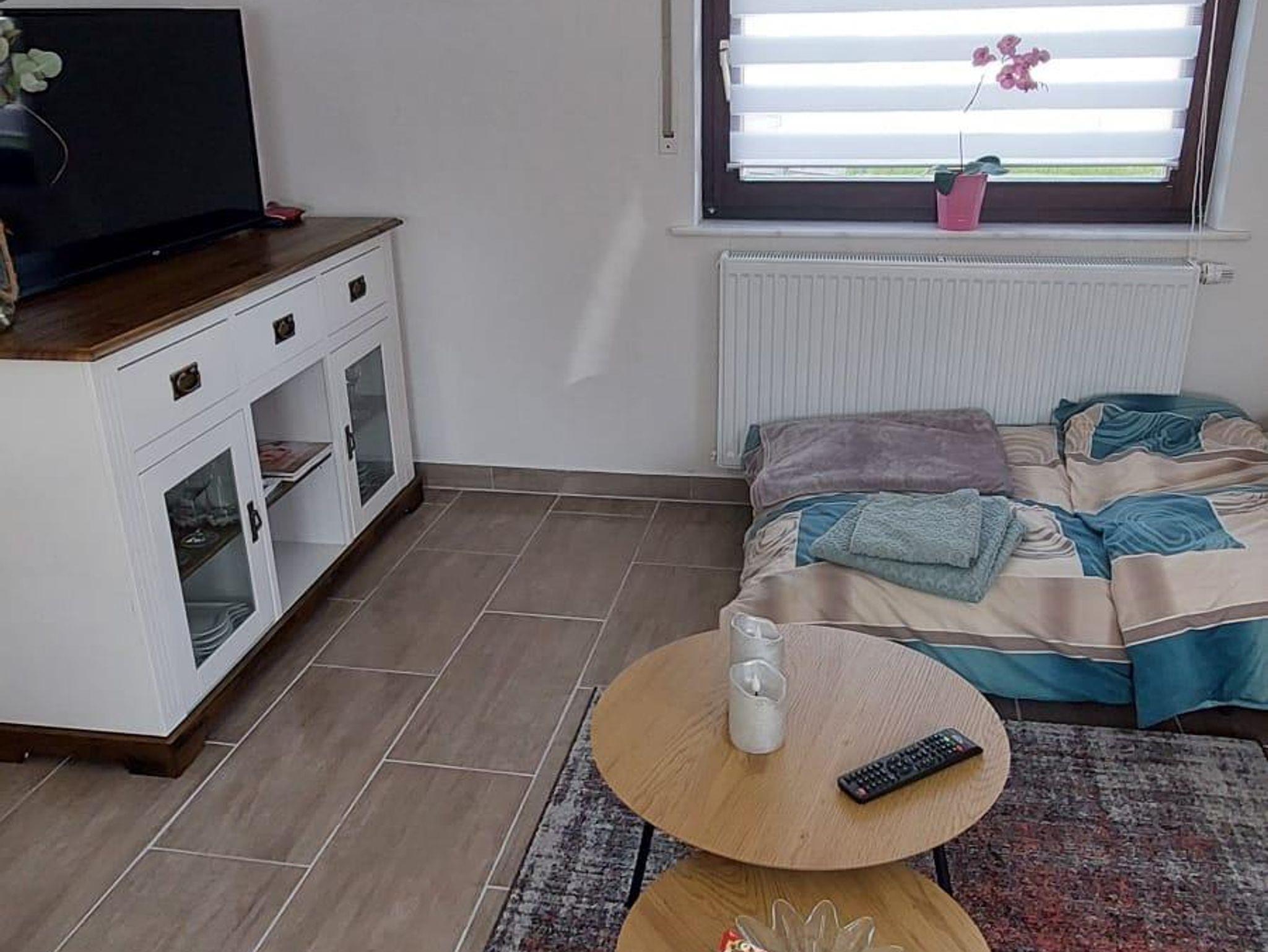Die Wohnung befindet sich in der erste Etage mit fantastischem Ausblick und ist über eine Wendeltreppe zu erreichen. Sie besteht aus zwei Zimmern. Das große Wohnzimmer mit TV und Essbereich hat für eine zusätzliche Personen eine Betttruhe. Das Schlafzimmer ist mit TV ausgestatt und einem Doppelbett. Die Kochnische ist komplett ausgestattet, von Herd über Spülmaschine bis Kühlschrank mit kleinem Gefrierfach und vielem mehr. Ein geräumiges Badezimmer rundet die Ferienwohnung ab. Der Innenhof mit Beschattung und Gartenstühlen kann genutzt werden. Auf Anfrage stellen wir auch gerne unseren Grill zu Verfügung. Die Wohnung ist eine Nichtraucherwohnung, daher ist das Rauchen nur im Außenbereich gestattet. Ein Aschenbecher steht im Innenhof zur Verfügung.