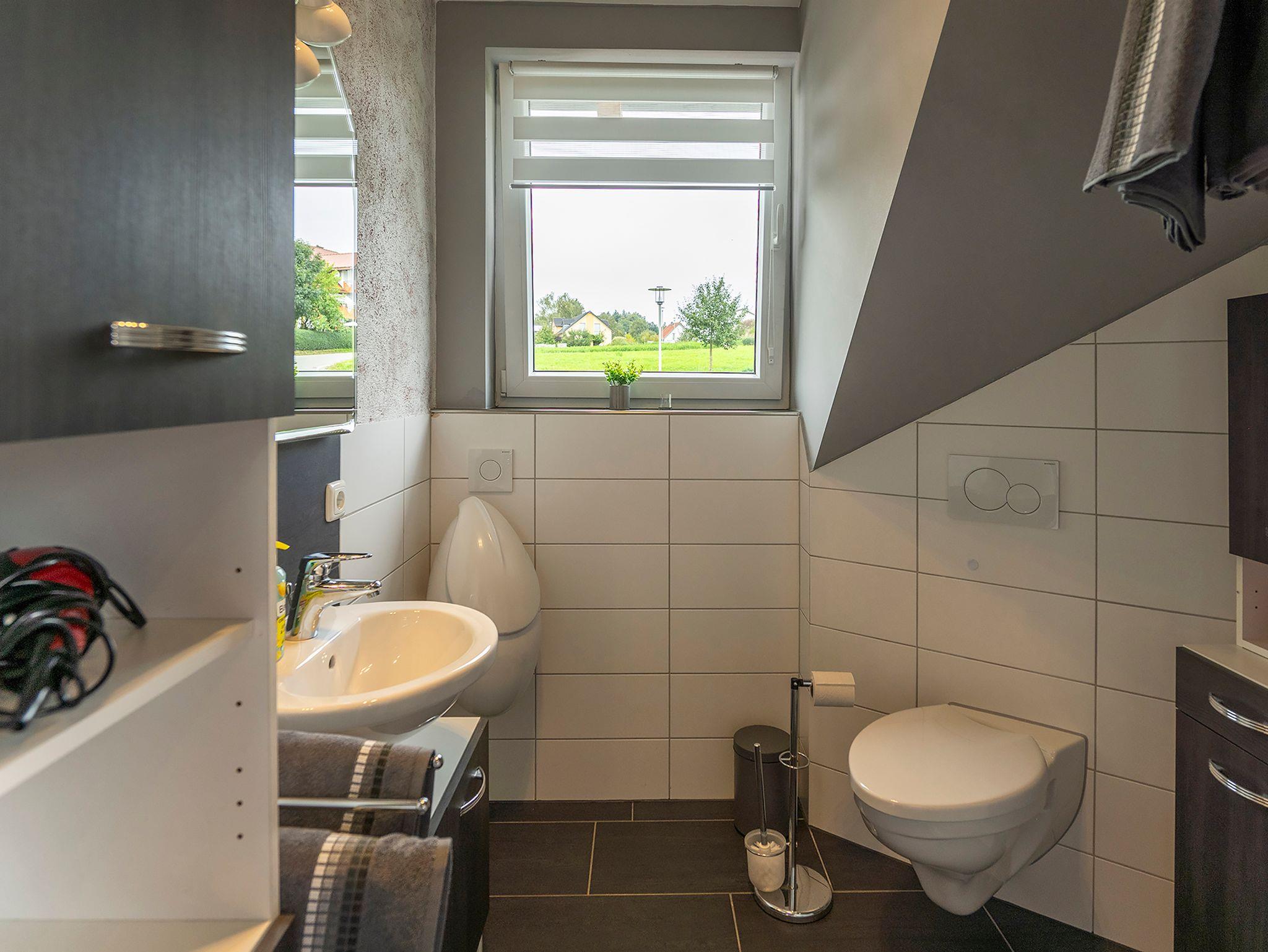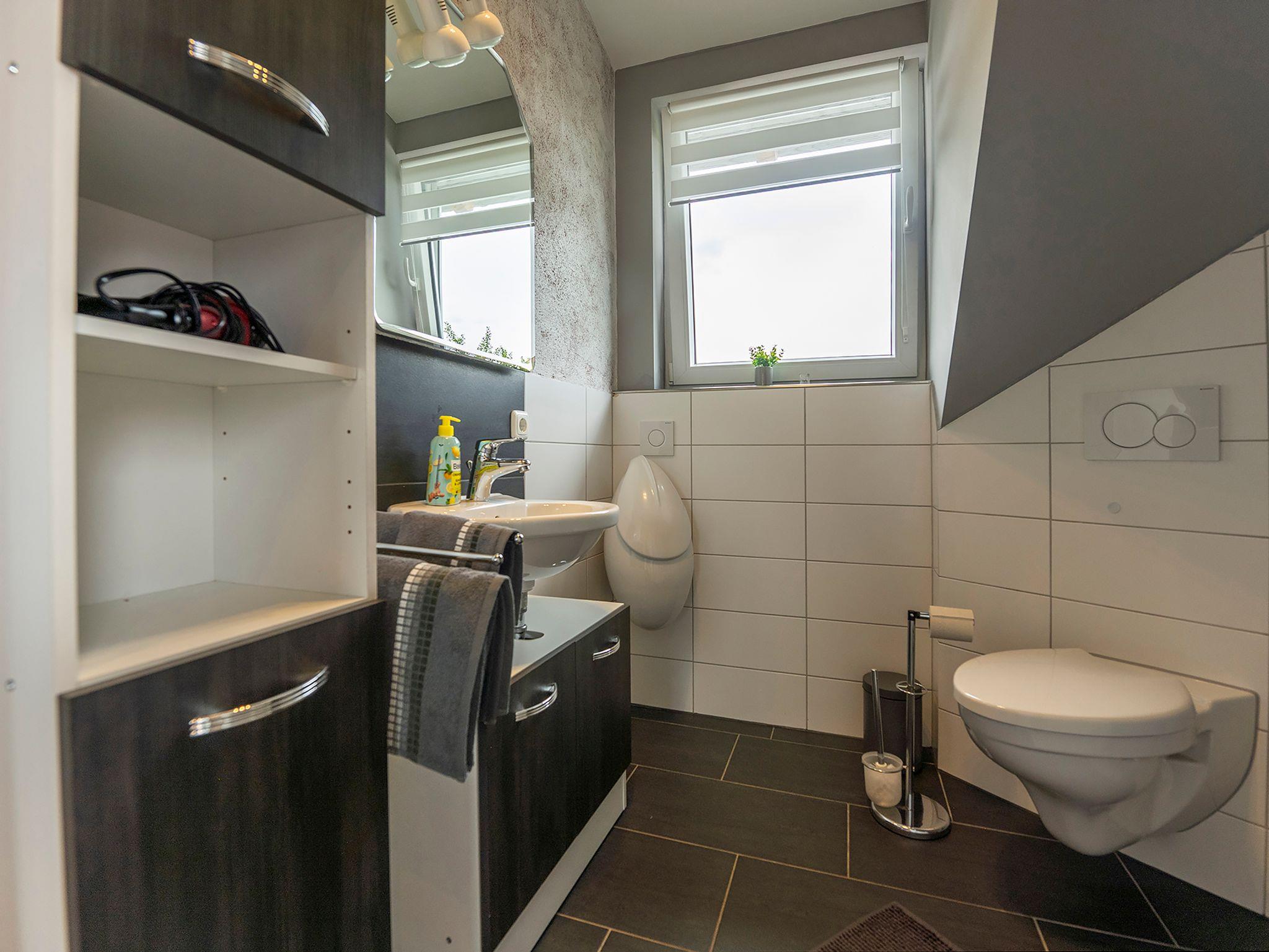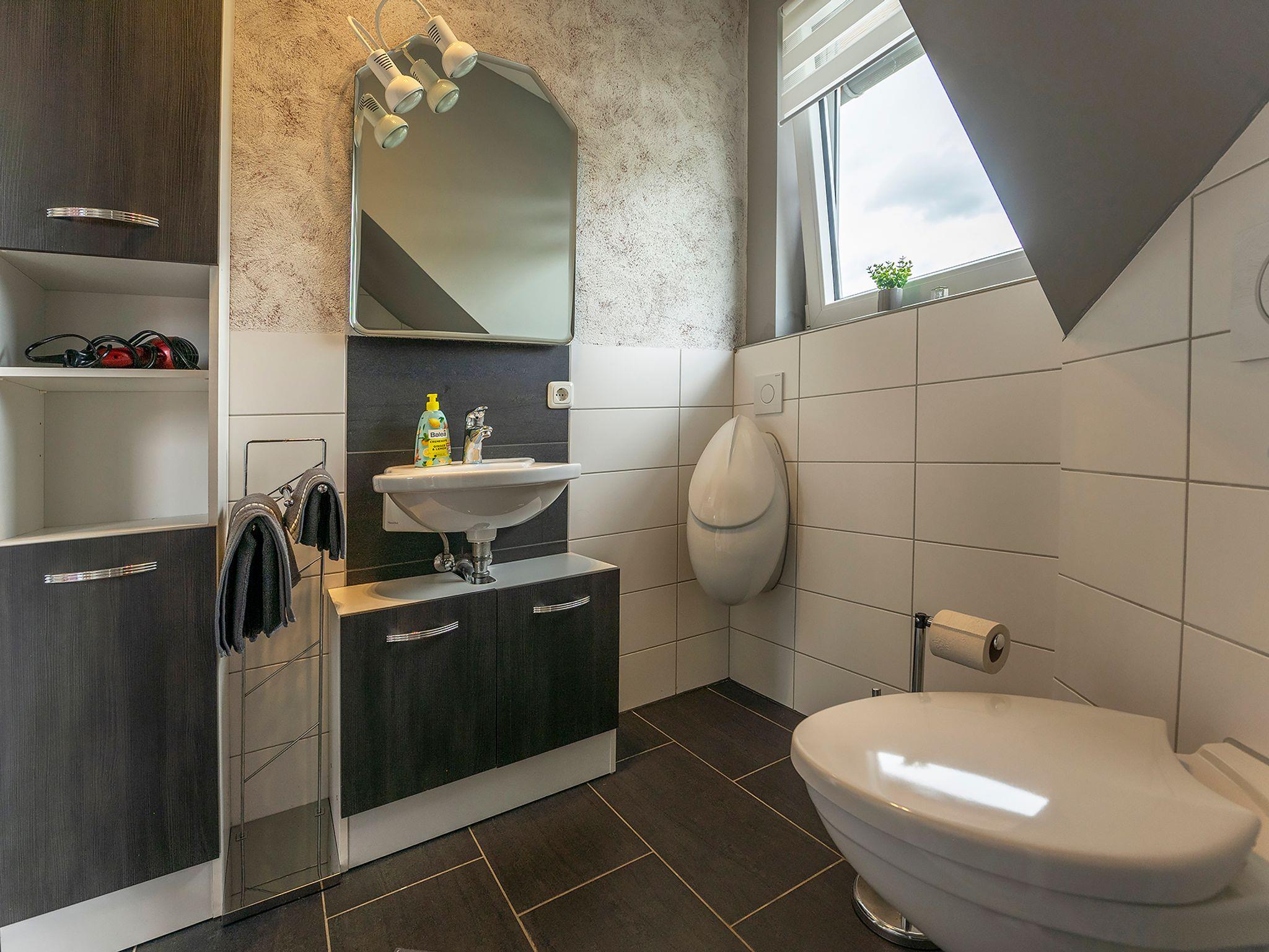 Im Badezimmer findet man die Dusche mit WC und Pissoir. Zur Badezimmerausstattung zählt hier ein Fön und Handtücher.