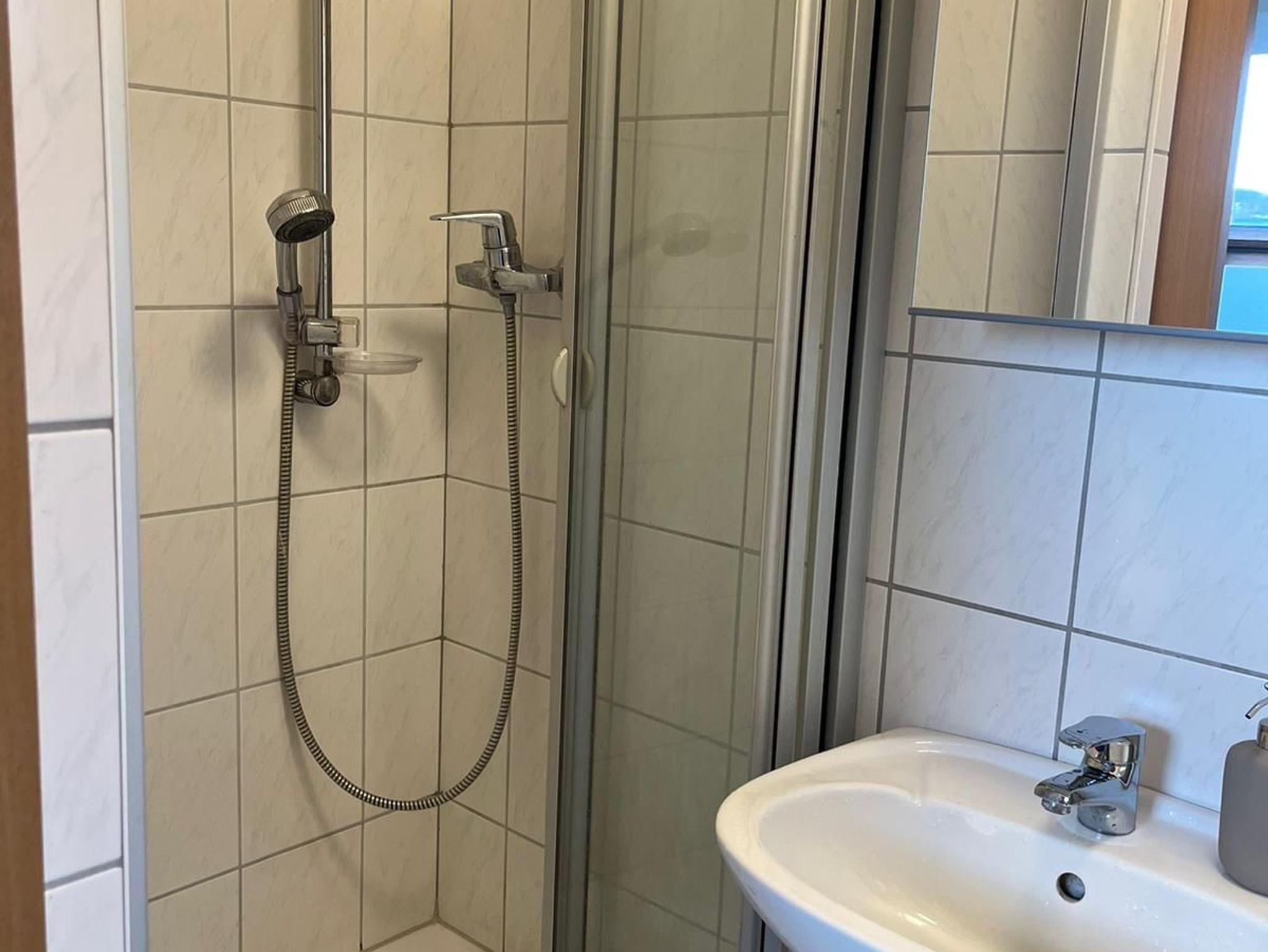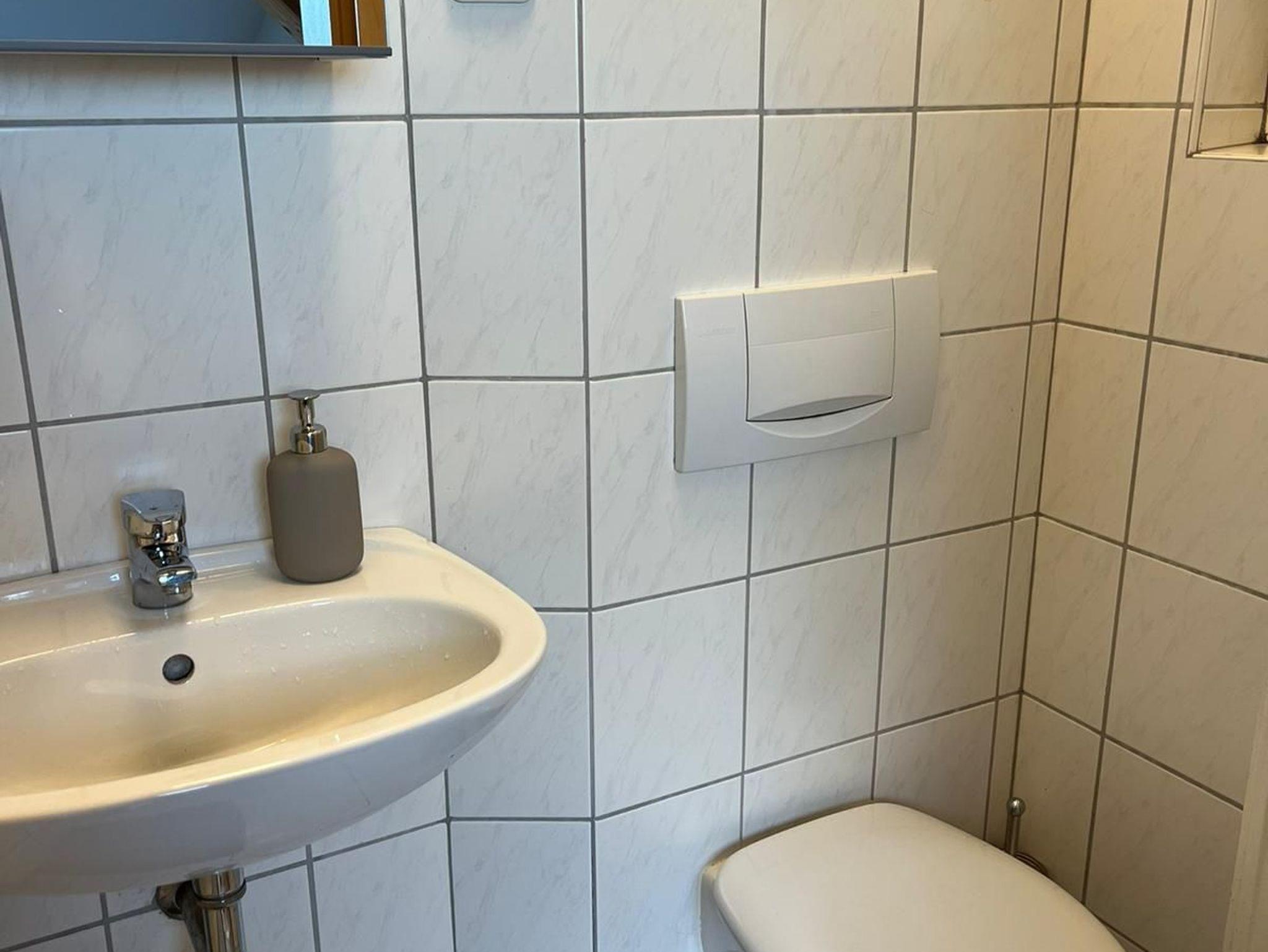 Im kleinen gemütlichen Badezimmer befindet sich ein Waschbecken mit Spiegelschrank, eine Toilette und eine Dusche.