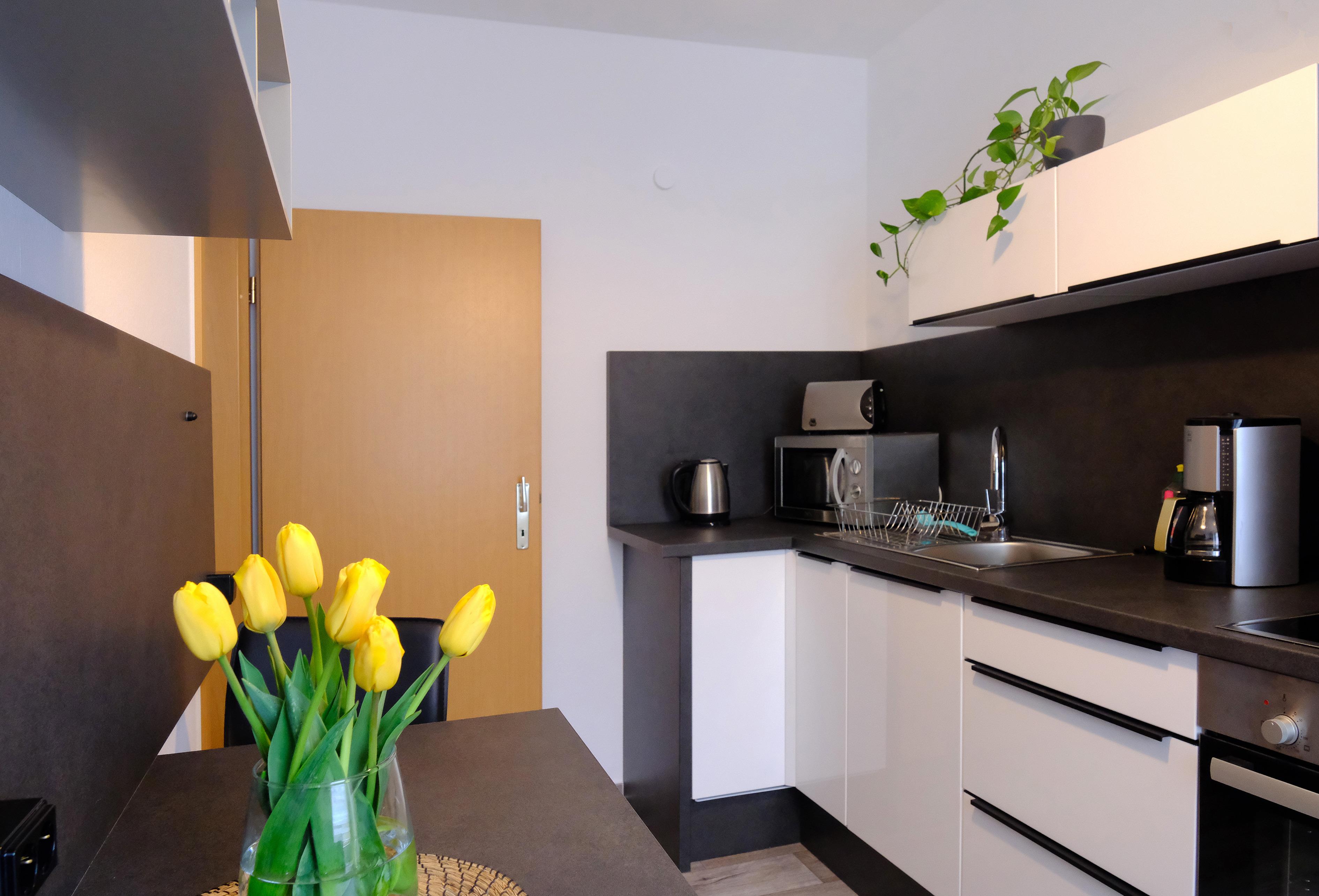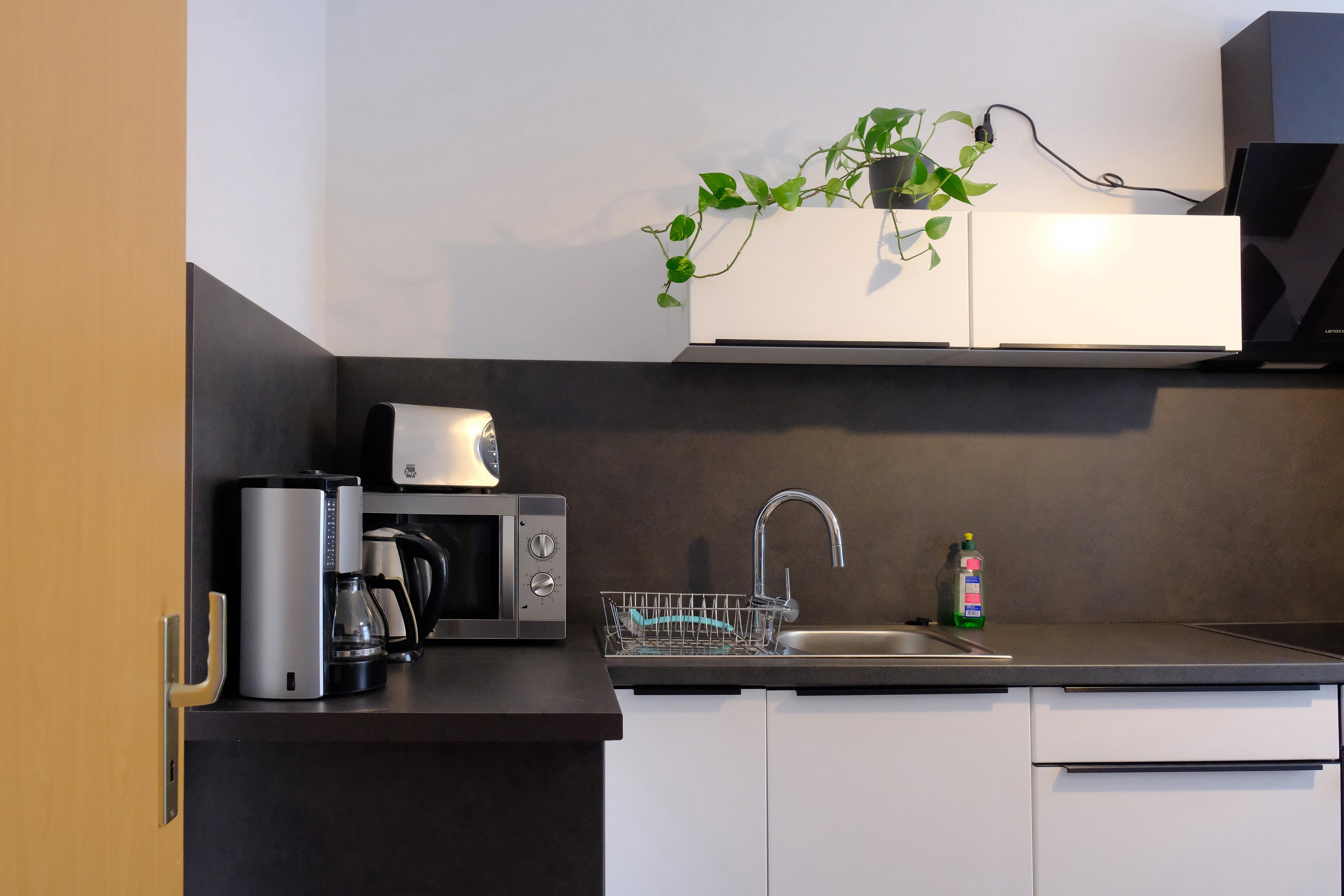 Die Küche verfügt über alle notwendigen Kochutensilien z.B. Kühlschrank, Wasserkocher, Herdplatten, Töpfe, Teller, Tassen, Besteck usw. Diese sind in einer Einbauküche untergebracht. Es ist eine Grundausstattung an Öl, Salz, Zucker und diversen Gewürzen vorhanden. Außerdem können bis zu 3 Personen an den vorhandenen Tisch bequem das Essen vorbereiten.