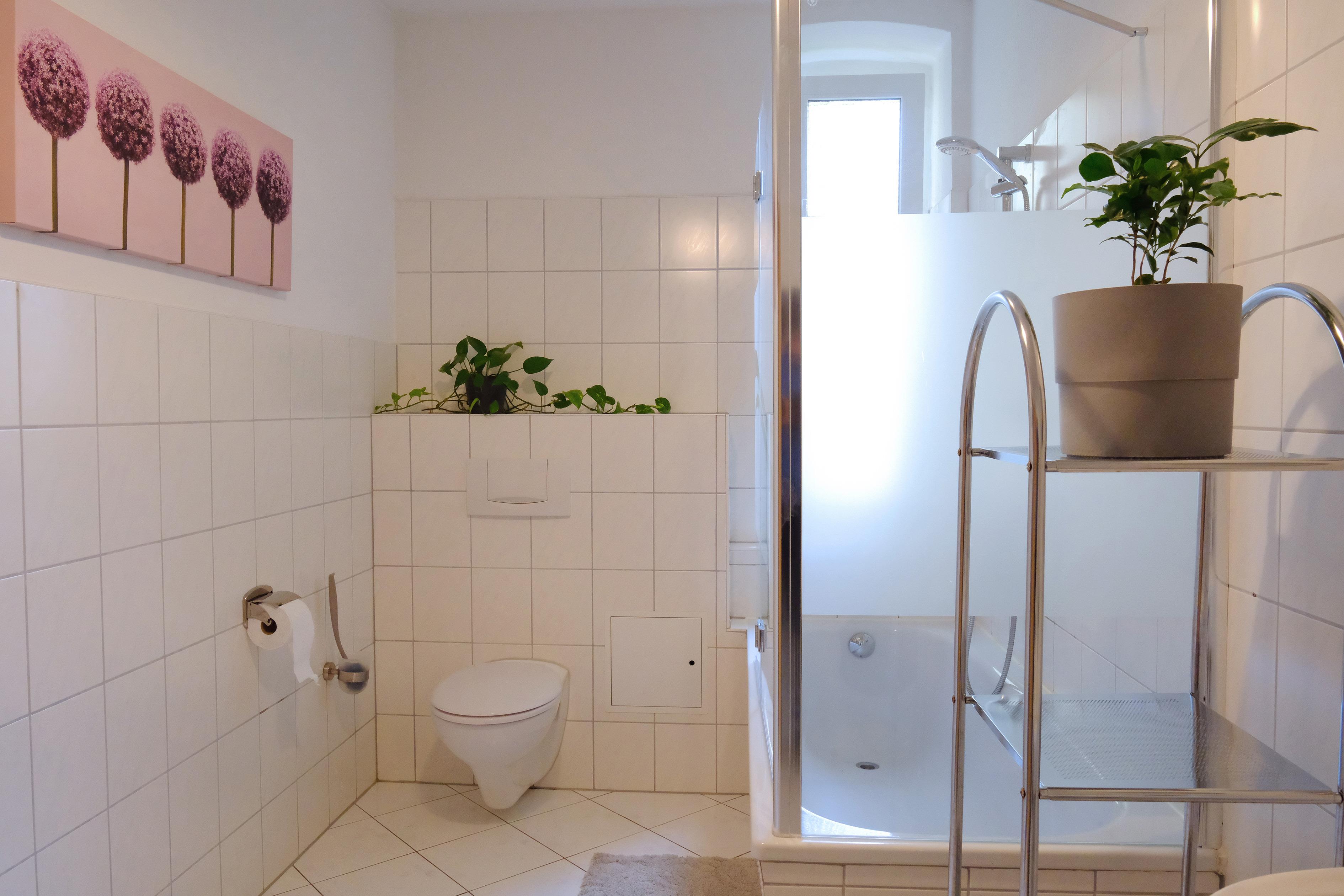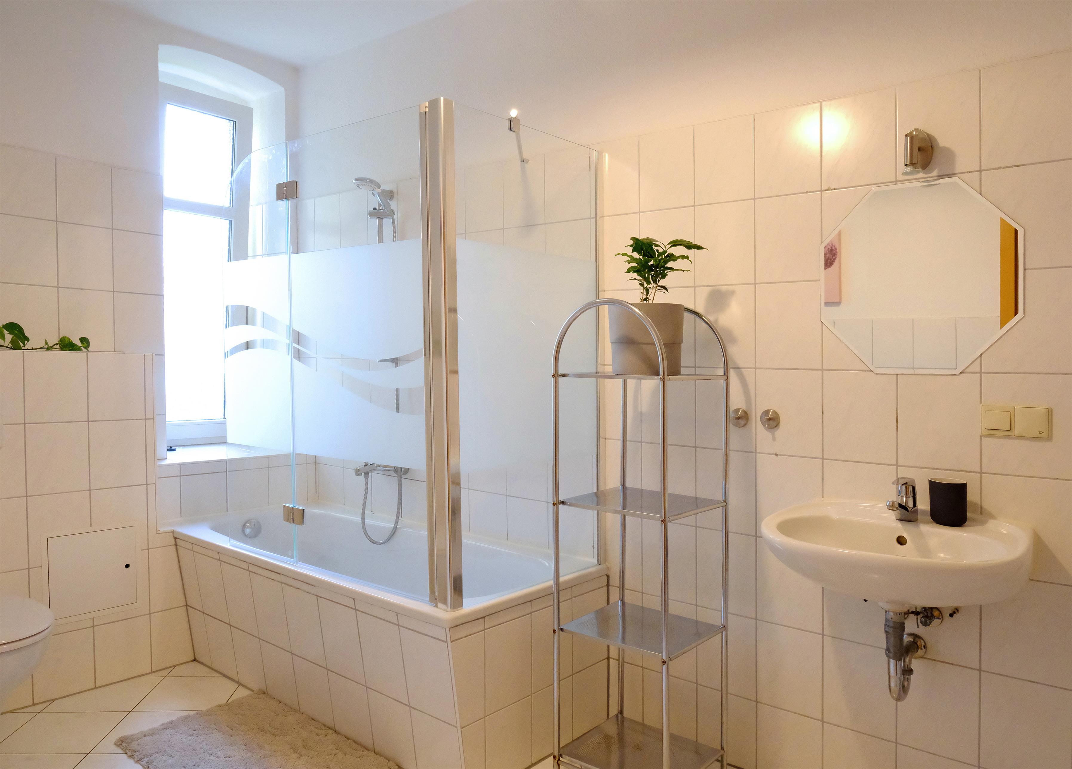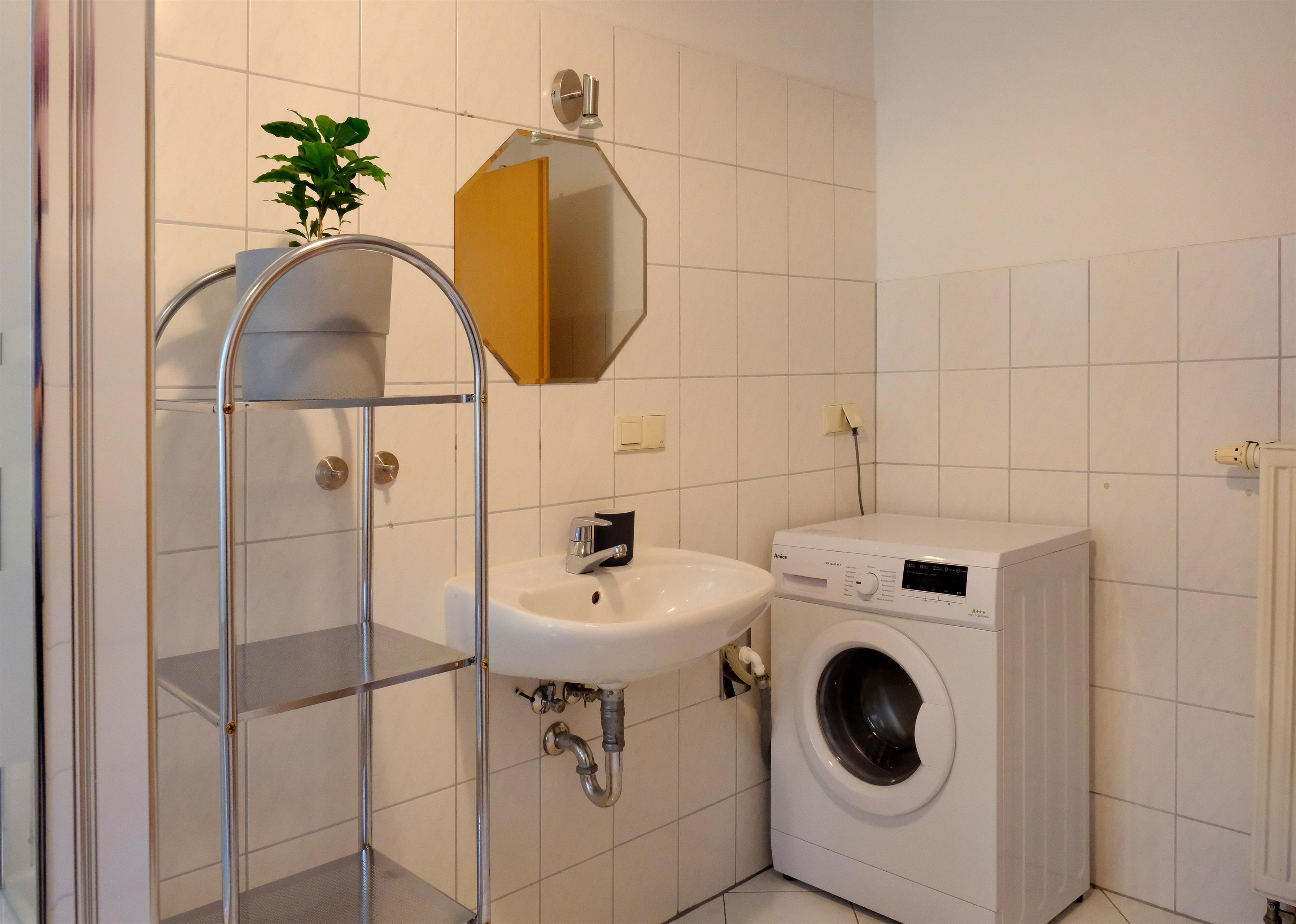 Im Badezimmer ist die Waschmaschine und ein Wäscheständer untergebracht. Dort befindet sich ein Waschbecken mit Spiegel und eine Badewanne in der auch geduscht werden kann.