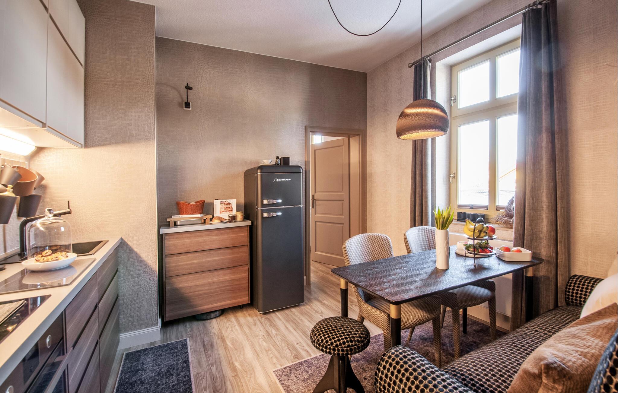 Denne stilfulde ferielejlighed ligger roligt i centrum af Gernrode i et overdådigt renoveret byhus. Lejligheden er indrettet med stor sans for detaljer og udvalgte møbler og er ideel til et par, der gerne vil tilbringe et par afslappende dage sammen i smukke omgivelser. I det hyggelige køkken med spiseplads kan I spise sammen om aftenen eller tilbringe selskabelige aftener. Fra soveværelset med store dobbeltdøre kommer I ind i den skønne stue med stor fladskærm, som også kan bruges fra dobbeltsengen i soveværelset.