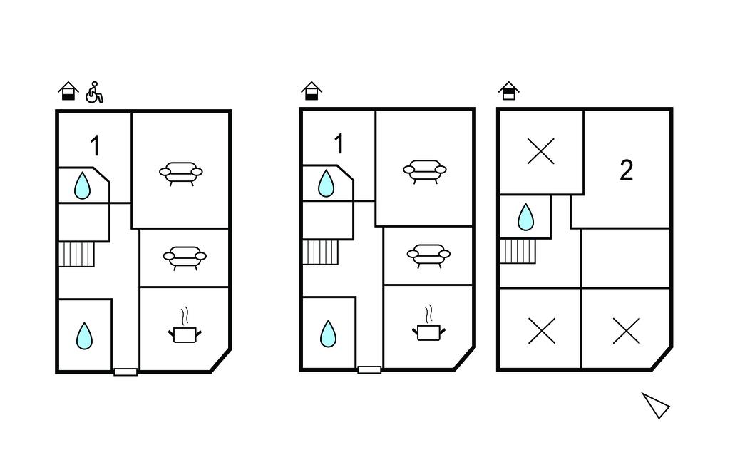Fra entréen til dette halve dobbelthus kommer I ind i en rummelig gang med brændeovn og tilstødende opbevaringsrum. Stuen i samme etage har gennemgang til spisestuen, hvorfra I kommer videre til køkkenet med træpilleovn. Nederst er der også badeværelse med kar og soveværelse med egen bruser. Ligesom stueetagen kan dette soveværelse nås i kørestol. Bruseren her er udstyret med et foldesæde og toilettet med en stang. Sengen er dog ikke tilpasset. Over for huset er der en lille eng med træbænke. I må gerne sætte jer ud i haven, hvor der også er en strandkurvestol og en plæne med bekvemme havemøbler.