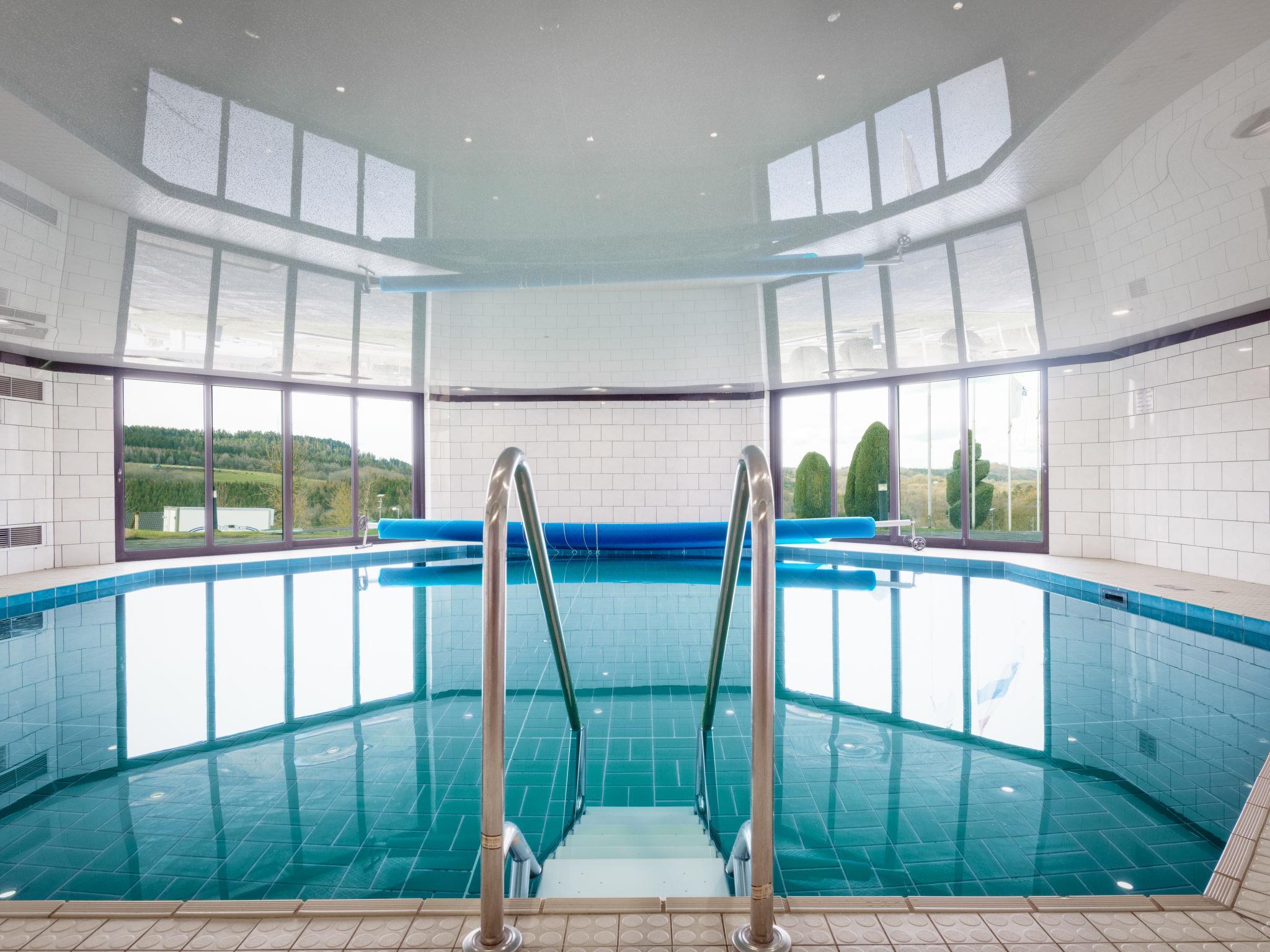 Resort "Waldferienpark Gerolstein". Outside the resort, 3 km from the centre of Gerolstein, in a secluded, quiet position on top of a hill, 100 m from the edge of the forest, 24 km from the lake, 100 m from the stream, in the countryside. For shared use: indoor pool heated (70 m2, depth 130 cm) with internal staircase. Shower/WC in the pool area, children's playground (slide, swing, sandbox), petting farm. Private: garden with lawn. In the complex: restaurant, bar, breakfast room, lounge, billiard table, trampoline, sun terrace. Bread roll service possible (extra). Stepped path to the house. Parking on the premises. Shop 3 km, grocery 2.5 km, supermarket 2.5 km, shopping centre 3 km, bicycle rental 6 km, bus stop "Gerolstein" 3 km, railway station "Gerolstein" 3 km, outdoor swimming pool 3 km, bathing lake 3.2 km. Golf course (18 hole) 18 km, tennis 3 km, minigolf 50 m, riding stable 4 km, walking paths from the house 50 m. Nearby attractions: Kylltal, Burg Eltz. Well-known lakes can easily be reached: Pulvermaar 24 km. Please note: car recommended. The forest holiday park also has air hockey and outdoor chess. Facilities for shared use (some extra). Wood for the fireplace in the properties can be purchased at reception for an additional charge.
