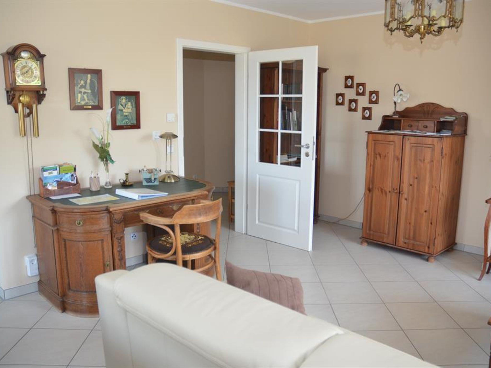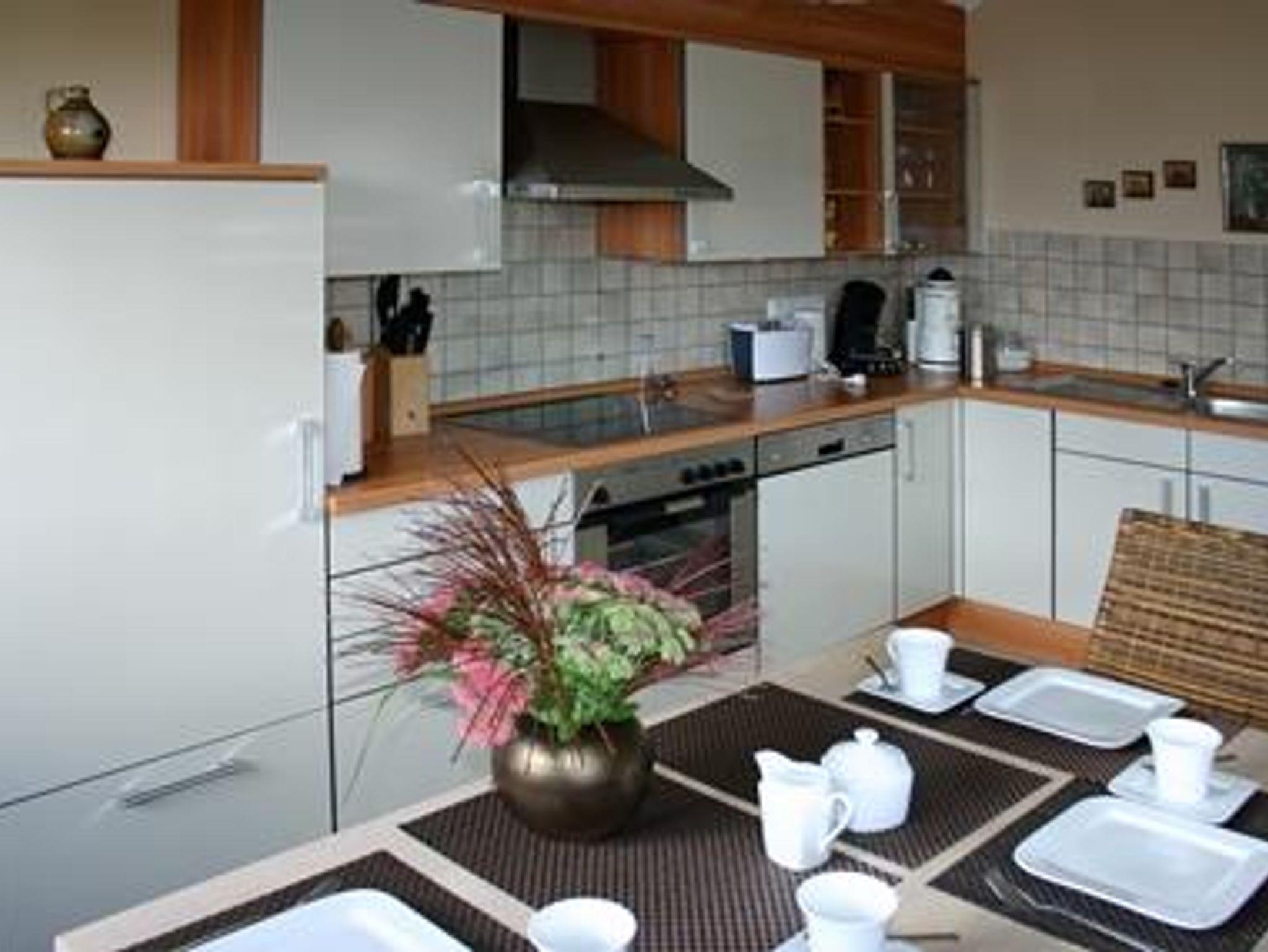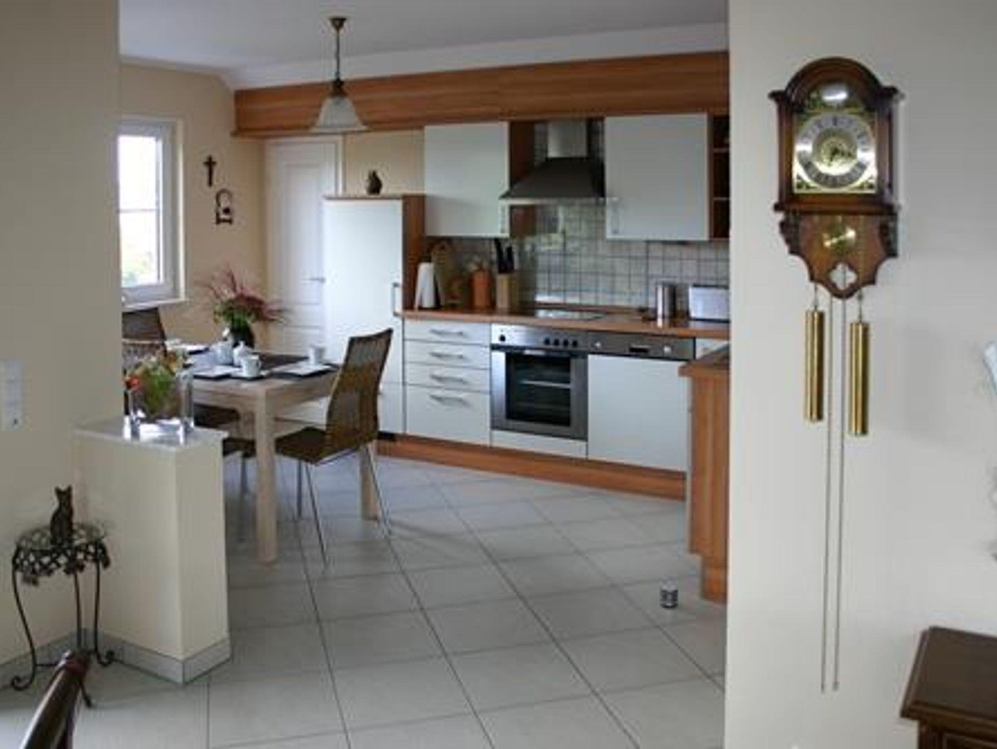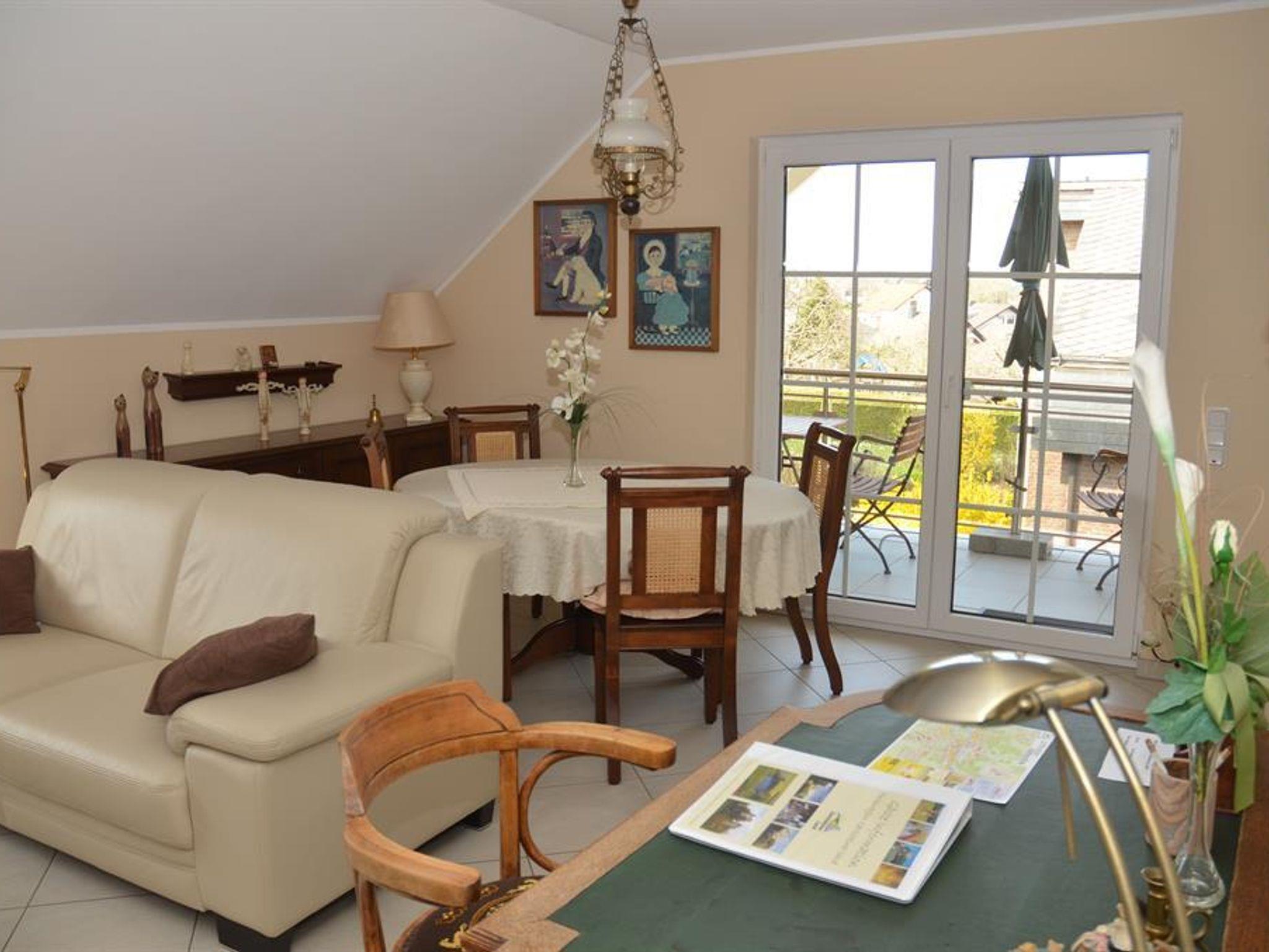 Die Ferienwohnung liegt im ersten Stock unseres Hauses. Es erwartet Sie auf 90 qm eine Komfort-Wohnfühloase, in der bis zu 4 Personen den Alltag hinter sich lassen können. Nach einem langen, aktiven Tag haben Sie im großen Wohnzimmer bei einem Buch, einem Film (Sat-TV mit Flachbildschirm) Gelegenheit herrlich zu entspannen. Wenn Sie gerne kochen, wird dies in unserer komplett ausgestatteten Einbauküche zum Kinderspiel. Vom 5-Platten-Ceranfeld über Backofen, Mikrowelle, Kühlschrank, Geschirrspüler, Gefrierschrank, Kaffeemaschine, Toaster, Eierkocher, Bratpfannen, Kochtöpfe bis hin zum Profimesser ist alles vorhanden. Die Mittags- und Abendsonne genießen Sie auf dem mit Teakholzmöbeln ausgestatteten überdachten Balkon. In unserer Ferienwohnung ist Ihr Haustier ebenfalls herzlich willkommen, bitte melden Sie Ihren tierischen Begleiter per Telefon an, Tel. 06591/5268.