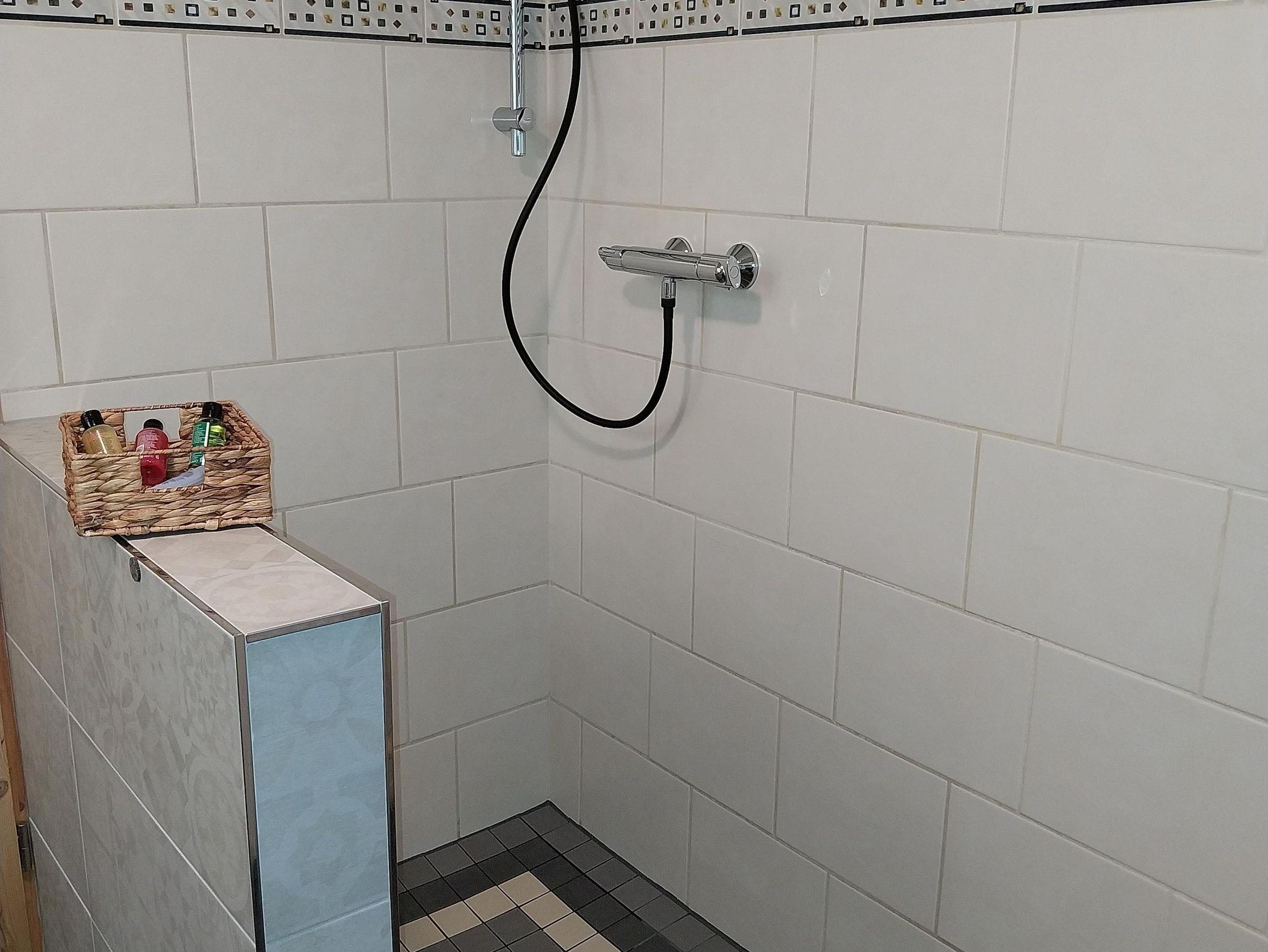 • Badezimmer mit Fenster, ebenerdiger Dusche, Föhn, Kosmetikspiegel, Toilettenpapier sowie einer Erstausstattung an Duschgel, Shampoo und Zahnpasta