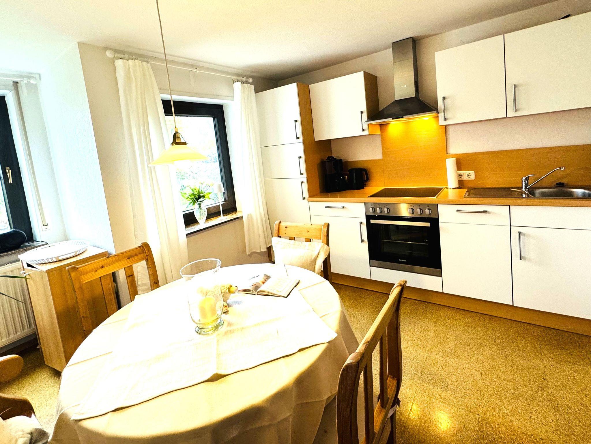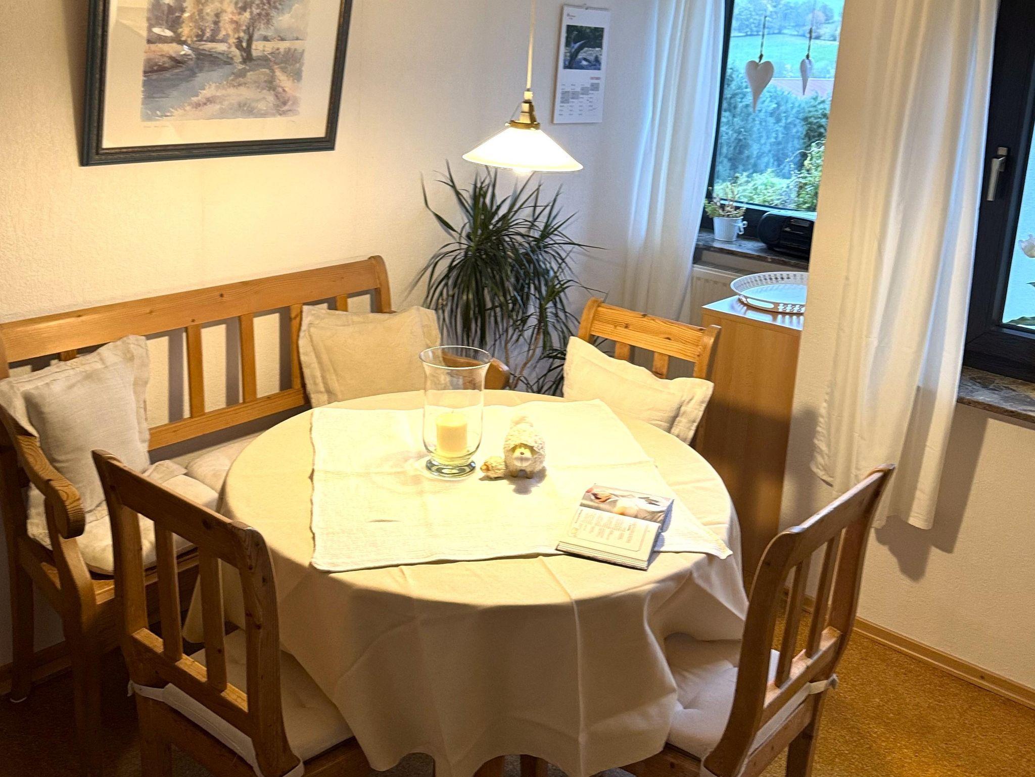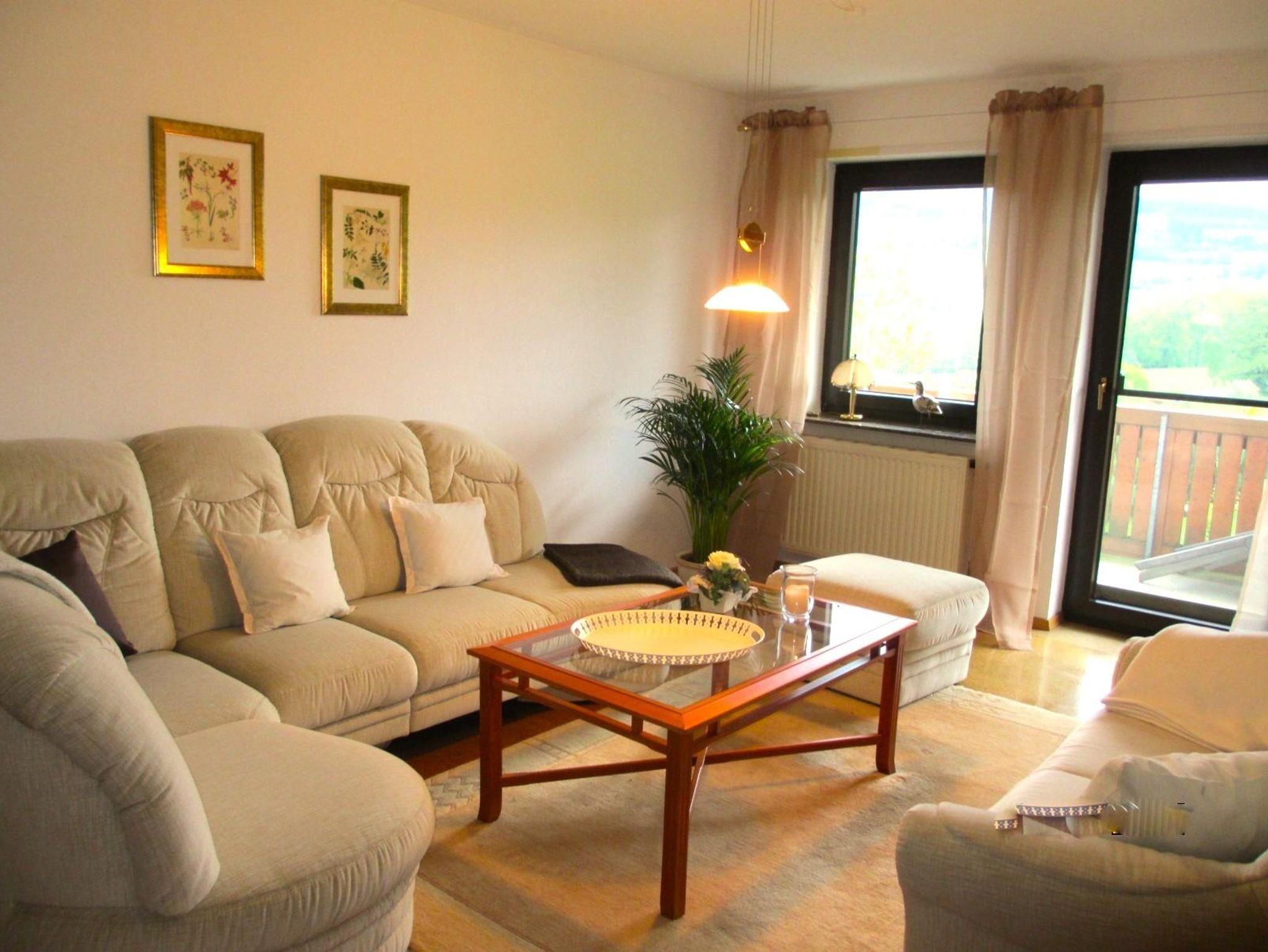 Schöne Ferienwohnung im 1. Stock mit 2 Balkonen und 2 Schlafzimmern. Gr. Wohnraum mit sehr bequemer Couchgarnitur und wunderbarem Blick in die Rhön. Schöne Wohnküche mit großzügiger Ausstattung ( Herd mit Ceranfeld, Geschirrspüler, Mikrowelle etc. ) hübscher Essplatz mit tollem Ausblick in die Natur. 2 Schlafzimmer mit sehr guten Matratzen und schönen Möbeln. Badezimmer mit Tageslicht und Dusche, gr. Waschtisch und Handtuchheizkörper für einen gemütlichen Aufenthalt. Geräumige Diele mit viel Stauraum, WLAN u. Telefon inkl.