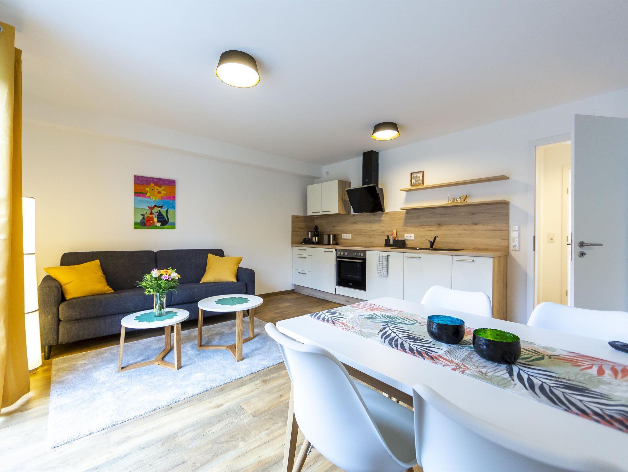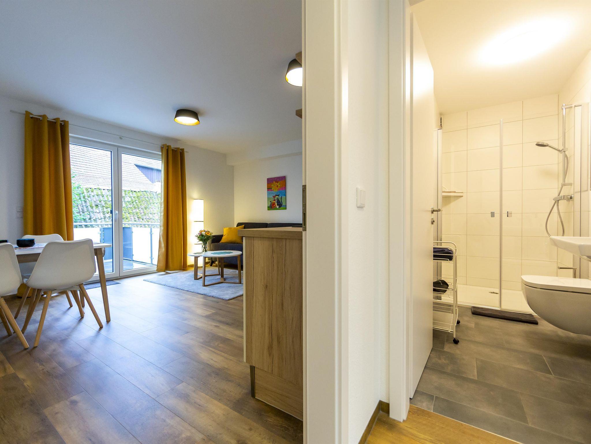 Willkommen in der gemütlichen 41 m² Unterkunft! Lichtdurchflutet, mit Blick auf Gärten und altes Backhaus. Einladendes Boxspringbett (2 Personen) und komfortables Schlafsofa (2 Personen). Badezimmer, gut ausgestattete Küche, Essbereich, Wohnzimmer mit 43-Zoll TV. Inklusive Herd, Spülmaschine, Kaffeemaschine (Pads & Filter), Wasserkocher, Toaster, Backofen, Geschirr für 6 Personen. Aufzug für Bequemlichkeit.