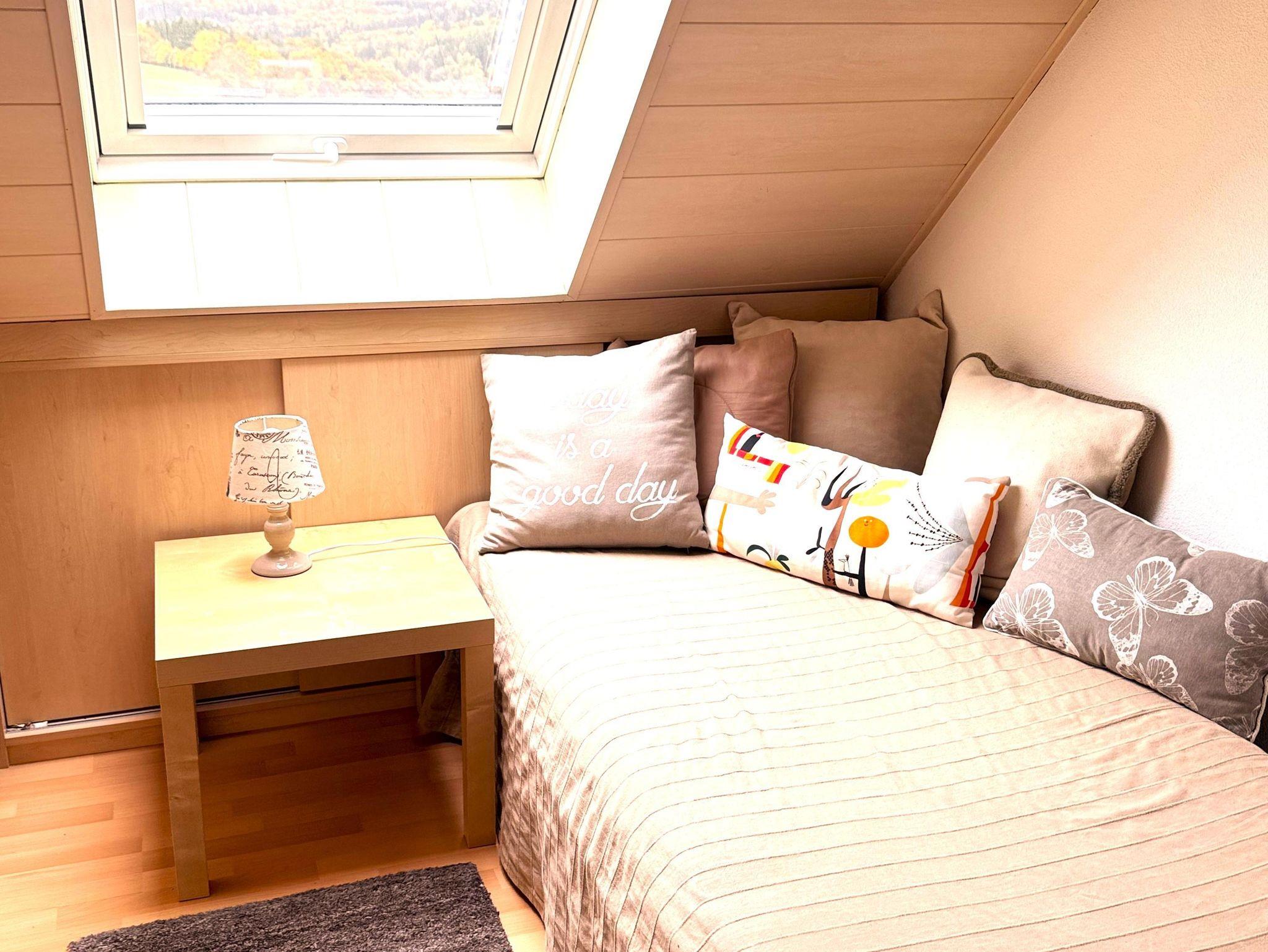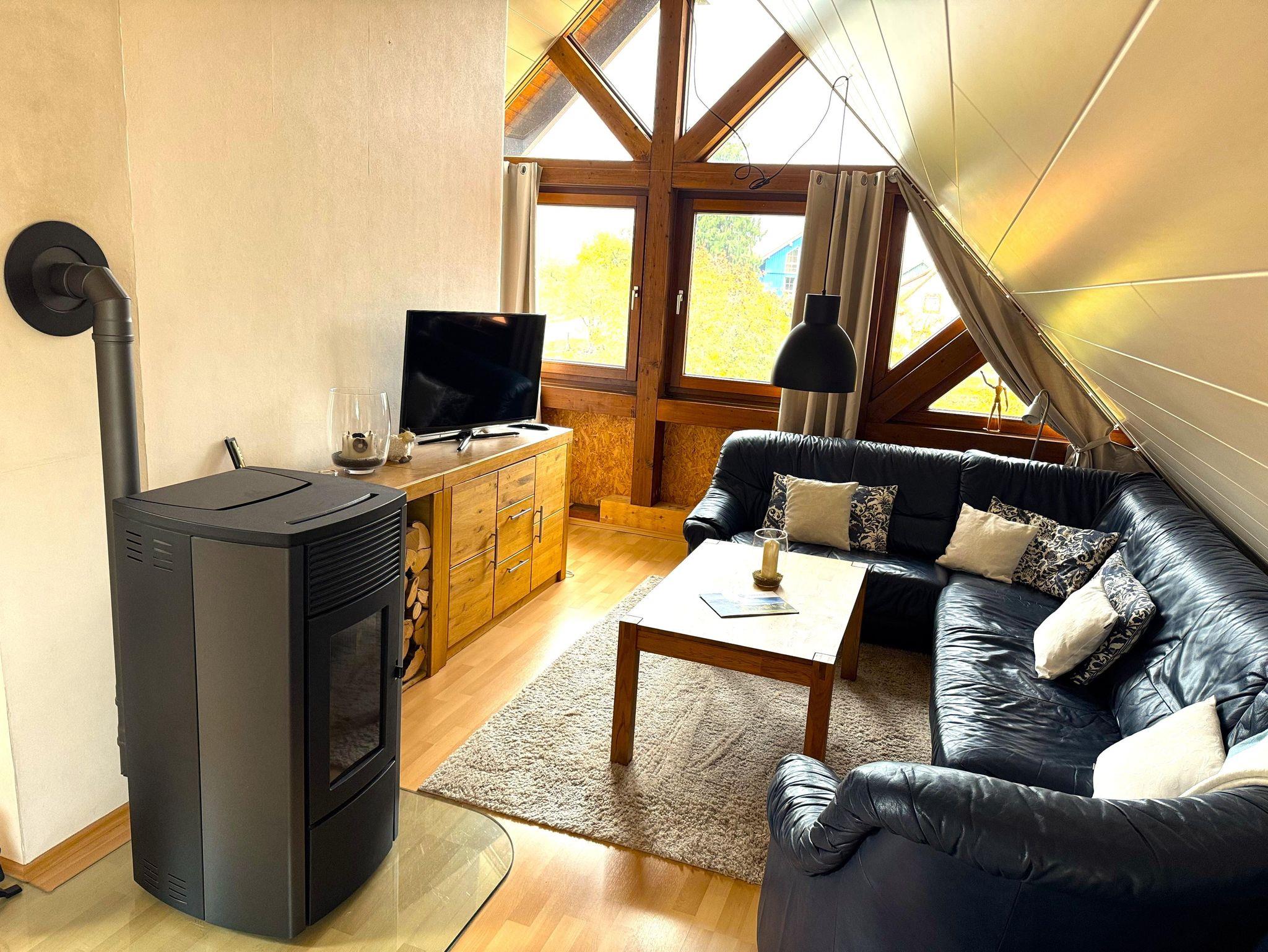 Geschmackvolle helle und freundliche Ferienwohnung (Studio) im 3. Stock unseres Hauses. Großer Wohnraum mit integr. Küche ( Herd m. Ceranfeld, Geschirrspüler etc.) und wunderschönem Essplatz mit Blick auf die Wasserkuppe. Gemütliche Ledercouch mit gr. SAT-TV und Pelletofen machen das Studio auch an kühlen Tagen sehr gemütlich. Schlafzimmer mit Doppelbett und Einzelbett ( für max. 3 Pers.) frz. Balkon und Dachfenster (alles mit Rollo ausgest.), genügend Stauraum für Sie. Schöne Dusche mit Tageslicht ( Dachfenster). WLAN und Telefon inkl.